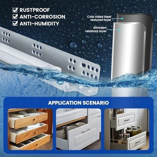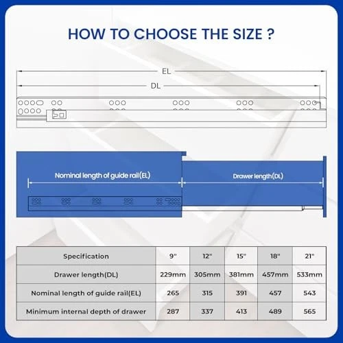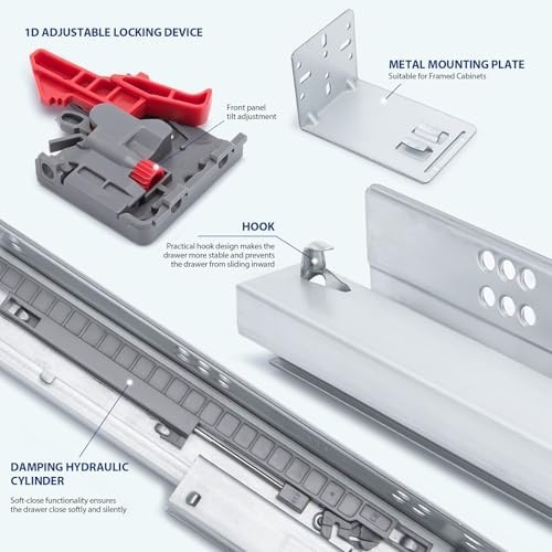 Soft Close Undermount Drawer Slides - 21 Inch Experience the Perfect Blend of Functionality and Elegance! Key Features: Soft Close & Full Extension: Enjoy a gentle, quiet closing with our hydraulic damper technology, creating a serene environment in your home. Durable Material: Crafted from high-quality galvanized steel, these heavy-duty slides can support up to 100 LB, ensuring long-lasting performance. Safe & Aesthetic Design: The concealed slide rail enhances the beauty of your furniture while improving safety by being positioned at the bottom of the drawer. Versatile Installation: Compatible with both panel (frameless) and face frame (framed) cabinets, making it easy to integrate into your existing setup. Package Includes: 1 pair (2 packs) of 21 inch undermount drawer slides Rear mounting brackets 1D adjustable locking device Mounting screws and detailed installation instructions Please Note: For optimal performance, refer to the size specifications in the product images before purchasing. Customer Satisfaction Guaranteed: Your satisfaction is our priority! If you encounter any quality issues with our drawer slides, please reach out to us for prompt assistance.