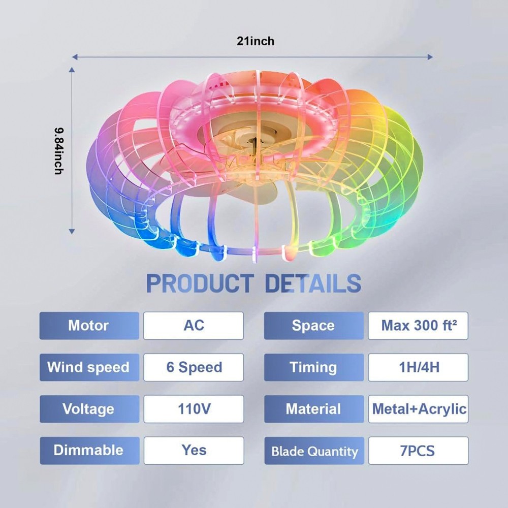 21" Low Profile Bladeless Ceiling Fan (White) – RGB Light + Bluetooth Speaker, 6-Speed Remote Reversible Fan for Kids Room/Party | 1-Year Warranty + 30-Day Free Returns Shop Risk-Free for Fun & Safe Comfort! We back this all-in-one bladeless ceiling fan with a 1-year warranty (covers dimmable LED, RGB light strip, Bluetooth speaker, reversible motor, remote control, and acrylic/PC structure) plus free returns within 30 days—if it fails to connect, lacks brightness, or doesn’t meet safety standards, send it back hassle-free. 5-in-1 Design: Fan + Light + Speaker + RGB + Dimmer (Perfect for American Modern Interiors) This 21-inch low-profile fan (21.00”L x 21.00”W, 5.28 lbs) blends American design with contemporary functionality, ideal for: Kids Rooms : Bladeless design eliminates pinch risks; soft RGB light protects eyes, making it a safe nightlight + cooling solution. Parties/Family Gatherings : RGB color modes + Bluetooth speaker set the mood—play music, podcasts, or party anthems without extra devices. Home Theaters/Game Rooms : Dimmable LED (10%-100% brightness) + warm/cool 色温 (3000K-6500K) adjusts to movie/game lighting needs. Bedrooms/Living Rooms : Low-profile design fits 8–10 ft ceilings; reversible motor works year-round (cool in summer, circulate warm air in winter). White acrylic + PC 材质搭配美式现代风格,无缝融入 farmhouse、简约、轻奢等装修,不破坏空间美感。 Key Features for Safety, Fun & Practicality ✅ Bladeless & RGB Light: Safe + Atmosphere-Ready No Exposed Blades : 100% safe for kids, pets, or curious hands—no risk of injury during play or cleaning. Soft RGB Color Modes : Acrylic light strip diffuses RGB 彩光 into gentle, eye-friendly glow (multiple modes: static, fade, flash). Perfect for bedtime stories, birthday parties, or cozy nights. ✅ Bluetooth Speaker (No APP Required) Pair your phone via Bluetooth in 3 seconds—no extra apps or subscriptions. Play kids’ songs, pop music, audiobooks, or white noise directly from the fan. Crisp sound fills small-to-medium rooms (up to 200 sq. ft), turning ordinary spaces into entertainment hubs. ✅ Dimmable LED with Memory Function Full Customization : 3000K (warm white) – 6500K (cool white) color temperature + 10%-100% brightness adjustment via remote. Switch from reading light to ambient glow effortlessly. Memory Feature : Saves your last light color, brightness, and fan speed settings—no re-adjusting every time you turn it on. ✅ 6-Speed Reversible Motor: All-Year Comfort 6 Wind Speeds : From gentle breeze (for napping) to powerful airflow (for hot summer days) – meet every cooling need. Reverse Rotation : Flips to upward airflow in winter, circulating warm air trapped near the ceiling—cuts heating costs and keeps rooms cozy. Quiet Operation : Motor runs at ≤35 decibels (quieter than a whisper), won’t disrupt sleep, movies, or conversations. ✅ Easy Installation & Durable Build Tool-Free Setup : Comes with detailed instructions, mounting bracket, and all hardware. Most users finish installation in 20–30 minutes—no electrician needed. Acrylic + PC Material : Stain-resistant, easy to wipe clean; durable enough for daily use in kids’ rooms or high-traffic areas. Specifications Category Details Product Type 5-in-1 Bladeless Ceiling Fan (Fan + RGB Light + Bluetooth Speaker + Dimmable LED + Remote) Material Acrylic (Light Shade) + PC (Housing) Color White Style American Design, Contemporary, Modern Product Dimensions 21.00” (L) x 21.00” (W) Product Weight 5.28 LBS Package Dimensions 13.40” (L) x 13.40” (W) x 7.10” (H) Package Weight 6.60 LBS Speed Settings 6 Adjustable Speeds LED Features Dimmable (10%-100%), Color Temperature 3000K-6500K, Built-in RGB Light Strip Bluetooth Function 免 APP 连接 (No APP Required), Compatible with All Bluetooth Devices Control Remote Control (Fan Speed + Light + RGB + Speaker + Dimmer) Ideal Use Kids Rooms, Bedrooms, Parties, Home Theaters, Game Rooms Warranty 1-Year (LED, RGB light, speaker, motor, remote, structure) What’s Included 1 x 21” Low Profile Bladeless Ceiling Fan (White) 1 x Remote Control (with batteries) 1 x Mounting Bracket + Installation Hardware (screws, anchors) 1 x Step-by-Step Instruction Manual Important Notes No Extra Bulbs Needed : Built-in dimmable LED + RGB light strip (pre-installed, no need to purchase additional bulbs). Bluetooth Connection : Pair directly with your phone/tablet—supports all Bluetooth-enabled devices (iOS/Android). Ceiling Requirement : Fits 8–10 ft ceilings; ceiling must support at least 10 lbs (fan + installation hardware weight). This bladeless ceiling fan isn’t just an appliance—it’s a entertainment hub + safety-focused cooling solution. With its RGB light, Bluetooth speaker, and all-year functionality, it turns kids’ rooms into playspaces, parties into memorable events, and bedrooms into cozy retreats. And with our warranty, you can enjoy peace of mind—upgrade your home with fun and comfort today!