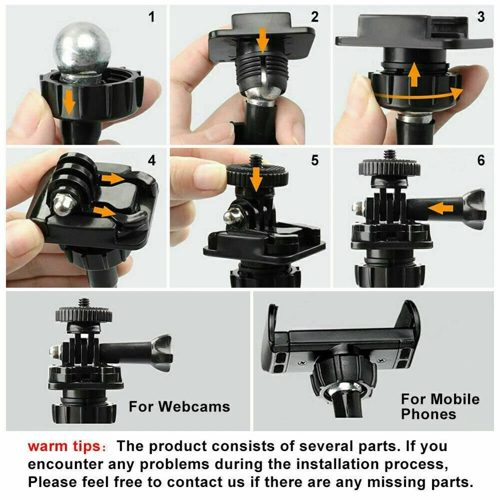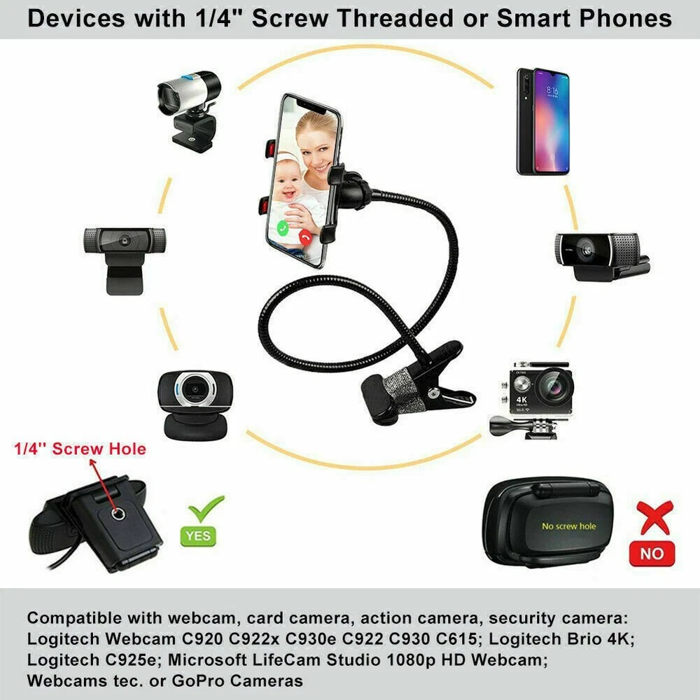 Meinuousa Your Best Online Business Partner 21 inch Flexible Webcam Stand Gooseneck Mount Stand + Mini Tripod For Cell Phone 21inch The webcam stand and phone holder About this item Made of high quality metal, strong and durable enough for long time daily use. Maximum thickness that can be clamped:2.3inch You can swivel and bend it any way you like and be confident it will remain in position. The jaw of the clamp features a soft cushion that will help protect item surfaces. The jaw of the clamp fit the Desk,Table,Sideboard,Bed Max thickness 6.8cm(2.7inch) 360° rotatable head design allows you to take pictures from different directions. 【For Working or Studying Time】 The height of this bracket can meet your multi-purpose needs The package contains some small parts. Whether you prefer live-stream on your phone or with webcam, the phone and webcam stand can meet your needs to use different equipment. 【Free your hands】The gooseneck bracket is portable, flexible and adjustable. Whether you are at home/office/school/outdoor/traveling/sports/, you can use the bracket to fix camera and mobile phone, so that it can help you capture photos or videos. 【With webcam】Compatible with webcam ,card camera,action camera,security camera. Compatible with webcam C920 C922x C930e C922 C930 C615, Brio 4K, and Microsoft Lifecam studio 1080p Hdwebcam,webcams tec. Or GoPro cameras,compact cameras.for the iphone and Android phone,Not for heavy camera and devices. Package: 1x Webcam Stand Holder 1x Lightweight Mini Tripod Payment Shipping Returns Contact Us About US - We accept the payment through :Credit, debit, and gift cards, Apple Pay, Google Pay, PayPal, and PayPal Credit. - Payment must be fulfilled within 4 days after the end of auction. - Please make sure your ebay address is correct. Or not, please correct it before payment. - If you are a big customer, Please contact with us about the item's PRICE and SHIPPING. - Your feedback & suggestion is deeply appreciated, thanks. 1. Please make sure your address in ebay is correct. 2. We will only follow your address listed in the ebay orders for the shipment. 1. We can exchange the item within 30 days after you received it if it is defective. 2. Returned item must have all original packaging and accessories. 3. Buyer are responsible for the returning shipping costs. 1. We greatly appreciate your POSITIVE feedback. 2. Negative or Neutral feedback does not resolve any underlying issues that you may be experiencing as a buyer. 3. Any question or unsatisfaction please contact us with ebay message, we will sincerely solve for you. Feedback is very important to us, if you are satisfied with us, please leave us 5 star positive feedback to us. If you h have any problem, please contact us first BEFORE you give us neutral or negative feedback, so we can try our best to help you solve your problem. All rights reserved.
