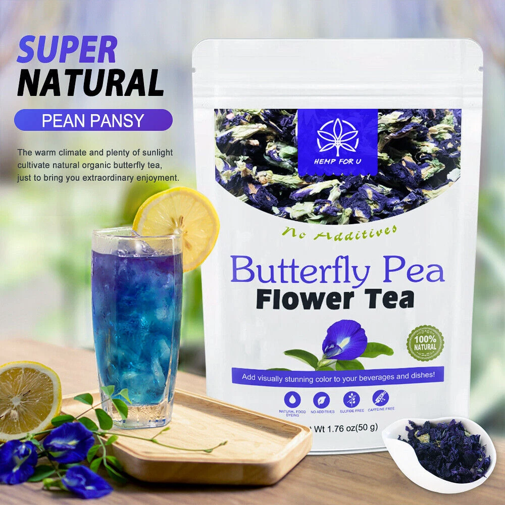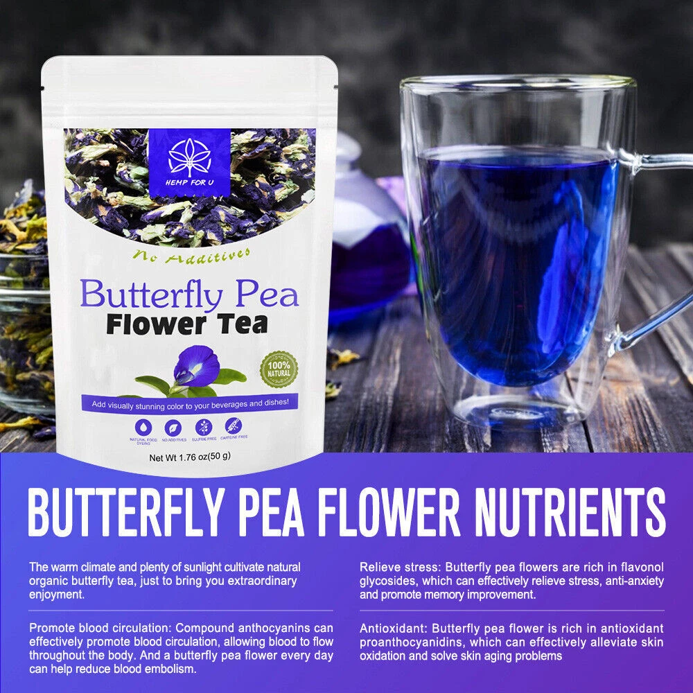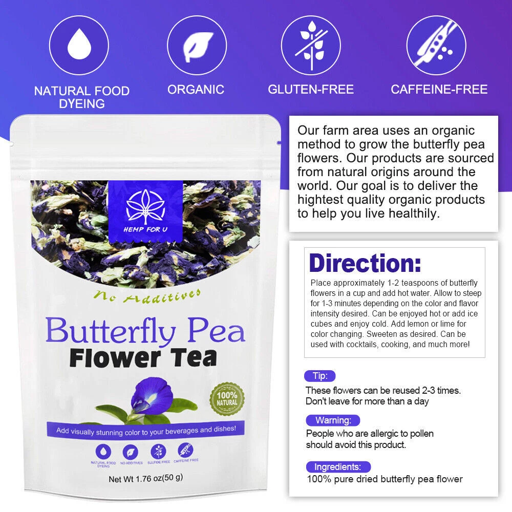 ☑ If you not received the package in shipping time, please email us, Instead of directly opening the item Not Received requestThanks for your understanding .we will definitely help you solve the problem ^ ^ Specification: Brand:Hemp for U Quantity:100g Tea *2 Shelf Life:2 years Item Type:Butterfly Pea Flower Tea Storage: Store tightly closed,in a cool,dry place away from heat and light.Keep out of the reach of children. --------------------------------------------------------------------------------------------------------------------------------------------------------------- About the item About the item: 1.Butterfly pea flower is rich in vitamins A, C and E, which can improve immunity, help and promote skin elasticity and collagen. It also has natural health functions such as brain augmentation, promoting brain vitality, preventing abdominal pain, anti-depression, anti-stress, calming, anti-convulsion, and relaxing emotions. 2.The natural blue color in butterfly pea flowers is also very effective. If it is added to lemon to make a fragrant tea drink, it is a great cardio beverage. Edible value The edible parts of butterfly pea flowers are leaves, flowers and soft grains. Young leaves and blooming flowers can also be used for soup and deep frying. Delicious when fried or cooked with sprouts. Butterfly pea flower leaves and flower sap can be used as natural food dyes. The effect of Zigen: It can cure eye diseases, chronic bronchitis, analgesia, diuresis, menstruation, constipation, ascites, arthralgia. It is used as an insecticide, laxative, diuretic and sedative in medicine. Features: -Our butterfly pea flowers grow in nature and they are 100% organic. -This loose herbal tea is made from the dried organic flowers of the blue butterfly pea, which turn blue when you inject it. -These flowers grow in nature with zero chemicals and pesticides, so they are purely natural, organic and completely healthy for you and your loved ones. -Each flower is carefully selected by experienced farmers and carefully dried. The benefits of butterfly beans: 1. Reduce the risk of blood clots. 2. Help the body's immunity. 3. Maintain the brain and increase blood flow. 4. Improve vision. 5. Prevent hair loss. 6. Delay aging. 7. Used as an ingredient in food or desserts. How to prepare: 1. Place the dried pea flowers (4-5 flowers) in a cup of hot water. 2. Wait 3-5 minutes and you will get blue water. 3. If you like the sour taste, add a drop of lemon juice (The water will change from blue to purple) 4. If you like sweetness- add sugar or honey to get better taste. (Cold drink: add ice according to personal taste) 5. Hot drinks: such as tea Package: 2*100g Blue Butterfly Pea Flower --------------------------------------------------------------------------------------------------------------------------------------------------------------- Note -- About the color:due to the different light and monitors, the real color might be a little different from the pictures. -- About the size:manual measurement, errors cannot be avoided. -- Other things in the pictures are not included. -- These statements have not been evaluated by the Food and Drug Administration. This product is not intended to diagnose, treat, cure or prevent any disease. -- Before purchasing this product, please check whether you are allergic to the ingredients of the product. If you have allergic symptoms, please stop using this product. --------------------------------------------------------------------------------------------------------------------------------------------------------------- After-sales service ☆ Our purpose is to provide quality services to buyers, if you have any questions, please contact us! ☆ If you are satisfied after receiving the product, hope you willing leave us a positive feedback . ☆ If there are any problems with the product or you have any confused, please contact us first , we will reply to your message as soon as possible, and do our best to solve the problem for you. (Non-working day messages may be replying a bit slow, please understand!) --------------------------------------------------------------------------------------------------------------------------------------------------------------- Payment ►Payment is needed to receive within 5 days after deal.If not we will close the transaction. ► We only accept PayPal . ► Please make sure you have a valid/confirmed PayPal account prior bidding. And please make sure that your PayPal registed address is the same with your eBay registed address. ► Import duties, taxes and charges are not included in the item price or shipping and handling. These charges are the buyer’s responsibility. --------------------------------------------------------------------------------------------------------------------------------------------------------------- Shipping ☆ We will arrange shipping for you within 24-48 Hours after payment cleared except the holidays . ☆ We always send the item to the address you give us on PAYPAL . If you have changed your address, or want us to ship to another address, please change to the new address when you pay us with PAYPAL, otherwise we will not be responsible if the package is lost. ☆ We hope it arrive on time. Sometimes,shipping time will be delayed by the courier company as for bad whether or othersituation. ☆ Sellers are not responsible for service transit time. Transit times are provided by the carrier, exclude weekends and holidays, and may vary with package origin and destination, particularly during peak periods. Thank you for your understanding :) --------------------------------------------------------------------------------------------------------------------------------------------------------------- Returns Policy ★Note: Please contact us via ebay message before starting a return request, we will deal with your issue quickly and efficiently. ☆ Items can be returned for exchange or full refund within 5 day