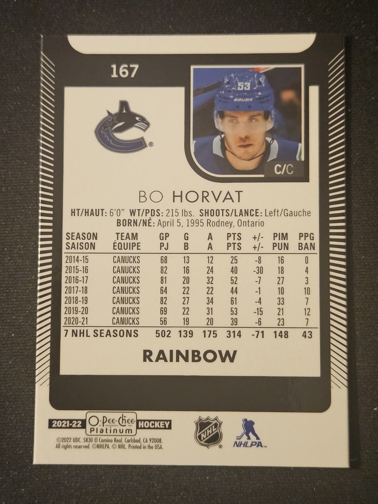 Season:21-22Card Name:Bo HorvatTeam:Vancouver CanucksCard Number:167Player/Athlete:Bo HorvatFeatures:Rainbow VariantType:Sports Trading CardManufacturer:Upper DeckParallel/Variety:RainbowAutographed:NoLeague:National Hockey League (NHL)Set:2021-22 O-Pee-Chee PlatinumCountry/Region of Manufacture:United StatesSport:Ice Hockey