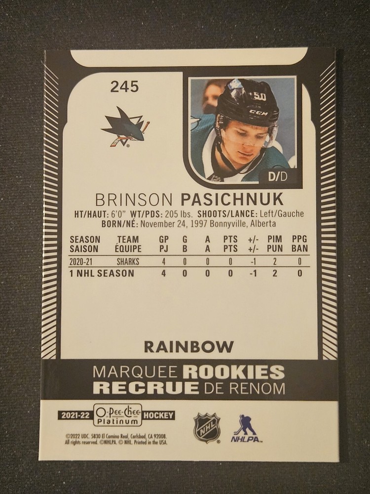 Parallel/Variety: Rainbow Manufacturer: Upper Deck Type: Sports Trading Card Set: 2021-22 O-Pee-Chee Platinum Season: 21-22 Features: Rookie, Rainbow Variant Player/Athlete: Brinson Pasichnuk Autographed: No Sport: Ice Hockey Card Name: Brinson Pasichnuk Marquee Rookie League: National Hockey League (NHL) Card Number: 245 Team: San Jose Sharks