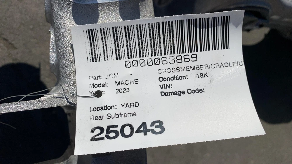 Donut Auto Dismantling Donut Auto Dismantling Rancho Cordova, CA Business Hours (PST/PDT) Mon - Fri 8am - 5pm Closed Sat & Sun Crossmember/cradle/undercarria Year: 23 Model: MUSTANG MACH E Side: Type: Used Category: ND Condition: 18k Vehicle Stock #: 25043 Part Stock #: 0000063869 Additional notes: 2021-2024 Ford Mustang Mach-e Awd Rear Subframe Suspension Crossmember K-frame Lj9c5k067ac Interchange: Also fits: Search for more parts from this donor vehicle Search for more parts for MUSTANG MACH E Dear Valued Customers Before ordering, please verify the part number and compare the physical details of your part with the photos in our listing. Tesla sometimes changes parts within the same model year, so even if the year matches, variations may exist. Examine all photos and read the description. Please contact us and ask any questions you have about the item. What you see in the pictures is what you will receive. Item are sold as Pictured in our ads, All the damages are marked in pictures with colored markings ........ indicated scratches, O indicate dents/dings view all photos and description. All Parts come with a 60-Day warranty Compatibility We are not responsible for compatibility, please order parts with the same part number to avoid delays and fitment issues in your purchase. Always verify O.E.M part numbers check fitment. Shipping & Return Policy For LTL and freight shipments: Please inspect an item before signing. For LTL and freight shipments of large items like Battery Packs, Seats, Doors, Trunks, Hoods, and other sizable body parts, a commercial address is mandatory . This must be a business equipped with a dock or forklift. Please note that deliveries cannot be made to restaurants, office buildings, or hotels. Please allow 5-11 business days from the shipping date to receive freight items. If a forklift is not available to unload your package, please ensure that you added liftgate service fee to your order. Residential deliveries have an extra charge required by LTL to cover liftgate usage and city ordinance. Be advised not all LTL freight companies offer lift gate services in every town especially in rural areas. If you do not have a commercial address or a proper residential address reach out to us to work things out LTL items can always be held at your local hub and made available for pickup. We offer free local pickup Monday through Friday, from 8:00 AM to 5:00 PM. What separates us from our competitors As Pioneers in the Tesla used parts market Donut Auto Parts is leading in the industry. We have been specializing in Tesla's for over 5 years. Our Staff are highly trained and experienced Tesla specialists. We strive to help you solve all your part needs. Local Customers For our local customers we provide installation on battery packs and drive units purchase. Drive unit and battery pack installations come with a 60 day warranty . All parts are fully tested. Using the industries leading tools, we also provide installation of other parts. Please reach out to us directly for more information. Be Advised Programming may be required for most electronic components. Donut Auto Parts is not responsible for any labor costs and other charges such as programming. NO RESTOCKING FEE Payment Payment must be submitted within 48 hours after purchase time. We have a Same handling time when paid by 2pm pst and 3-day handling time for LTL freight items. Feedback and Rating We always Strive to earn positive feedback. If you encounter an issue with one of our items, please contact us before leaving any feedback or opening a case give us the opportunity to solve your order issue. We strive to provide excellent customer service to ensure that everyone is satisfied, and to gain happy and returning customers! ALLOW US TO RESOLVE ISSUES BEFORE LEAVING YOUR FEEDBACK PLEASE CONTACT US FIRST Airbag Notification If the item above is an airbag, I certify this airbag is not subject to recall and will be shipped in accordance with hazmat shipping requirements . Powered by Checkmate