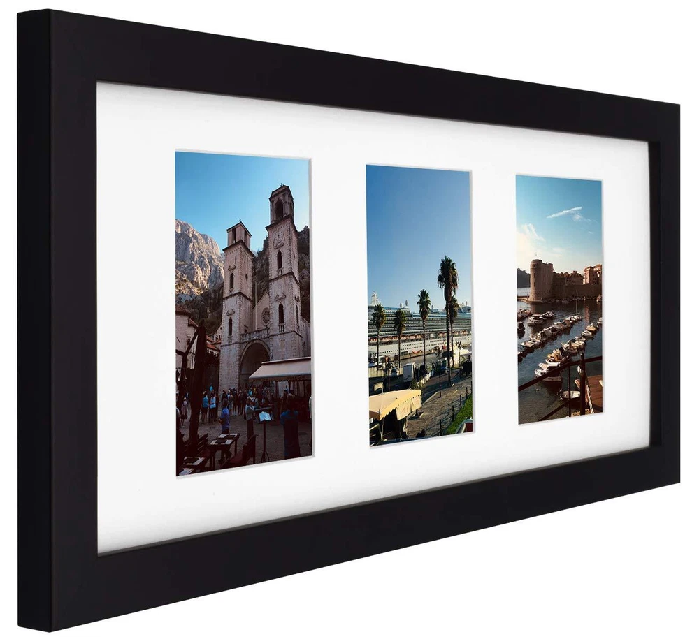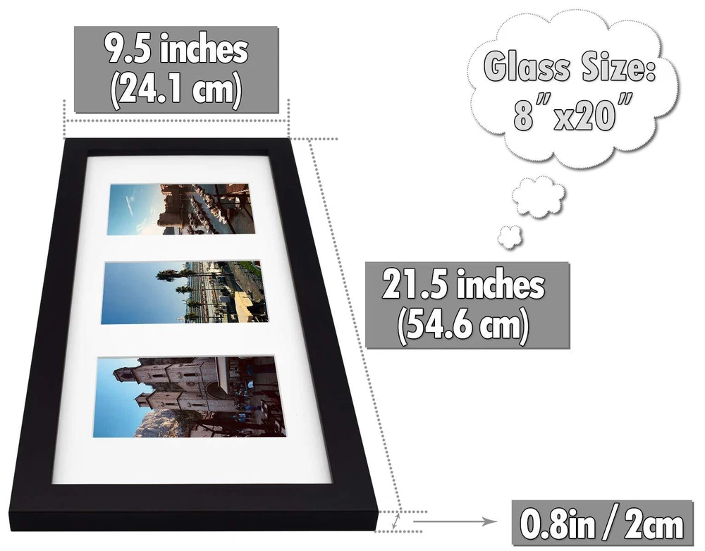 Contain 8x20 Black Wood Frame with a white mat for (3) 4x6 photos. The Mat has three openings. Each Opening Size is 3.5 x 5.5 inches. Contains Real Glass and Wood. Wood Frame Size: 21.75x9.75 Inches. Black Frame Color Real Glass and Wood Includes: White Mat with Three Openings For (3) 4x6 Pictures (Each Opening Size: 3.5x5.5 Inches) Come with 3 Hangers: 1 Vertical & 2 Horizontal Perfect Designed: Bevel Cut Mat with White Core and 4-Ply Thick About 1.4 Mm or 1/16 Inch One-Inch Frame Wide and 0.75-Inch Thick Molding, Hangs Vertically or Horizontally Ensure To Keep Your Package Safe, We Help You To Keep Your Artful Print, Your Memories. Feel Free To Add To Your Shopping Cart Today!