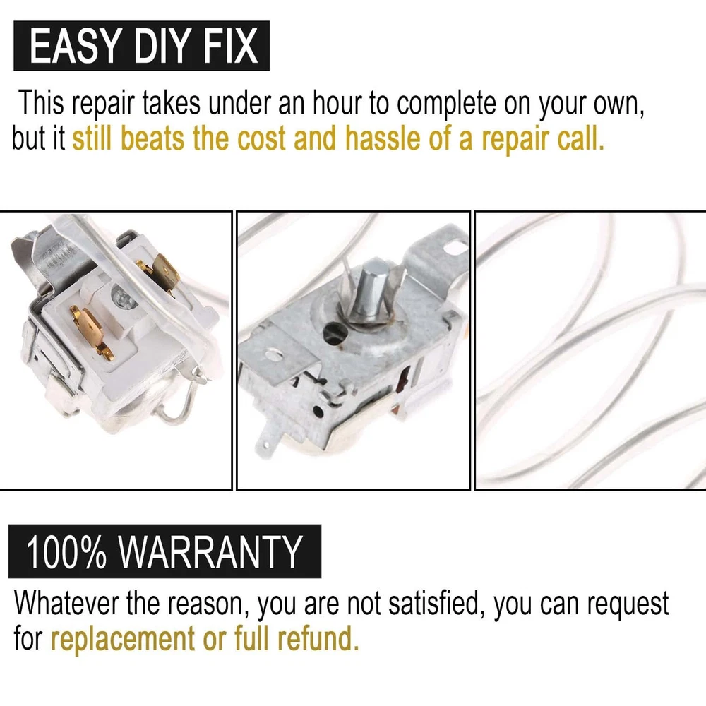The 2198202 Refrigerator Cold Control is used in refrigerator units and freezers as a sensor. The thermostat senses the temperature increase in the evaporator during the cycle of defrosting and turns off when ice is melted. The tools needed for this repair project is a putty knife, Phillips and flat blade screw driver, 1/4 inch nut driver, and needle nose pliers. Remember to unplug refrigerator from power source as a safety precaution. Replaces part numbers: PS11739232, WP2198202VP, WP2198202, AP6006166, 1110552, 1115242, 1115243, 1115244, 1115245, 1129437, 2161283, 2161284, 2169112, 2169113, 2198201, 99989726, PS329884, AP3037004, etc. Works with most top name brands: Whirlpool, Kenmore, Sears, Roper, Estate, Crosley, Inglis, KitchenAid, Maytag, Amana. Works with the following models: 2VED27TKN00, 3ED22DQXAN00, 3ED22DQXBW03, 3ED22DQXDN03, 3ED22RQXXW00, 3ED25DQXDN00, 3ED27DQXBW00, 3KART700GW01, 3VED23DQEW0... 106.52574200, 106.55122700, 106.58289990, 106.5858782, 106.59512290, 106.5951799, 106.59782290, 106.85500510, 106.8590293, 106.859472, 106.94000080… Fixes the following symptoms: Will Not Start. Fridge too warm Freezer section too warm Fridge too cold Please reach out to us if you have a question about compatibility. Comment below in the customer questions and answer section or send us a message on the storefront. We’re happy to help ensure you select the right part number for your Refrigerator MODEL NUMBER: 2198202 Refrigerator Cold Control Thermostat EASY TO INSTALL: Brand new refrigerator temperature control replaces Whirlpool, Kenmore, Roper, Estate, Crosley, Amana, Inglis REPLACES PART NUMBER: 1110552, 1115242, 1115243, 1115244, 1115245, 1129437, 2161283, 2161284, 2169112, 2169113, 2198201, 99989726, WP2198202, WP2198202VP, PS11739232, AP6006166.. Works with the following models: Whirlpool - 2VED27TKN00, 3ED22DQXAN00, 3ED22DQXBW03, 3ED22DQXDN03...Kenmore0,0,0,,0... EASY TO INSTALL: Forget the repairman. Remove and replace the cold control thermostat in under an hour. You just need a Philips screwdriver, quarter-inch nut driver, and a small flathead screwdriver. π—–π—’π—‘π—™π—œπ——π—˜π—‘π—§ 𝗣𝗨π—₯π—–π—›π—”π—¦π—˜π—¦: Enjoy a 30-day return window on your purchase. Your satisfaction is our priority. If you have any questions, please don't hesitate to our team.