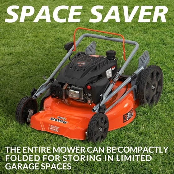 The YARDMAX 21” 3-in-1 push mower is perfect for the homeowner that wants a mower with all the features and is easy to use, but doesn’t mind pushing. The 170cc OHV Yardmax engine delivers maximum performance in this class of mower. The YG1650 features a high-rear-wheel design, and all wheels are equipped with durable 1.5” wide treads and with double ball bearings, all of which makes for easier pushing and for even cuts. Cut your lawn to your specifications by using a single convenient lever to select one of seven cutting heights, from 1.25” to 3.75”. The MaxFlow™ volute deck is designed to keep grass clippings airborne longer for superior mulching, or for flowing into the rear bag when needed. The entire mower can be compactly folded for stowing in tight garage spaces. Only limited assembly required. Key Features: Single-lever deck adjustment for quickly setting your mow height MAXFlow™ Deck Technology – volute spiral deck design for better airflow and mulching Seven cutting heights from 1.25″ to 3.75″ 21″ cutting blade lets you cut a wide area of lawn with each pass Large rear bag capacity Folds for space-saving storage Double-ball-bearing wheels for easy, smooth mowing with less pushing effort Heavy-duty, 16-guage stamped steel deck Durable, one-piece seamless steel deck reduces vibration Choose side discharge, mulching, or rear bagging 7″ front & 11″ rear wheels for stability and control Adjustable, durable 3-position handle height Specifications: Carton Size (L x W x H): 31.5″ x 24.1″ x 16.2″ Blade Length: 21″ Cutting Width: 21″ Mower Deck Width: 21″″ Front Wheel Size: 7″ Rear Wheel Size: 11″ Rear Wheel Height: High Wheel Wheel Width: 1.58″ Double Ball Bearing: Yes Wheels: Yes Assembled Required: Yes Power Type: Gas Engine Displacement: 170cc Engine Make: OEM Branded Engine Torque (ft.-lb.): 6.50 ft-lb Start Type: Pull Cord Fuel Tank Capacity (gallons): 0.21 gal Oil Capacity (oz.): 16.9 oz Recommended Oil Type: SAE 10W-30 CA (CARB) Compliant: Yes Walk Behind Mower Type: Manual Push Recommended Terrain: Flat, Sloped Size of Yard: 1/4 – 1/2 Acre Cutting Option: Bag, Mulch, Side-Discharge Mower Size Type: Standard Number of Blades: 1 Cutting Height Options: 7-position Deck Material: 16 Gauge Deck Type: Stamped Maximum Cutting Height: 3.75″Minimum Cutting Height: 1.25″ Number of Handlebar Positions: 3 Rear Bag Capacity: 1.88 bushel″