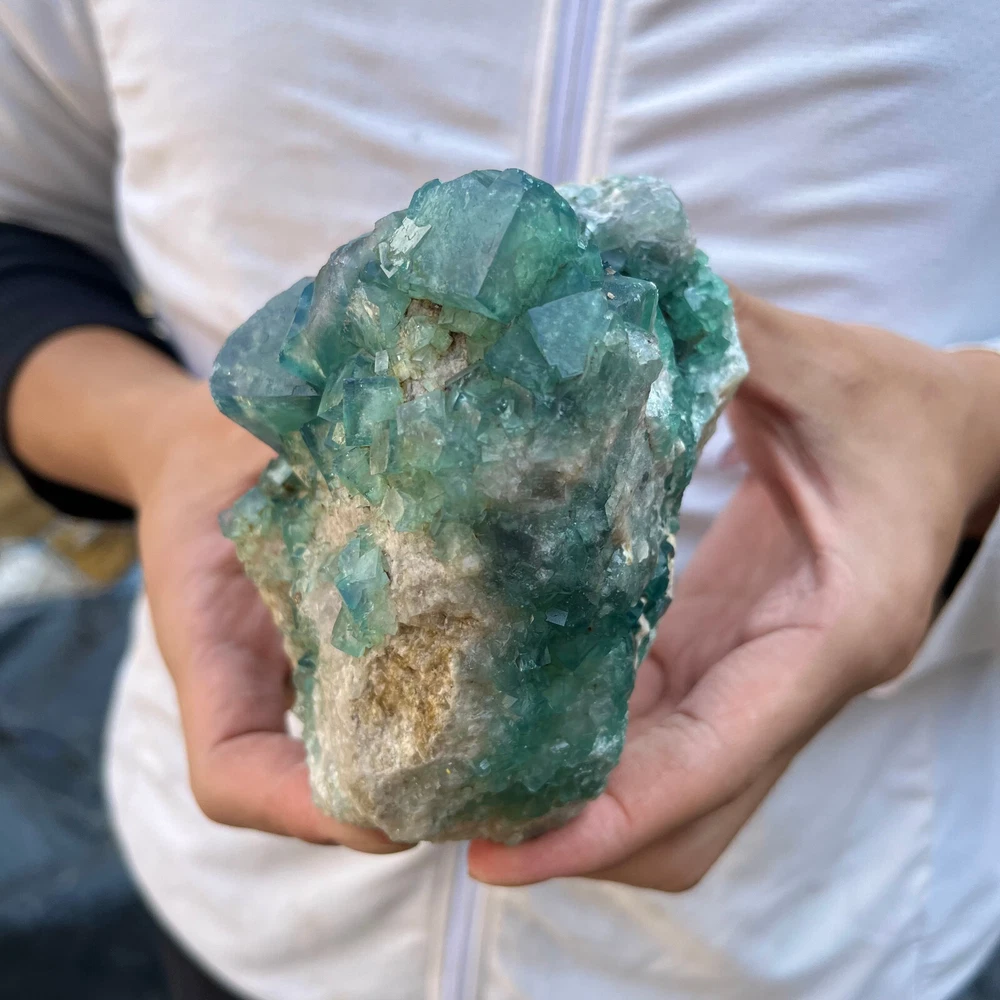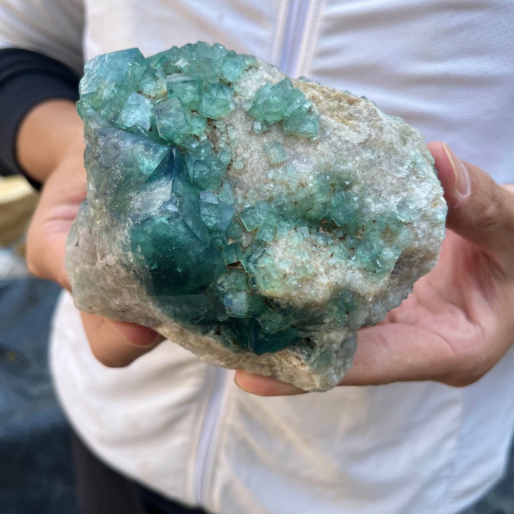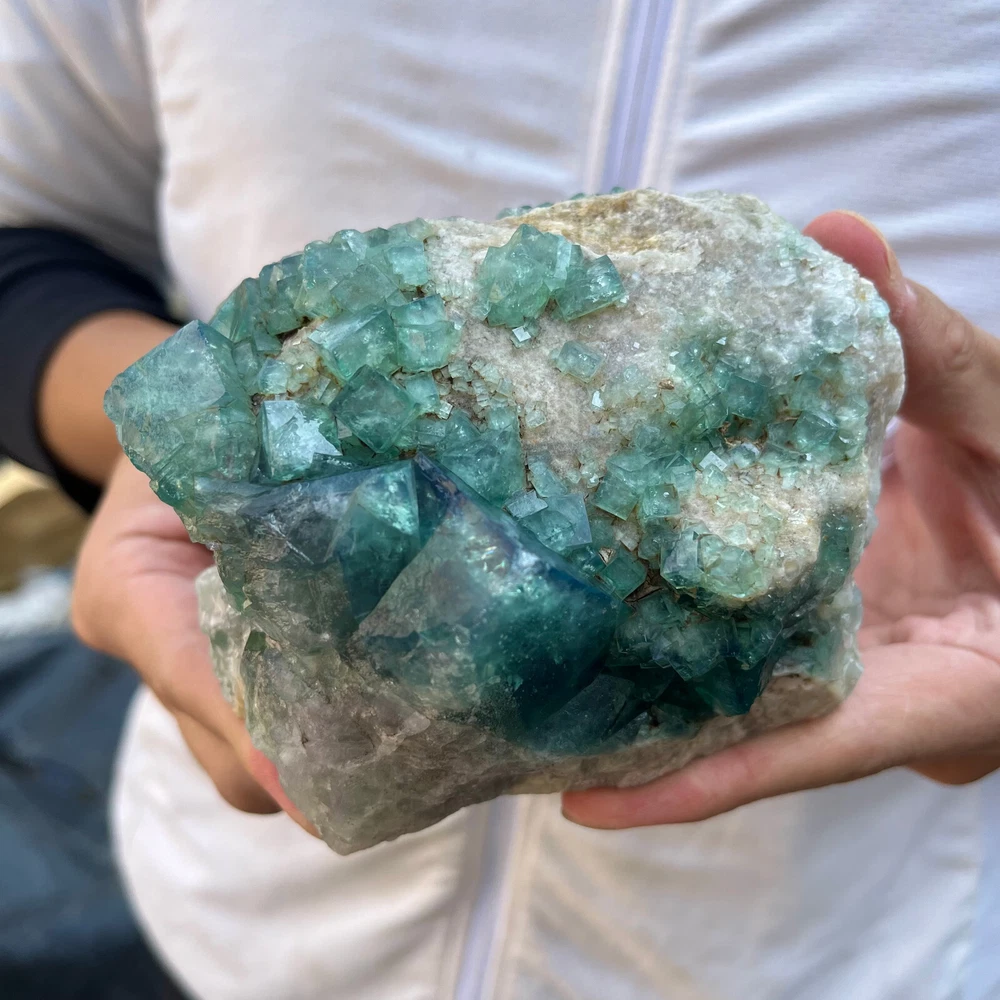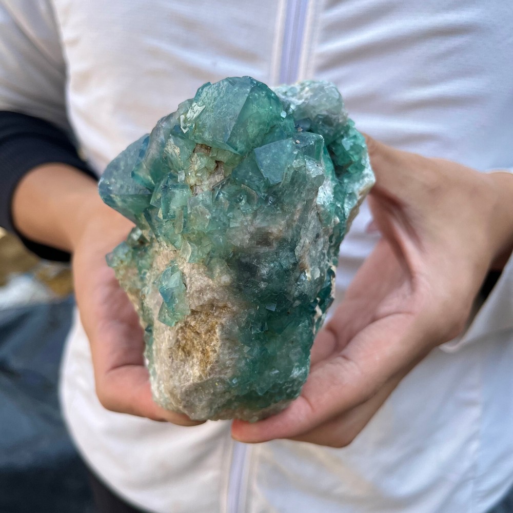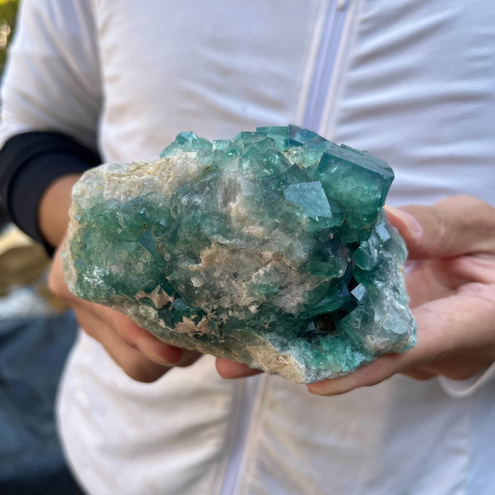 Amazing blue green hues in the fluorite. Item got here super quickly and it was wrapped completely in bubble wrap and tape. It looks exactly like the picture. It’s a solid chonk of a rock with interesting white flecks of crystal on the bottom. A+ transaction!!!