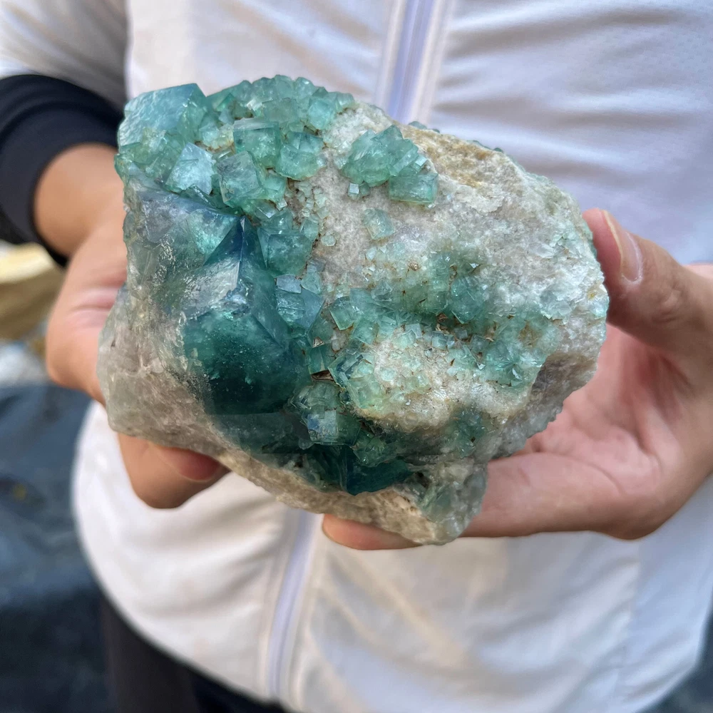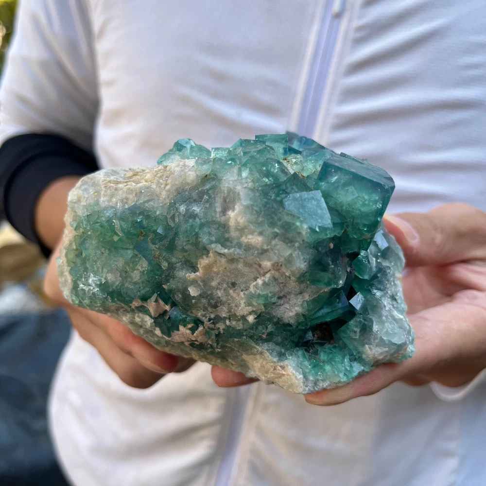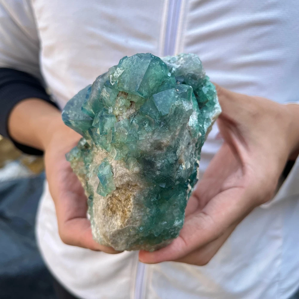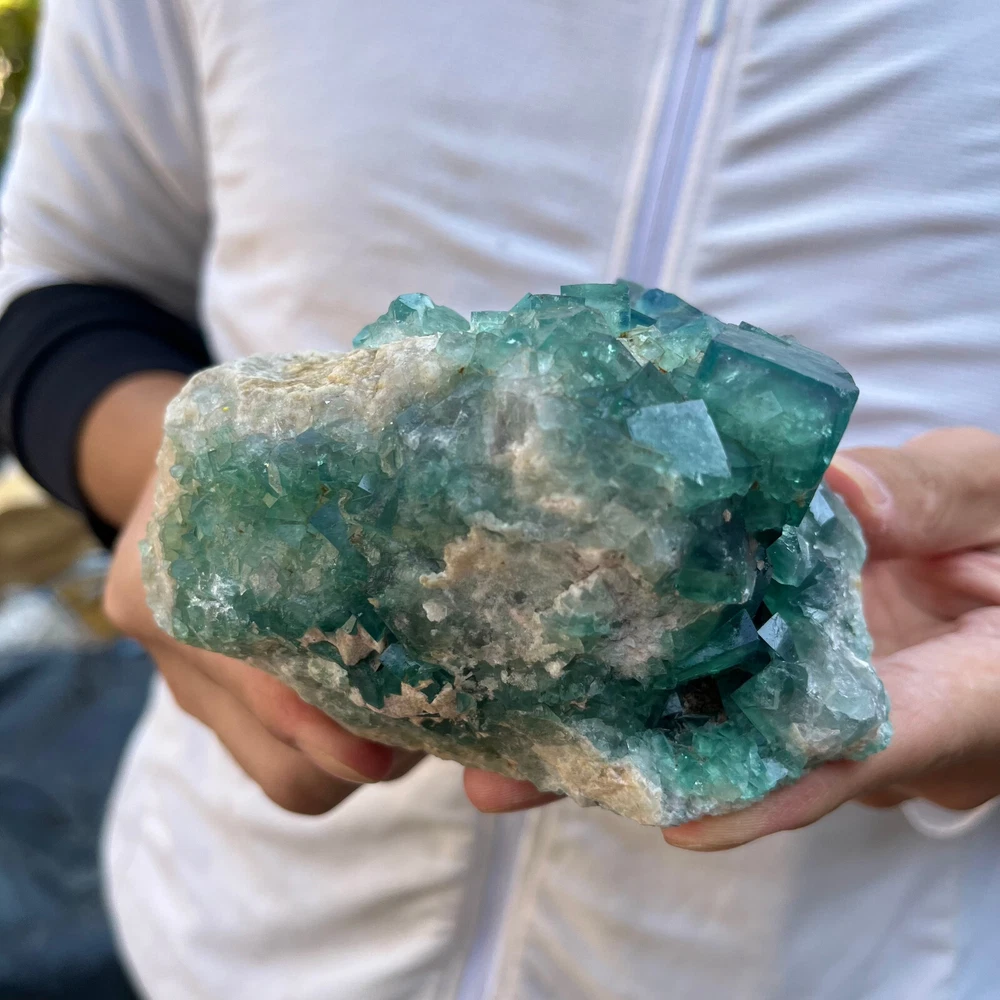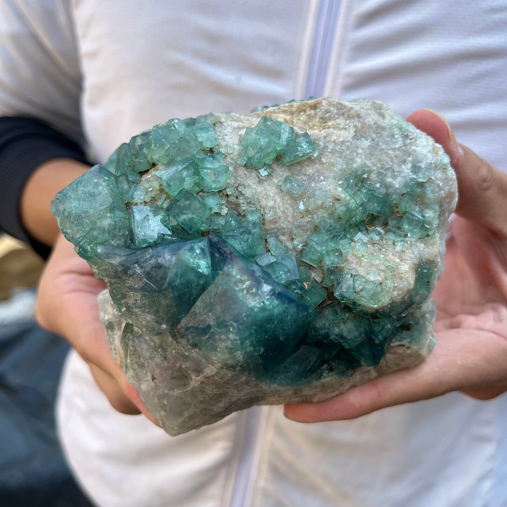 Amazing blue green hues in the fluorite. Item got here super quickly and it was wrapped completely in bubble wrap and tape. It looks exactly like the picture. It’s a solid chonk of a rock with interesting white flecks of crystal on the bottom. A+ transaction!!!