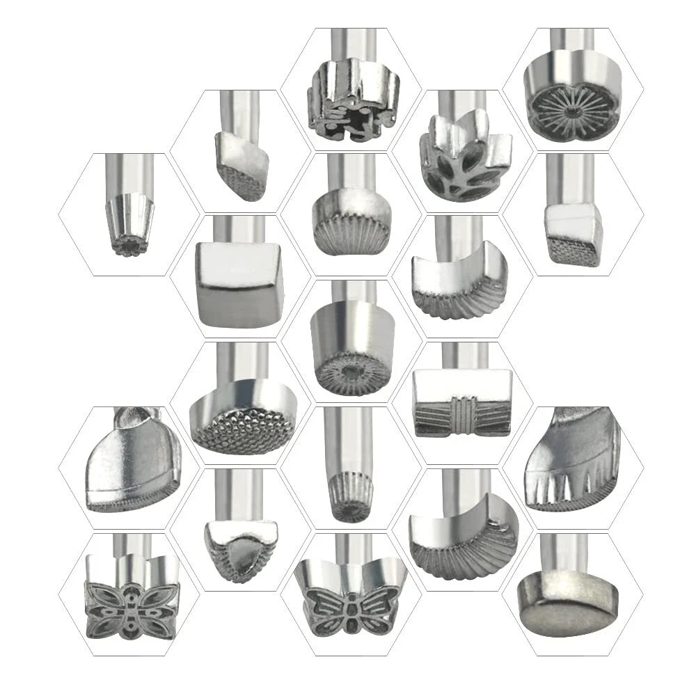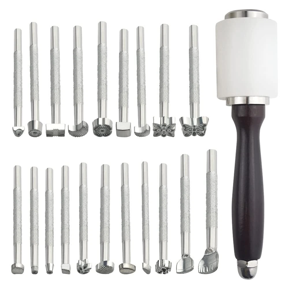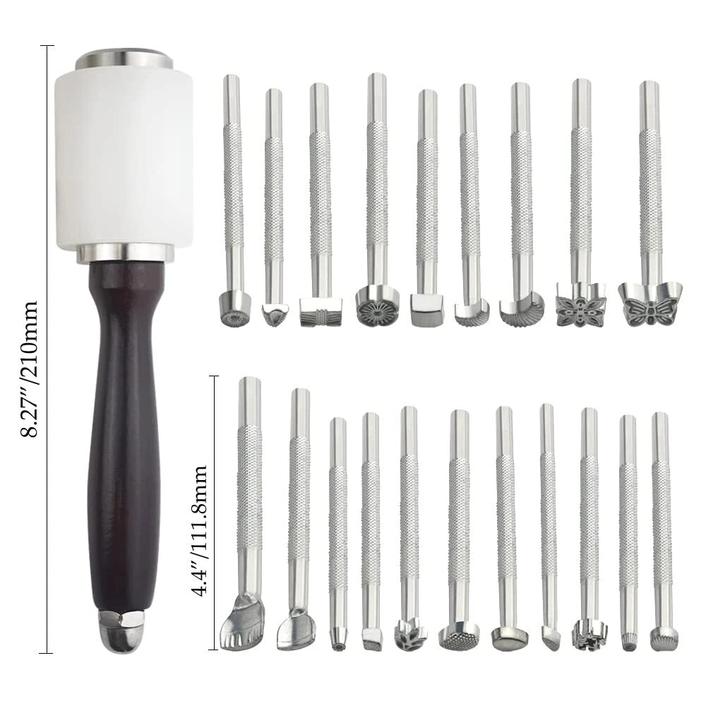 Applications of saddle making tools: The leather stamping tool kit can be used in DIY leather craft, leather production like bag, wallet, table mat, strap etc, you can make your own leather product for daily use or to make decorations for your house. Details of the tools: -Leather stamping tool: Carve different great patterns on leather product, with 20 types, easy to do. -Leather carving hammer: Strike the stamping tool to print patterns on leather craft, durable and solid. Specifications: -Color: sliver, white, brown. -Type: leather stamping tool kit -Quantity:21pcs leather craft tools in total -Material: Stamping tool: steel Leather carving hammer: metal, wood, nylon -Size: DIY Leather craft stamps length: 4.1"(111 mm), width: 0.98"(25 mm). Nylon hammer length: 8.27"(210 mm), width: 1.9"(50 mm). Package content: 1pc × wooden nylon hammer 20pcs × DIY leather stamping tools (various patterns) 【Variety Styles】: Different kinds of leather craft styles are provided by the stamping tool kit. You can use various stamping print with 20 stamping tools, suitable for beginner and skilled person. 【Assorted Applications】: The leather stamping tools kit comes with widely applications, like stamping for leather bag, wallet, backpack, and table mat etc. 【Package】: There are 20pcs DIY leather craft stamps, 1 wooden nylon hammer in the package. 【Good quality】: The leather craft carving tools kit is made of high-quality materials, steel stamping tools, solid nylon hammer with wooden handle, good DIY making experience will be provided for you. 【Dimension】: DIY Leather craft stamps length: 4.4"(111mm), width: 0.98"(25 mm), nylon hammer length: 8.27"(210 mm), width: 1.9"(50 mm).
