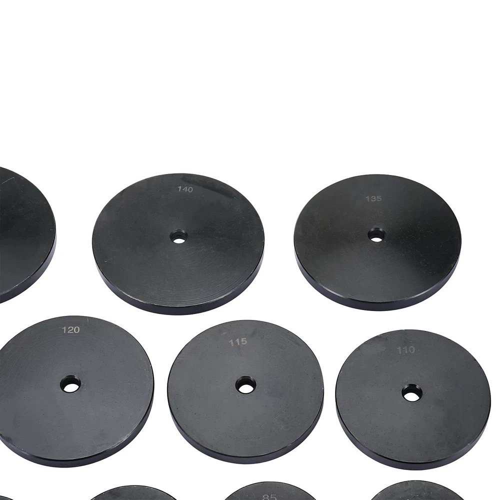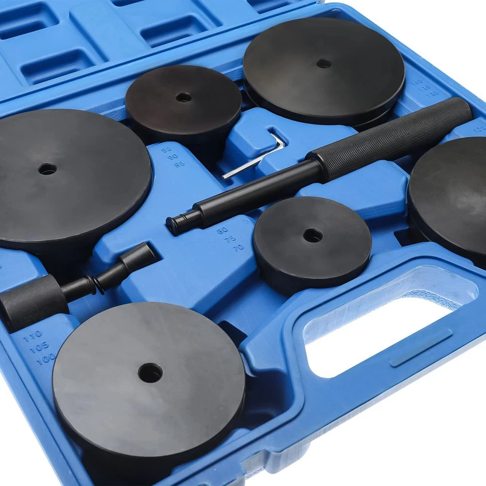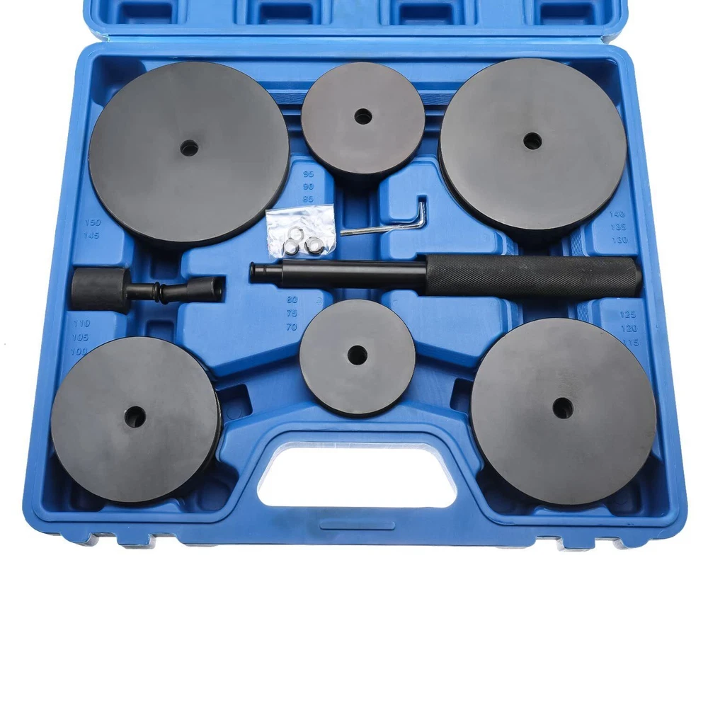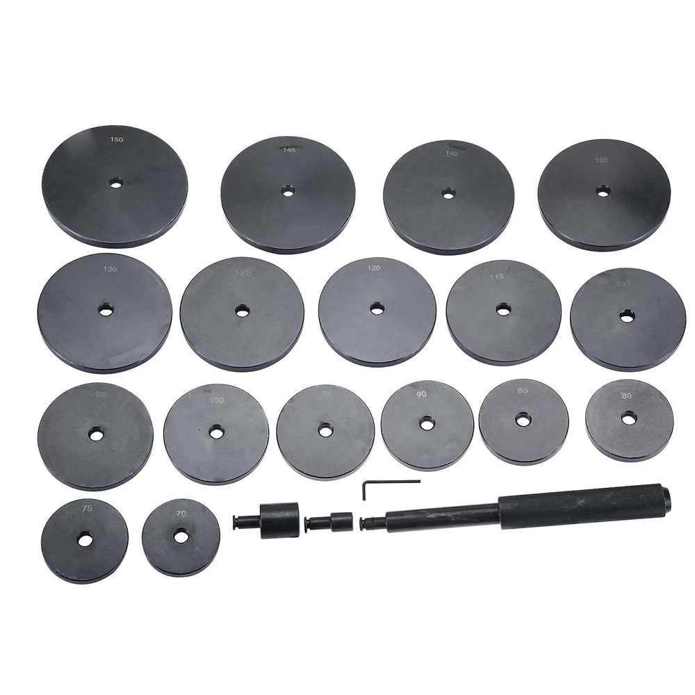 Product Description 21 pcs Bushing Removal Tool, Bearing and Seal Driver Set 21 PCS Extra Large custom bush, bearing, and seal driver set; With ultra-strong carbon-steel construction and black anodic oxidation coating for rust resistance; How to use: Select the required sizes; Assemble your custom driver; Select the components or sizes- Assemble the drive tool; Strike the tool and do the job. Specification The discs go from 70mm (2.75 inches) all the way to 150 mm (5.9 inches) in 5 mm(0.2 inches) increments; All discs are connected with a 12mm shaft and screw which quickly connects to a 280mm (11" ) handle, help remove or install bearings quickly and professionally; INTERCHANGEABLE All the 17 pieces discs are interchangeable with each other, allowing the mechanic to complete the job quickly, professionally, and promptly; EASY OPERATION All discs are connected with a 12mm shaft and screw which quickly connects to a 280mm (11" ) handle, help you remove or install bearings quickly and professionally Easy to Carry Comes with a heavy-duty plastic case with precision-sized compartments for every piece - ideal for storage and transport.