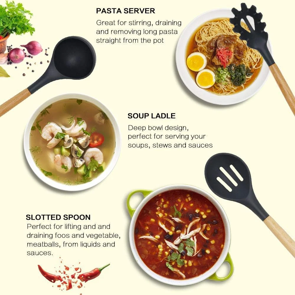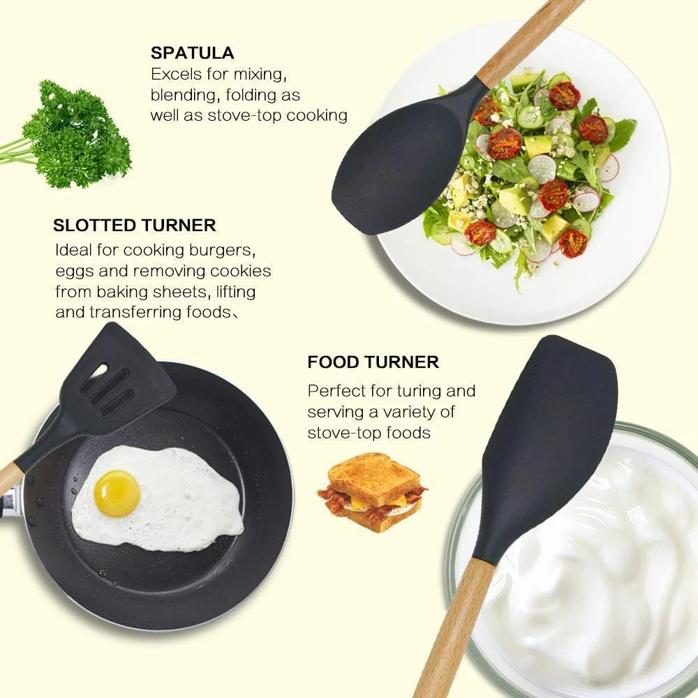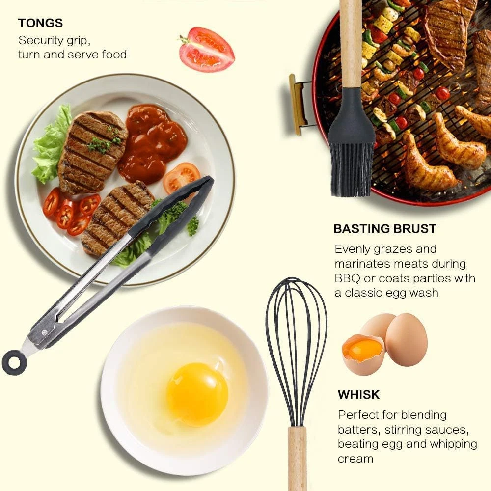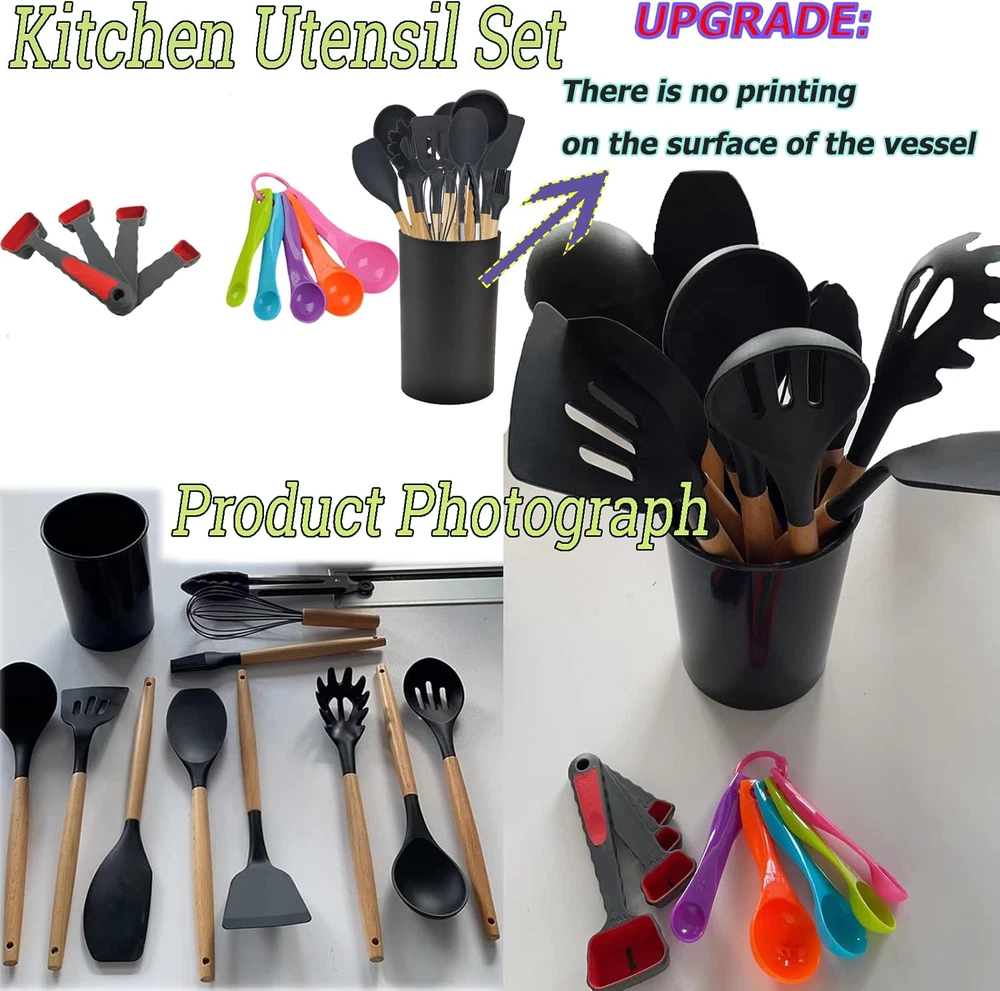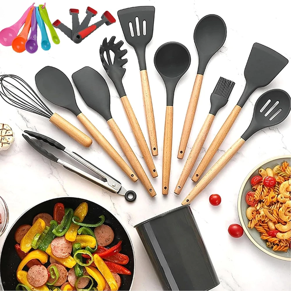 Store New Arrivals Add to Favorite View Feedback Contact 21Pcs Kitchen Utensil Set Gray Silicone Cooking Utensils Spatula Nonstick Cookware Kit with Measuring Wooden Spoons Gadgets Tools Description Color Gray Material Wood, Silicone Is Dishwasher Safe No Item Weight 2.51 pounds Handle Material Wood Size large Package Dimensions 13.15 x 5.16 x 5.04 inches Material Type Free BPA Free ✿【FOOD GRADE SAFE SILICONE】Our cooking utensils set made of food-grade silicone, BPA-free, can use in any type of food.Food grade silicone is safe to use for any type of food - it does not react with food or beverages, or produce any fumes. As such, they are longer-lasting than other kitchen utensils. ✿【COMPLETE COOKING SET】This kitchen utensils set will satisfy all your needs for cooking. Everyone of them has its unique use. It would be your great companion in the kitchen. Elevate your kitchen and prepare to savor these unique kitchenware as much as the food itself! ✿【HIGH HEAT RESISTANT】 Approved and BPA free, our silicone kitchen utensils set tips are ultra heat resistant up from -40°F -480°F, you do not have to worry they will melt if you accidentally leave them in the pot for a while. Non-stick attributes made for hassle-free wash up. ✿【PREMIUM WOODEN HANDEL & ERGONOMIC DESIGN】This Kitchen utensil set with durable woodle handle is Important for the kitchen! Easy-to-grip, and balanced weight make cooking a joy and their large hanging holes help keep your cookware set orderly and organized. A utility hanging hole on each wooden handle for convenient storage organization using hooks or a wall mount. ✿【NO BEND & NO BREAK & SAFE FOR COOKWARE】These kitchen utensils set are more sturdy than other cheap silicone kitchen utensils, they are firm enough to be able to use the spatulas for flipping and scraping, not scratch your pans.Cooking with the non stick silicone utensils set will protect your cookware from any scratches, provide a pleasurable cooking experience. Product Description Alitade 21 Piece Silicone Cooking Utensil Set About Alitade 21pcs Silicone Kitchen Utensil Set High-quality silicone and nylon material, no gaps, no food is trapped, and easy to clean. Non-stick and anti-smudge properties make cleaning easier. This 21-piece kitchen utensil set will satisfy all your culinary needs. This cooking utensil set are sturdy and flexible, won't scratch or damage non-stick pans and pans like metal, and you don't have to worry about food sticking to your cookware. And the material is durable, not rusted, and not deformed, which can well protect and prolong the service life of the cookware. Scratch-friendly for non-stick cookware Modern and functional design, easy to handleH igh-heat resistant (-22℉/-30℃ to 392℉/200℃)N on-slip, elegant & handy beech wood handles Stain-resistantE asier cleaning or washing Alitade 21pcs Kitchen Utensils Made of Food-Grade Silicone ,BPA-free Basting Brush The silicone basting brushes are food grade and BPA-free The basting brushes are able to withstand High temperature The basting brushes won't melt, discolored Bamboo wood handle, very comfortable and smooth to hold, no heat conduction Deep Soup Ladle BPA-free silicone is scratch-resistant and food-safe for the best possible kitchen tool. Bamboo wood handle, very comfortable and smooth to hold, no heat conduction The sturdy and durable soup spoon can bear the weight of the meat, and the sauce can be easily scooped out through the bottom of the silicone spoon, and the gravy can be served for the family. Slotted Turner This Slotted Turner doesn't scratch your non-stick cookware and is easy to clean. It is an adequate size for flipping eggs, grilled sandwiches, etc. Whisk Silicone head is high heat resistant,Safe for non-stick cookware Compared to Whisk made of other materials, cleaning is a very easy task A good life every day ABOUT Alitade 21 piece SILICONE UTENSILS Q : What should I pay attention to when using wooden handle silicone cooking utensils? A :Due to the particularity of the wooden handle, dishwasher cleaning is not recommended. please wash by hand Do not immerse in water for a long time. The texture of each wooden handle is slightly different There is a slight color difference between the shooting of the image and the product itself. Q: Does the silicone kitchen utensils have a certain smell? Is it safe? How to remove these odors? A : Silicone kitchen utensils have a slight odor. Simply expose these kitchenware to the air and the odor will disappear. Of course, the effect will be better if washed with hot soapy water. The kitchen utensil set are made from the highest quality food grade silicone(BPA FREE) Nonstick Cooking Utensils Set Packing 1x Deep Soup Ladle 1x Solid Serving Spoon 1x Slotted Spoon / Strainer 1x Slotted Turner 1x Pasta Server 1x Flexible Spatula 1x Basting Brush 1x Whisk 1x Tongs 1x Round Spatula 1x Turner 1x Plastic Utensils Holder 4x Measuring Cups 5x Measuring Spoons ABOUT US We offer the best prices around on high quality products. Our E-store includes media such as books, movies, music and games while offering electronics, toys, sporting apparel, clothing, tools, general home, garden items and more. SHIPPING We are always working hard to ensure your package arrives as soon as possible. Please understand that some factors like weather, high postal traffic, and the performance of shipping companies are outside of our control. We offer free shipping to the lower 48 states and ship within 2 business days of payment, usually sooner. We do not accept P.O. Boxes. Please provide a physical address. For shipping outside of the continental USA, we only use eBay's Global Shipping Program.The item is shipped to KY and then sent to the rest of the world. International customers are responsible for all duties and taxes. Continue to check out in order to calculate costs for shipping the item to your country. Messages regarding eBay's Global Shipping Program MUST be directe