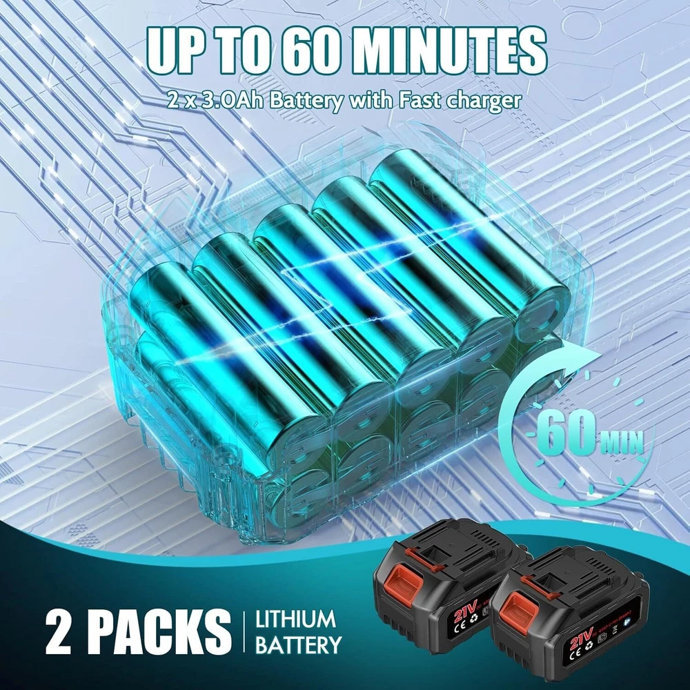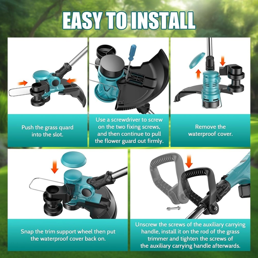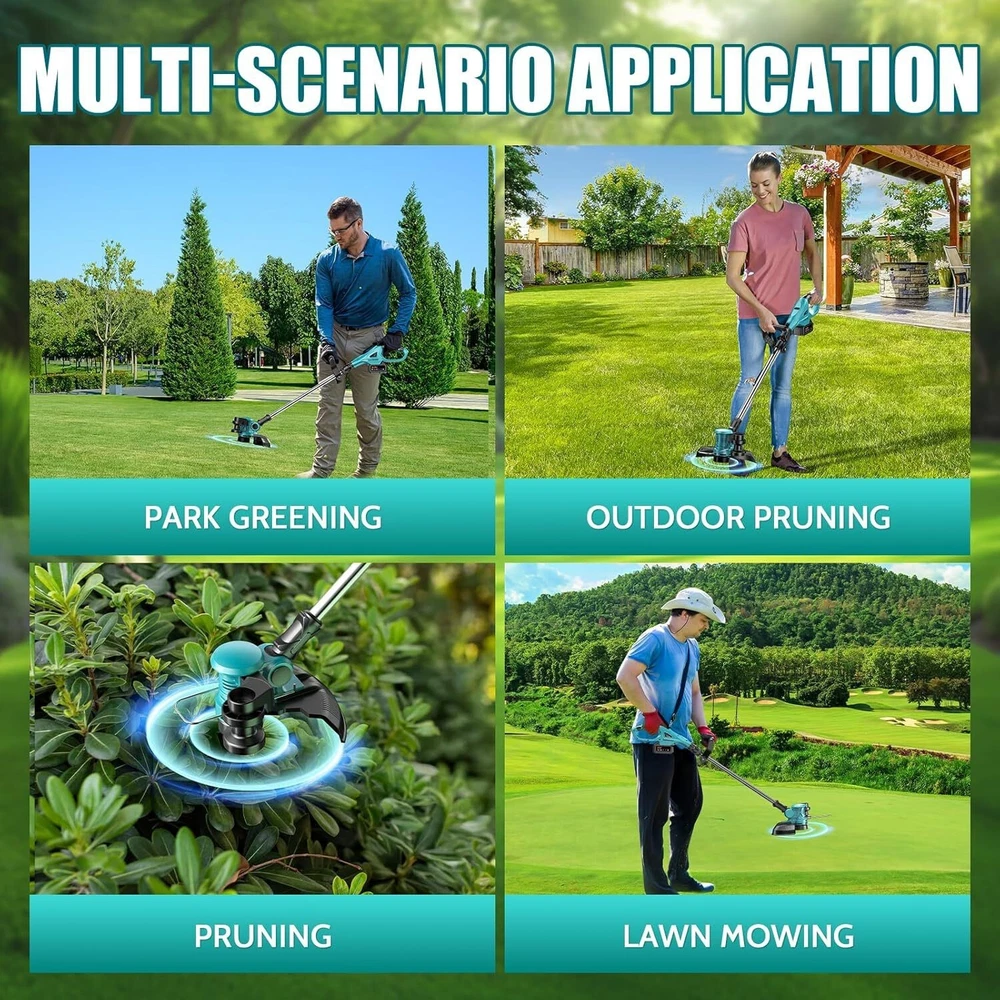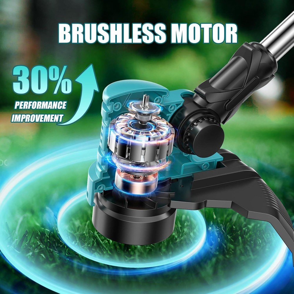 About this item 【2-in-1 Trimmer & Edger】This weed trimmer equipped with a high-performance motor that spins the cutting line at high speeds, effortlessly slicing through grass and weeds. It effortlessly converts from a string trimmer to a wheeled edger to meet your multiple needs for your lawns, gardens, yards, etc. 【Powerful Battery Performance】Equipped with two 3.0Ah batteries and a fast charger, this string trimmer provides up to 60 minutes of uninterrupted runtime. Perfect for handling large yards with ease, it ensures you have ample power for extended tasks. For safety, avoid charging in rainy or wet conditions. 【Automatic Line Feeding and Cutting】The 2-in-1 cordless trimmer and edger adopts an advanced automatic line feed system, which can intelligently distribute the cutting line as needed, eliminating the trouble of manual adjustment. You can focus on mowing a clean lawn without worrying about entanglement. Please wear a protective cover when using it to ensure your safety. 【Two Major Design Upgrades】Our cordless grass trimmer boasts a no-load speed of up to 8500RPM, delivering more powerful performance with reduced noise levels. The spool system bids farewell to the frustration of easily loosening and tangled grass lines during installation, significantly simplifying the process and ensuring a smoother operation for your garden lawn mowing and trimming tasks. 【Safety Protection】With a maximum power of 650W, this weed wacker delivers exceptional efficiency and performance. To ensure user safety, the lawn trimmer includes a safety lock to prevent accidental start-ups. Additionally, the adjustable edge guard protects plants and flowers while mowing, ensuring your garden or lawn maintains its pristine beauty after every use.