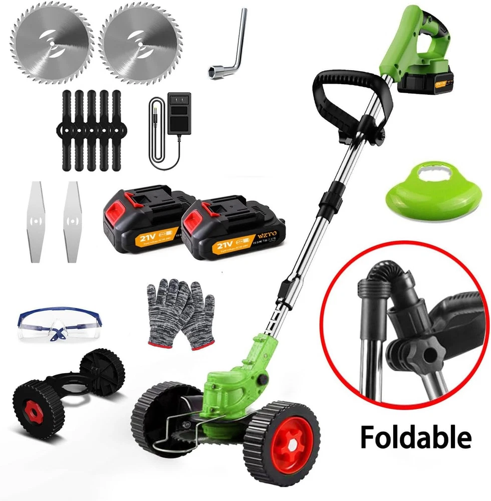 Product Description About this item ✂️【3 In 1 Garden Strimmer Cordless】3-In-1 Grass Strimmer/Edge Trimmer/Brush cutter, Features low noise, waterproof and easy to clean, very suitable for lawn trimming, weed removal, gardening pruning, etc. Grass Trimmers with 850W high power pure copper motor, 20000 rpm no-load speed, with a superior run-time to ensure smooth mowing, allowing you to complete the garden lawn weeding work easily. 🌳【Multi-Function Brush Cutter Blades】The strimmer cordless has three blades that can easily cope with various situations. ① The nylon blade acts like a heavy-duty rope and is ideal for soft grass; ② The metal blade is great for trimming weeds, reeds, etc.; ③ The manganese steel circular saw blade is used to cut small shrubs and branches. The garden strimmer plastic blade is suitable for trimming young grass. If your garden grass is thicker, you can simply use the metal blade. 🔩【Adjustable Height & Flexible Trimming】The cordless grass trimmers battery operated has an adjustable telescopic pole that can adjust the length from 33 to 47 inches. Provide the required length for all people without bending over. 90° Head Rotation, allowing you to care for every corner and cranny easily. It is an efficient and reliable grass cutter for keeping lawns, paths, and flower beds clean, as well as for mowing lush grass brushes for yards or gardens. 🌿【Lightweight Design】Cordless lawn mower with removable wheels. The weeding work can be achieved by pushing the grass trimmer after installing the wheels. It can save a lot of effort when using it to achieve the effect of easy weeding. With the wheels removed, adjust the angle of the grass trimmer head to easily cut corners and edge weeds. An ergonomic soft handle improves comfort and control. Ideal for trimming around yards and bushes. Low noise and vibration ideal for use in residential areas ⚙️【Safe & Comfortable Design】The electric lawn trimmer with double safety button design, you need to press the safety lock and trigger at the same time to start the battery strimmer, preventing accidental activation, especially by children. Anti-collision iron bars don't fear damage when they touch hard stones or walls. Its rotating baffle prevents water splashes during weeding. Gloves and glasses are also included to protect your hands and eyes. 🔋【Cordless Strimmer with Battery and Charger】 This Lawn Trimmer Weed Wacker is equipped with a 2 x 2000mAh lithium battery, which can be used Use about 90-150 minutes(charging time: 2-3 hours), effectively solving the problem of short battery life. Two batteries can be replaced, so you don't need to wait to charge when gardening. Please fully charge it before first use to get the expected working time. 📧【Warm Tip】Please fully charge the battery before using the strimmer for the first time to provide a better user experience. This product requires you to install the blades and other accessories yourself. Before starting the weed eater, tighten the nuts that hold the blades in place and install the entire machine correctly. 21V Cordless Strimmer Grass Trimmer with 20000 RPM and 850W Motor Garden Strimmer Cordless with 2 * 2.0Ah Batteries is the Perfect Partner for all Your Garden & Lawn Care Needs If you're overwhelmed by an overgrown garden, don't worry Our Cordless Lawn Trimmer Weed Wacker is designed for cutting private lawns and small areas of grass. It can also be used to trim the edges of lawns and flowerbeds helping you to solve the gardening labor easily! This cordless mower has many advantages over traditional mowers. First of all, it is cordless, making it easier for you to use, and you no longer have to worry about the cord not being long enough or out of reach. Secondly, it is equipped with 2*2.0Ah battery, which increases the working time by 20% compared with the traditional lawn mowers, saving your energy and effort. 21v Lawn Mower Grass Cutter Machine with a double safety button design, you need to press the safety lock and trigger at the same time to start the brush cutter, ensuring your safety. The angle of the machine head rotation 0-90° is freely adjustable at will to ensure that it can be suitable for most complex working environments. Ergonomically designed handle for long hours of work without feeling tired. This garden strimmer is versatile and can be used for gardening, park landscaping, mowing gardens, and lawn mowing Product attributes: Material: aluminum + plastic Color: black + green Voltage: 21V Battery capacity: 2000mah Speed: 20000 U/min Power: 850W Telescopic tube: 90cm/35.4 inches ~120cm/47.2 inches Circular blade diameter: 15 cm/5.9 inches Straight blade diameter: 14.6 cm/5.74 inches Power type: 2 lithium batteries No-load running time: 90-150 minutes Product List: 1 x Lawn mower 2 x Batteries 2 x Rectangular alloy saw blades 2 x Circular alloy saw blades 5 x Plastic saw blades 2 x Detachable wheels 1 x Baffle 1 x Wrench 1 x Charger 1 x User Manual