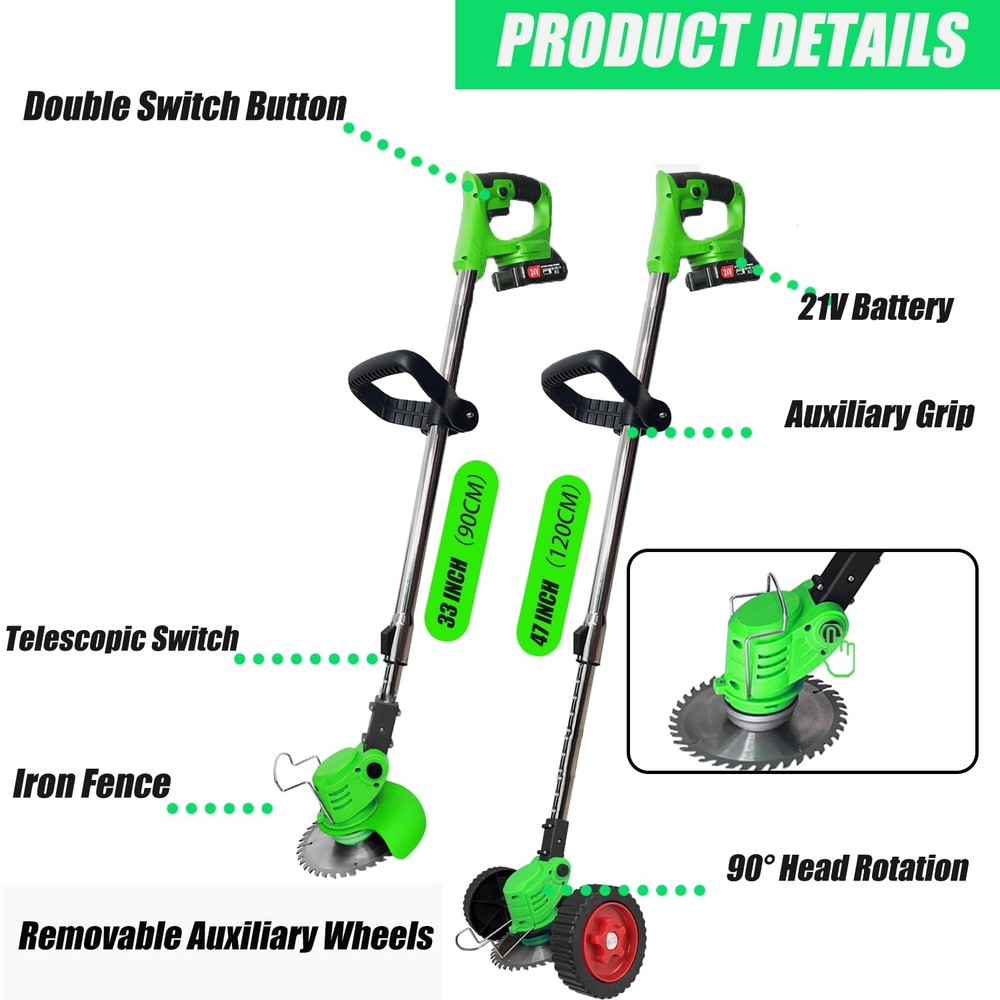 【5 Types of Cutting Blades】 2025 Plastic blade suitable for mowing soft grass; Rhombus blade suitable for weeds or small shrubs; S-blade suitable for plants and reeds; Saw blade suitable for pruning branches; weed whacker string for trimming tall and thick grass Different blades meet different weeding needs, Ideal for trimming around yards and bushes, lots, flower beds, walkways, patios 【MULTI-FUNCTION GRASS TRIMMER】2025 New grass trimmer/ lawn edger/ small mower/ brush cutter cordless weed wacker with 850W high-power motor, the speed can reach 20,000RPM, the battery operated weed wacker is an efficient and reliable helper to keep the lawn, driveway and flower bed clean, and can trim dense grass for your lawn or garden. You can enjoy patio mowing time! 【3-IN-1 Electric Weed Wacker】Plastic blade suitable for mowing soft grass; Rhombus blade suitable for weeds or small shrubs; Saw blade suitable for pruning branches; Ideal for trimming around yards and bushes, lots, flower beds, walkways, patios. More professional tools can make your gardening work easier and more enjoyable 【ADJUSTABLE HEIGHT & ROTATING HEAD】Cordless weed wacker battery operated the handle adopts ergonomic design Adjustable length of telescopic shaft which total length is about 35-47 inches, the angle of the String Trimmer Cordless head can be adjusted (0-90°) at will to fit for most complex working environments. Weed wacker battery powered women and the elderly can easily use, allowing you to easily care for any hard-to-reach nooks and crannies 【PRODUCT INCLUDES】1 x Cordless weed trimmer; 2 x Batteries ; 1 x Circular Saw Blade; 4 x Metal blades; 10 x Nylon Blades; 1 x User Manual; 1 x Fast Charger; 1 x Work Gloves; 1 x Goggles; 1 x Cleaning brush. making it a must-have for anyone looking to tackle gardening tasks with ease 【EXCELLENT AFTER-SALES SERVICE】Our 24/7 friendly customer support ensures you're worry-free post-purchase. We'll do everything we can for your any issue. reach out anytime. Our experts respond within 12 hours, dedicated to resolving your concerns for a confident purchase experience. Enjoy peace of mind with our 90-day replacement policy for battery-operated electric weed whackers.