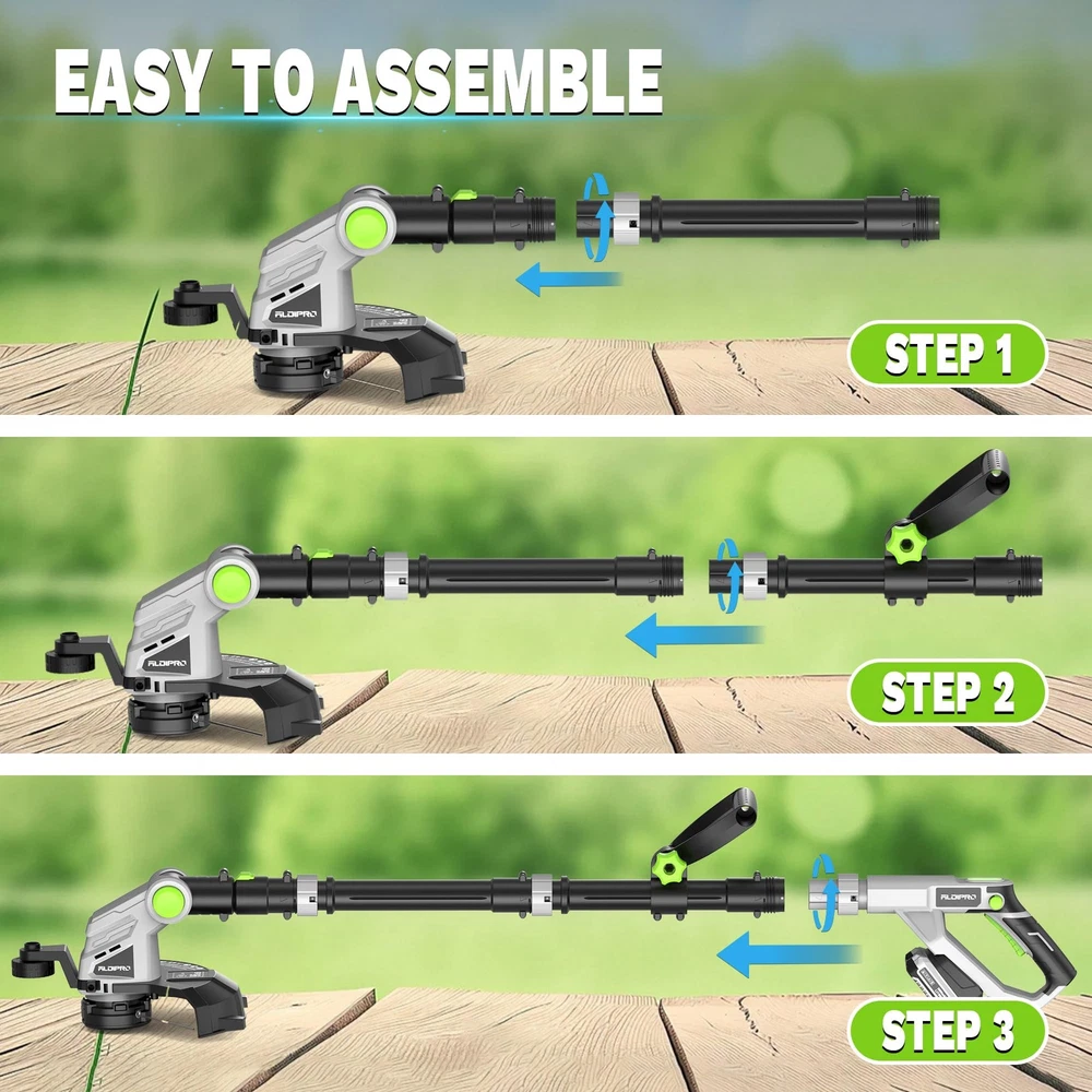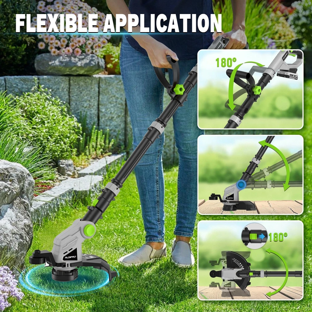 21V Cordless String Trimmer – The Ultimate 3-in-1 Lawn Care Solution! ✔ 【Powerful & Cordless】 21V lithium-ion battery delivers gas-like performance without cords ✔ 【12-Inch Cutting Diameter】 Tackles weeds, grass, and overgrowth effortlessly around gardens, fences, and sidewalks ✔ 【1x 2.0Ah Batteries + Fast Charger】 Enjoy extended runtime (up to 35 mins per battery) with rapid recharge ✔ 【Auto-Feed Spool System】 No bumping needed – automatically releases line when required ✔ 【3-in-1 Versatility】 Convert between string trimmer, edger, and lawn mower in seconds Perfect for maintaining lawns, yards, and commercial landscapes! [3-In-1] This cordless string trimmer 12-Inch integrates three functions of trimmer, edger and lawn mower, Ultra-Lightweight weed wacker can easily meet all your gardening lawn care needs and provide professional-level results for your outdoor work, reducing your labor intensity [Automatic Line Feed] Electric weed eater has an automatic line feeding system, which automatically releases new line about 0.1-0.3 inches each time the machine is turned on, without interrupting trimming, making your gardening work smoother and more efficient [35+ Minutes Runtime and Fast-Charging] Cordless string trimmer includes 2.0AH High-Capacity lithium-ion battery with UL-certified charger. Enjoy 35+ minutes continuous trimming (No load test results) and 60 minute fast charging [Detachable Structure] The innovative pole design of this grass trimmer can be detached freely and the length is adjustable. It can adapt to the operation needs of users of different heights, and is also easy to store and save space [Comprehensive flexible adjustment] The header can be rotated at 180 °, adjusted 60 ° up and down, and the handle can also rotate 180 °. Comprehensive adjustments can make this electric weed wacker flexibly adapt to various pruning angles and heights to meet the needs of a single trimming and adapt to various complex terrain and operation angles [Package Included] 1* Cordless String Trimmer, 1* Fast Charger, 1 * 2.0Ah Lithium-Ion battery, 1* User Manual