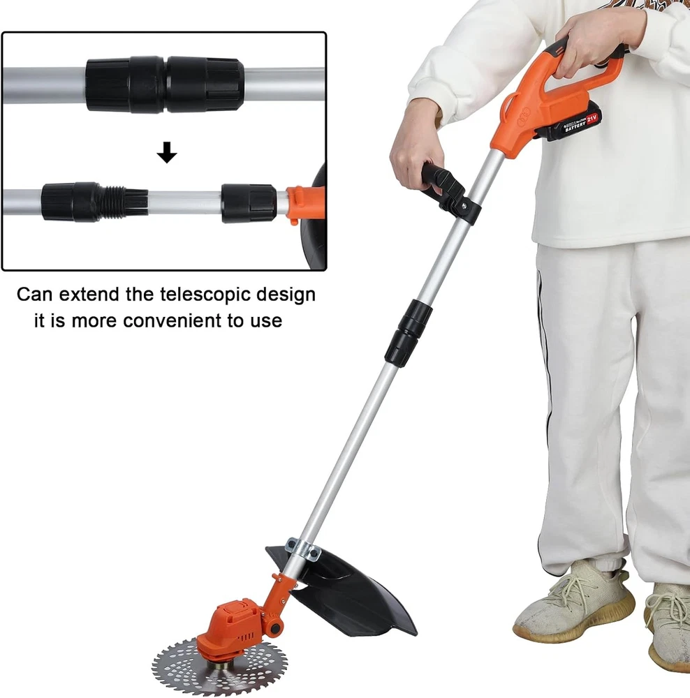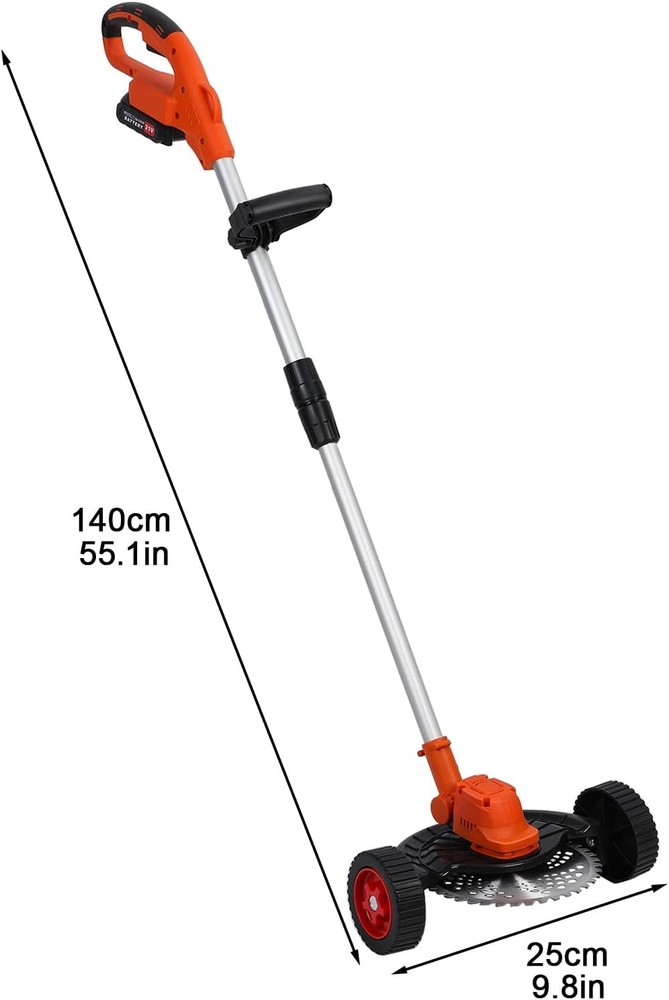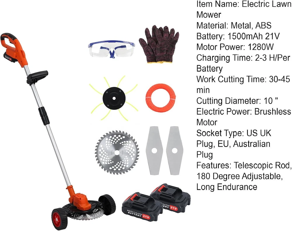 9 Inch Cordless Weed Eater, 21V Rechargeable Battery Powered Lawn Trimmer with Brushless Motor, Lightweight, Powerful & Easy to Use, Adjustable Telescopic Pole for Garden, Yard About this item Lightweight and Portable: This portable weed wacker features a lightweight, tangle-free design and comes with a telescopic pod ,seniors and women also can use it effortlessly Easy to Install: The cordless weed eater is very simple and easy to assemble with a detailed user manual and installation kit. The battery-powered mower includes a removable wheel that converts it into a miniature cordless mower Multi-functional Use: The electric lawn mower for battery powered mowers includes a removable wheel that converts it into a mini cordless mower. Comes with 2 Straight Blades, 1 Round Blade, 1 Trimmer Line Blade for cutting grass, vines, branches and shrubs Durable Materials: The electric weed mower is made from premium ABS and metal to effortlessly cut through grass and even small shrubs. It is also equipped with a brushless motor to provide powerful performance, and a dual battery system to ensure continuous operation long enough for small jobs. Efficient brushless motor ensures consistent power output and long service life Removable Auxiliary Wheel and Safety Lock Design:With the removable auxiliary wheels, the weed trimmer can be transformed into a lawn mower.String Trimmers Battery Powered handle position has a safety lock to prevent accidental starting of the weed whacker, the grass stopper prevents splashing when the mower is working, the ergonomic design of the mower makes your work safer and more efficient Product Description Item Name: Electric Lawn Mower with Brushless Motor Material: Metal, ABS Battery: 1500mAh 21V Motor Power: 1280W Charging Time: 2-3 H/Per BatteryWork Cutting Time: 30-45 min Blade Size: 9 Inches Electric Power: Brushless Motor Features: Telescopic Rod, 180 Degree Adjustable, Long Endurance Size Details:L: 140cm/55.12", W: 25cm/9.84" (Approx.) Package Includes: 1 x Electric Lawn Mower 2 x Batteries 1 x Charger 1 x User Manual 2 x Straight Blades 1 x Round Blade 1 x Trimmer Line Blade 1 x Installation Toolkit