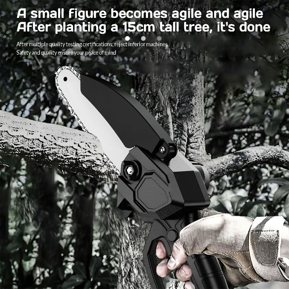 UPGRADED SUPER POWER CUTTING: Cordless chainsaw use enhanced new upgraded super power motor engine, provides 150% more super strong power force, can cut maxmum 8 inches thickness hard woods in about 10 seconds. BUY ONE EQUALS TWO: Upgraded 6/4 Inch chain switch design, allows you to switch 2 length of chains easy and quickly for multi-purpose use when cutting/trimming different size of trees/branches as you like. 6 inch chain for larger thicker wood cutting (6-8inch diameter); 4inch chain for regular size wood cutting(0-5inch diameter). ENHANCED PROTECTION DESIGN: For safety we deigned with a safety baffle to prevent wood from splashing, and a safety lock button to prevent accidental activation. Warmly equipped with safety hand gloves, safety eye goggle, and safety earplugs to make sure multiple protection for users. 2 HOURS LONG LASTING RUNNING: Cordless chainsaw packed with 2 upgraded 21V 2.0Ah Li-on rechargeable batteries, support more than 2 hours running time(each battery can run about 1 hour after full charge), 3 times longer than other similar products with lower quality Li-on rechargeable batteries. EASY OPERATION & PORTABLE: Cordless chainsaw has been fully installed in a nice portable carry case, no need to install before use. Special designed chainsaw tool kit bag contains 4 chains and 2 saw blade for replacement, also includes accessories you need when you use chainsaws. COMPLELETLY ACCESSORIES : 1 x Handheld chainsaw, 1 x 4-inch saw blade, 1 x 6-inch saw blade, 2 x 4" chain, 2 X 6" chain, 2 x batt ery, 1 x Charger, 1 x Screwdriver, 1 x Suitcase.