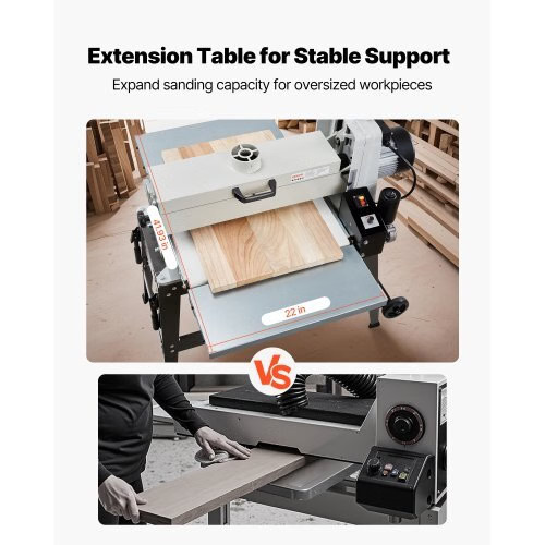 VEVOR 22" Drum Sander with Stand & Extension Tables, 1.75HP 1440RPMDual Motor Drum Sander for Woodworking - Variable Speed ConveyorBelt, 4" Dust Collection Port for Cabinet & Furniture Finishing Uniform Sanding, Less Rework Convenient & Easy to Use Easy Installation Wide Applications Aluminum Drum 4-inch Dust Collection Port Max Workpiece Width: 22-inch / 560 mm,Conveyor Speed: 0 - 3.5 m/min,Drum Size: 22 inch,Drum Material: Aluminum,Suitable WorkpieceThickness: 1/32" - 4" ,Overall Dimensions: 48.8" x 41.9" x 45.7" /1240 x 1065 x 1160 mm,Voltage/Frequency: AC 110V, 60Hz,High Speed:1440 RPM,Item Model Number: MS3156,Motor Power: 1.75 HP,FrameDimensions: 38.2" x 20" x 23.8" / 970 x 510 x 605 mm,Dust PortSize: 4-inch / 100 mm,Net Weight: 230.2 lbs / 104.4 kg