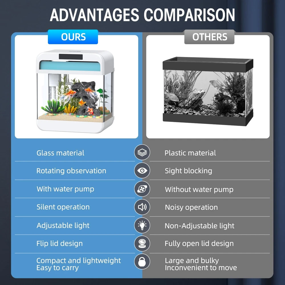 Fish Tank 2.2 Gallon Fish Bowl with Adjustable 3 Color Lighting 3 in 1 Quiet Pump with Filteration, Oxygenation, Water Circulation Triple Function, HD Float Glass, Leak-Proof Thickened Base 【3 Colors Adjustable Lighting System】Featuring waterproof 8 light beads on the cover's top, it offers three light color options: white, blue, and red (the red color is not that obvious). Easily adjust the colors with the on/off button, but here's the hidden gem: a gentle press toggles the colors while a firm press switches the system on or off. So please remember to use a light touch that is just press the button one-third of the way down.when adjusting colors of the light. 【Triple Self-circulating Filteration System】Self-cleaning Fish tank with a 3-in-1 silent water pump which combines filtering, oxygenation, and water circulation, it also features a reusable filter sponge for 4-pronged filtration, ensuring crystal-clear water and a stable environment for your fish. Designed with an extended rain pipe for a soothing ambiance and visual waterfall experience. 【Enhanced Durability and Clarity】Well-built fish tank crafted from automotive-grade float glass with more than 3mm thickness, experience a 360° HD viewing immersion while the heightened protective features and thickened anti-slip base ensure enduring durability and minimizing maintenance costs. 【Effortless Assembly & Maintenance】Enjoy aquarium ownership with our intuitive design and clear instructions. Easily adjust lighting modes and humidifier spray modes, while water changes are a breeze. Each aspect is designed for effortless operation, ensuring a seamless experience for all 【What You Get】This fish tank kit includes three decorative plants (random type), a removable blue board to prevent fish from jumping out, A resuable filter sponge, 3-in-1 water pump,Clear user instructions and providing a complete entry-level set-up perfect for keeping bettas, guppies, and other saltwater or freshwater fish
