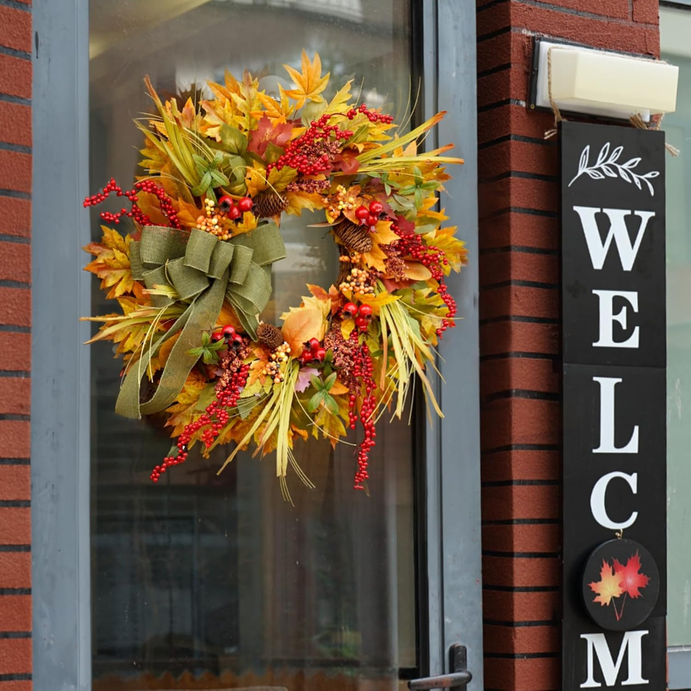 This gorgeous fall wreath instantly brightens up my front door with its rich, warm colors and realistic details! The mix of silk leaves, berries, and pinecones looks so lifelike, and the green bow adds the perfect finishing touch. The sturdy vine base keeps it full and lush—no gaps or flimsy spots. Rain or shine, it holds up beautifully outdoors. It arrived ready to hang, and the craftsmanship is impressive. Every time I come home, this wreath puts me in the autumn spirit. Highly recommend for a cozy, festive upgrade!
