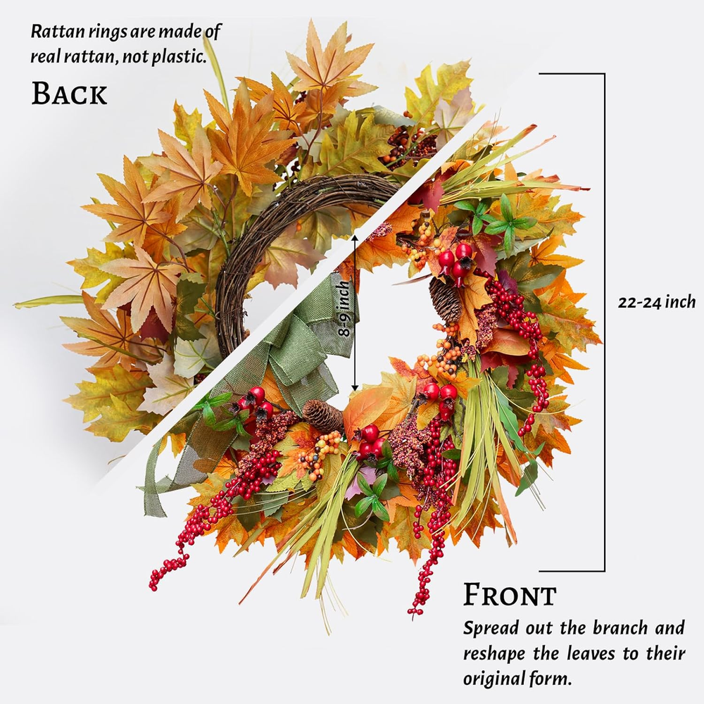【Vibrant & Lifelike Fall Door Wreath】This 24 inch autumn wreaths for front door is filled with lifelike autumn leaves in warm tones, red berries, pine cones, and a charming green bow. It adds a stunning seasonal touch to your front door decor 【Premium Materials & Full Shape】 Outdoor fall wreath crafted with premium silk flowers, sponge berries, professional flower paper, and a sturdy natural vine base, this fall door wreath is lush, well-shaped, and long-lasting. No sparse spots—just full autumn beauty 【Handcrafted Fall Outdoor Wreath】Our fall front door wreath is professionally handcrafted by skilled florists. With detailed craftsmanship and solid construction, this wreath fall decoration will last year after year,not easy to fall off 【Perfect for Indoor & Outdoor Use】Use it as a fall wreaths for indoors, on your wall, fireplace, kitchen, or window, or as an outdoor fall wreath for your porch or front door. Ideal for Thanksgiving, Halloween, Harvest Day, and other seasonal events 【Easy Setup & Adjustable Design】Arrives in a sturdy box to protect the shape. Gently fluff the fall eucalyptus wreath upon arrival to reveal its full 24-inch diameter. Instruction card included for best display tips 【Thoughtful Seasonal Gift】This large fall wreath makes a beautiful gift for housewarming, autumn weddings, or Thanksgiving front porch decor. It's the perfect way to share festive spirit and warmth 【Worry-Free Service】Artificial silk fall wreaths for indoors don't need special cleaning, just wipe them with a dry cloth to keep them clean.Any problem in the process of use, please contact us in time, we will give you a satisfactory answer at the first time Product Description