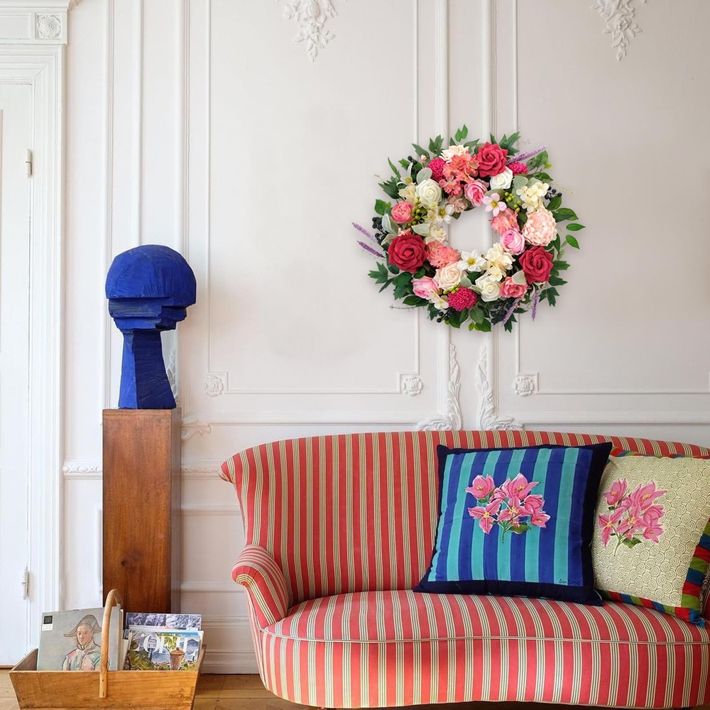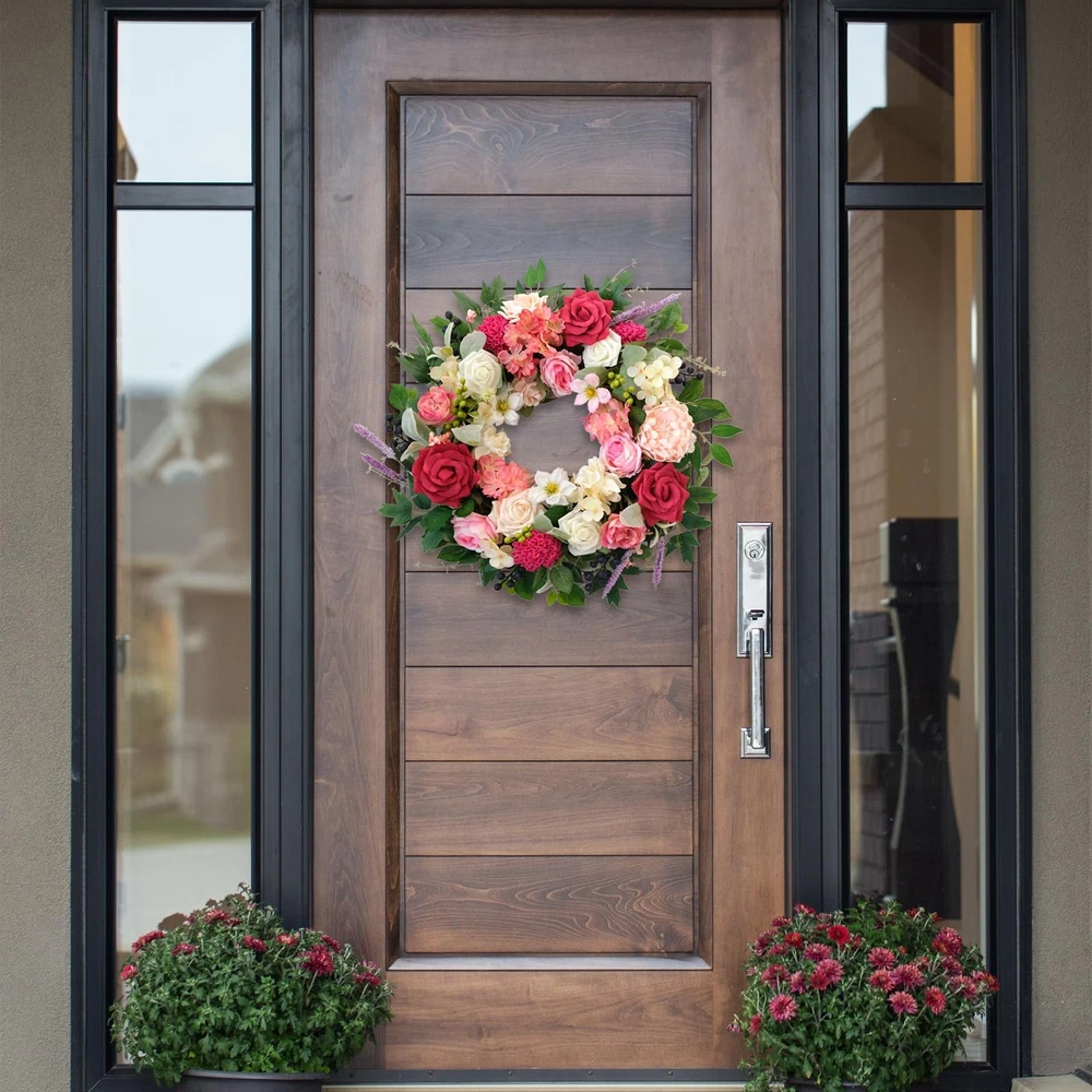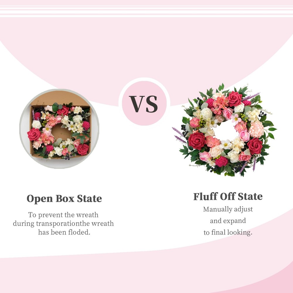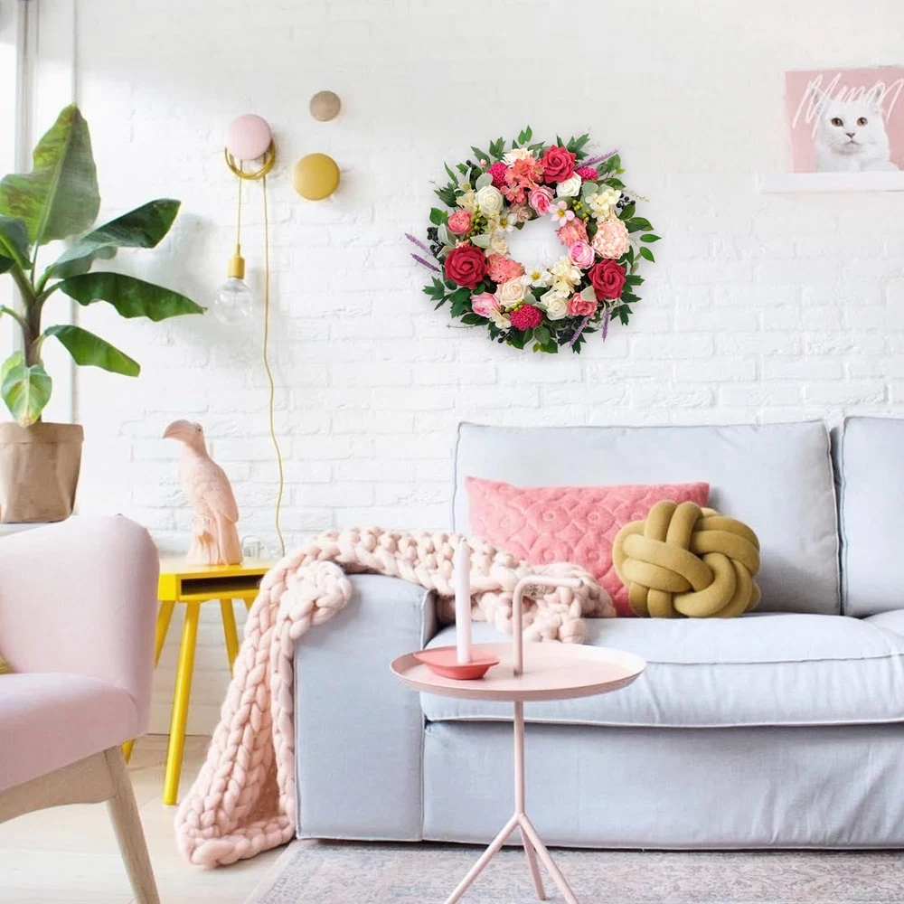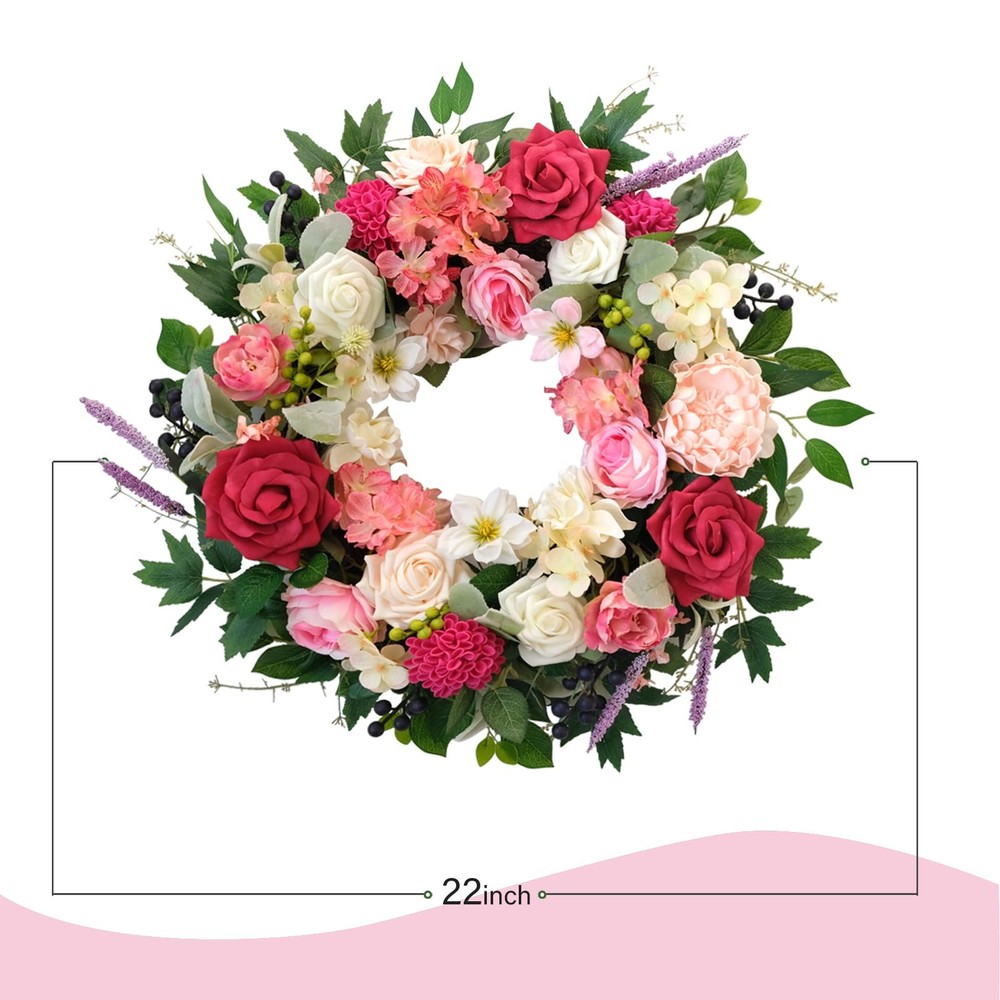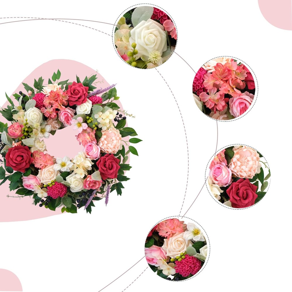 The design inspiration for the wreath comes from the gardens of spring, with its full and rounded shape, exuding a rich vitality and energy. The edges are naturally flowing, with each flower cleverly embedded within, maintaining the overall harmony and unity while showcasing the unique charm of each blossom. This luxurious wreath is suitable not only for home decoration but also serves as a decorative highlight for celebrations, weddings, parties, and other occasions. Whether hung on a wall, door, or placed on a table, window side, it can add a unique charm and atmosphere to your space. In this season full of love and beauty, let us use this splendid wreath to add a touch of brilliant radiance to your space, allowing every glance to feel the joy and warmth from the heart. 【High-quality materials】: The dazzling spring flower wreath is made of high-silk and foam plastic, with natural black grass as the base, tightly wrapped into a circle. There's no need to worry about fading or falling off, and it can be used all year round. 【Unique design】: We have carefully selected a variety of flowers that best reflect the colors of spring, including roses, gardenias, dahlias, water lilies, and lavender, complemented by green leaves, transforming your home into an ocean of flowers, as if stepping into a romantic dream garden. 【Size】: The fully expanded outer diameter of the wreath is about 22 inches. The branches of the wreath are flexible, allowing you to stretch the wreath to your satisfaction. The whole process is very pleasant and effortless, allowing you to slowly enjoy its beauty. 【Easy maintenance】: Each flower on the front door wreath is realistically shaped, as fresh as if just picked. The handcrafted wreath is not prone to deformation, extremely durable, and requires no special maintenance, just wipe with a damp tissue or cloth to keep it clean. 【Suitable for various occasions】: We recommend using the wreath indoors or in sheltered outdoor areas, placing it on your front door, windows, bookshelves, walls, or hanging above the fireplace. The bright colors also make the wreath perfect for decorating weddings, birthdays, stages, offices, restaurants, etc. It is not just a decoration but also an interpretation of the endless beauty of spring.