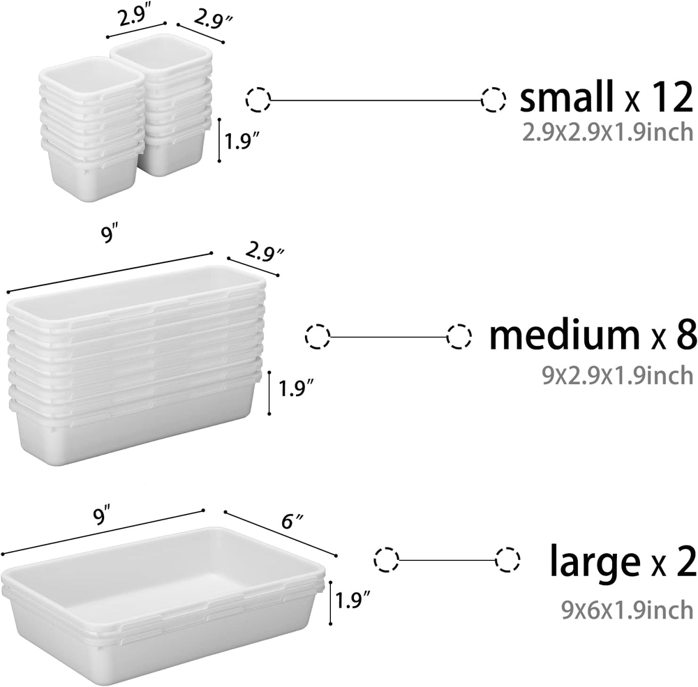 Separate and Stackable - These sturdy desk drawer organizer set can be stacked together, or each one works alone. The interlocking feature of the junk drawer organizer help you create your own mix.Keep everything organized, No more trouble finding things. Durable Material - These shallow drawer organizers are made of high-quality and solid durable plastic material.Drawer organizer bins are break-resistant and could accommodate different items and match organizational system to fit in any drawer. Multi-purpose drawer organizer tray - Designed for multipurpose solutions, perfect for dresser, bathroom drawer, kitchen drawer, office desk etc.Cosmetics, brushes, daily necessities, tableware, fruits, jewelry, tools, pencils can be easily stored. Easy to Care - Rounded corners plastic drawer organizer allow for easy use and cleaning.You could wipe clean with soap and sponge when it is dirty.The drawers can be stored permanently. Customize Combination - 22 pack flexible small drawer organizer with 3 various sizes allow for a good variety of layout. Items are organized according to size and use. contains 12pcs Small:(2.9×2.9×1.9 inch) - 7.5×7.5×4.8 cm,8pcs Medium:(9×2.9×1.9 inch)- 23.5×7.5×4.8cm,2pcs Large:(9×6×1.9 inch)-23.5×15.5×4.8cm. Product Description This desk drawer organizer set is perfect for dresser, bathroom drawer, kitchen drawer, office desk etc.Keep everything organized, No more trouble finding things.