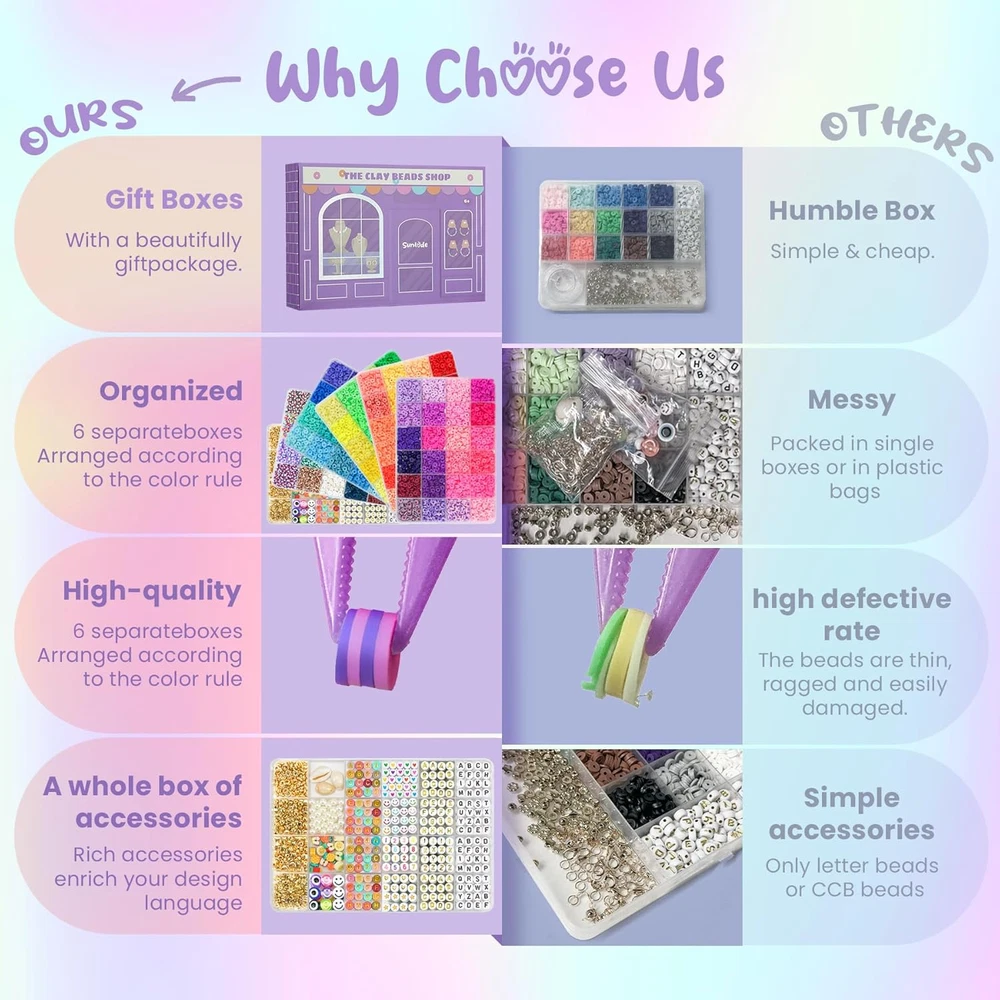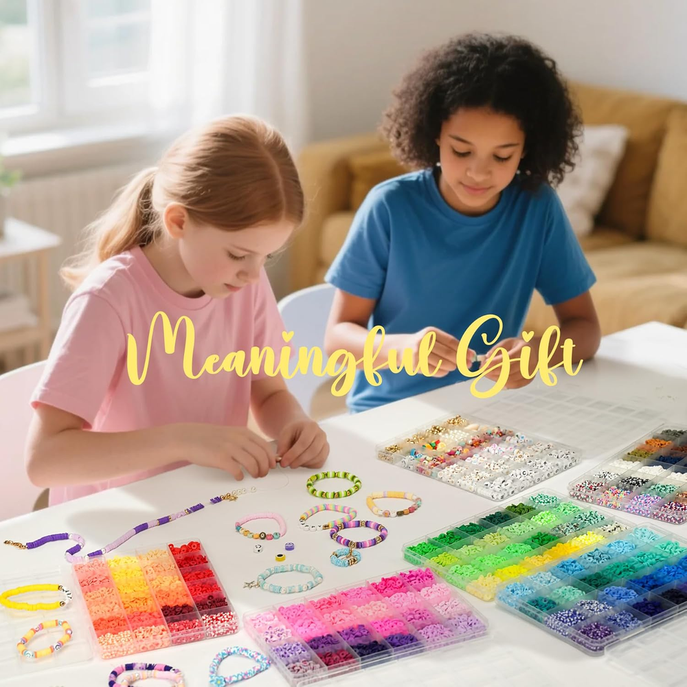 Clay Beads for Bracelets Making Kit 22000 Pcs 120 Colors Clay Bead Kit 6 Boxes ALL-IN-ONE CLAY BRACELET MAKING KIT : The clay beads for bracelets including 20,000 flat polymer clay bead set in 120 colors and 5,000 rich charms kit (letter beads, smile face beads, heart beads, number beads, evil eye beads, fruit beads, pearls, assorted spacer beads set, lobster clasps, silver/gold pendants, and earrings, etc.), 2 rolls of stretchy strings,1 scissors. Everything you need in this clay bead bracelet making kit to create beautiful friendship bracelets, necklaces, and earrings. CERTIFIED FRIENDLY MATERIALS: Sunlode clay bead bracelet kit is handmade with soft and safe clay, the edge of clay beads are smooth, all non-toxic, waterproof and fade-resistant. Perfect for clay bracelet making by adults and kids alike, this clay beads kit is 6mm lightweight beads with 2mm holes for easy stringing. Safe, durable and packed with 120 popular colors to inspire endless bracelets kit designs. EASY ACCESS & UNLIMITED CREATIVITY: This premium clay beads kit delivers instant access and endless design possibilities! 120 vibrant colors neatly organized in 6 storage boxes. Create thousands of unique clay bead bracelets, friendship bracelets, necklaces and more with this clay bracelet making kit. Whether you need a bracelet making kit for adults or a fun beading kits for kids, this all-in-one kids bracelet making kit solution includes everything: from colorful clay bead to assorted charms. MORE THAN A GIFT:This clay bead kit is more than just a craft set, it's an opportunity to create a beautiful keepsake with a loved one! Ideal as 6 7 8 9 10 11 12 13 year old girl birthday gift, toys for ages 8-13, or gift, each handmade piece becomes a wearable memory of love. SUNLODE QUALITY PROMISE: Your satisfaction is our top priority. If you encounter any issues with our clay bead kit, please immediately. We to provide a satisfactory resolution within 24 hours. Thank you for choosing SUNLODE - where creativity meets quality craftsmanship. Product Description Item model number SL-6MMGLASSBEADS Color 120 Colors Item Weight 2.57 pounds Model Name SL-6MMGLASSBEADS Package Dimensions 11.34 x 7.72 x 1.93 inches Complimentary Shipping and Easy Returns Need to return something? Enjoy our 30-day hassle-free return policy! Take advantage of free shipping across all 48 contiguous states! Your order will be dispatched within 1-2 business days once payment is confirmed. Your Opinion Matters! Your happiness is our main goal! We welcome your feedback! If you encounter any problems, reach out to us right away, and we’ll be here to help. Explore the Extraordinary! Our collection showcases fascinating products that are sure to capture your attention. What surprises await you? Delve in and discover unique items that enrich your daily life. Don't miss the amazing things we have in store for you!