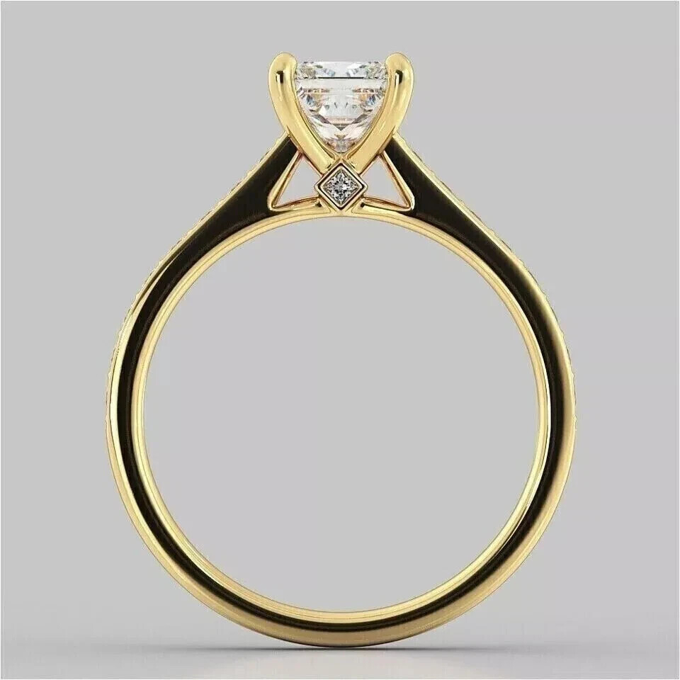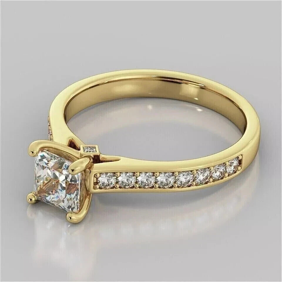 Elevate your special moments with the 2.20CT Princess Lab Created Diamond Women's Wedding Ring, exquisitely crafted for those who appreciate the beauty of precision and elegance. Set in lustrous 14K yellow gold plating, this ring features a stunning princess-cut diamond that radiates with the brilliance of a fairy tale. The diamond's flawlessness is complemented by its excellent cut grade, ensuring that every glance is met with a dazzling display of light and color. Designed with an eye for detail, the ring's floral pattern and prong setting style add a touch of romance and sophistication to any occasion, whether an anniversary, birthday, engagement, Mother's Day, or wedding. With the versatility to customize ring sizes and the personal touch of Sanavi_4215, this piece is not just jewelry but a statement of love, crafted to perfection in the United States.
