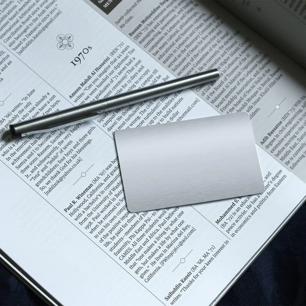 Welcome to our stores! Discover Top Quality Products! We assure your satisfaction. 220PCS Blank Metal Business Cards, Silver Metal Business Cards Blank Aluminum Laser Engraving,Blank Name Card (220PCS - 0.008" thk., Silver) Image Gallery Product Information 220 PCS Blank Silver Metal Business Cards. Product Highlights Material: Metal Business Cards Made of aluminum alloy. Compared with ordinary paper business cards, this are more glossy and textured, can attract your customers' attention more. size: 3.4" x 2.1" x 0.008 ", in size to the credit card. Thickness: 0.008 " is enough for daily use. Application: Blank Metal Business Cards, It is recommended to use a laser engraving machine above 15w. Not applicable to CO2 engraving and UV Print. Thank you for your business! Contact Us ✉ For any inquiries, please reach out via the eBay messaging system. We aim to respond within 24 hours. Payment Methods 💳 We accept PayPal, credit cards, and other payment methods supported by eBay. Ensure your payment details are correct to avoid delays. Shipping Information Your item will be shipped to the address listed on your eBay account. Please confirm your address before completing the purchase. Shipping typically takes 3-7 business days. In case of delays, please allow an additional 2-3 business days due to postal service issues or technical problems. We use reliable shipping services like UPS, FedEx, and USPS. We ship only to the 48 contiguous states. Unfortunately, we cannot ship to Alaska, Hawaii, US territories, APO/FPO addresses, or PO Boxes. Local pickup is not available. If there are any issues with your delivery, please contact us promptly. Your Feedback 🌟 We value your feedback and strive to earn your trust. If you're not satisfied with your purchase, please contact us and we'll work to resolve the issue. Return Policy - We offer a 30-day return policy. - If the item is defective or you are not satisfied, contact us for a replacement or refund. - All returns must be sent to the address provided upon contacting us.