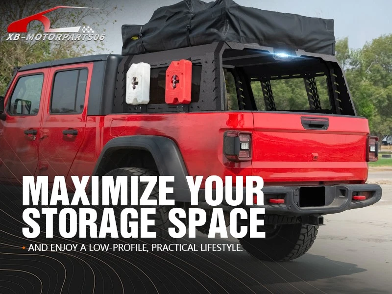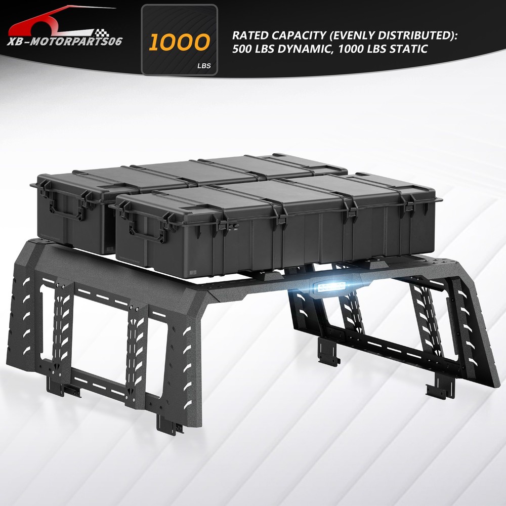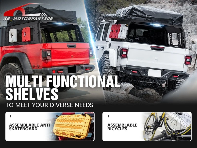 22.1" High Full-Size Overland Bed Racks For 2020-2025 Gladiator JT With Bed Rail Regularly check the rack's hardware for any loosening and ensure that the cargo is securely fastened before driving. Suitable Models : Com patible for 2020-2025 Jeep Gladiator JT with Bed Rails. ( Not Compatible with Trucks with Tonneau Cover & Bed Cover ) Package Includes : One set of bed rack, 1 LED light bar, installation instructions, and mounting hardware. Product Information : Package Dimensions : 53.94 x 25.98 x 9.84 inches Installation mode : Bolt-On Load Capacity: stationary:1000 Pounds;in motion:500 Pounds Placement on Vehicle: Rear Item Weight: 118.14 pounds Material: Carbon Steel Color: Black (hand measurements may have an error of 2-3 mm/0.078-0.118 in) Feature : ① Crafted from premium heavy-duty steel plate, this rack is exceptionally sturdy, capable of supporting 1000 pounds of weight when statically distributed and 500 pounds when in motion. It features a textured black powder coating for corrosion resistance and long-lasting durability; ② Enhance your pickup truck with this practical and thoughtfully designed bed rack, providing additional storage space. Equipped with LED Light Bar, it offers extra illumination for nighttime driving. With a perfect height of 22.1 inches, it doesn't obstruct bed storage space and can match the cab perfectly, catering to various hauling needs; ③ The bed rack features numerous slim slots for accessory installation and cargo tie-down. Ideal for transporting kayaks, surfboards, canoes, luggage, skis, and more. Both sides come with side panels and plenty of elongated slots for adding accessories. Install lights, high-lift jacks, fire extinguishers, roof tents, bike racks, and anything else you need; Warranty Period : 2 year Standard Shipping (FedEx Ground or FedEx Home Delivery) Will usually ship within 3 business days of receiving cleared payment Regularly check the rack's hardware for any loosening and ensure that the cargo is securely fastened before driving. Suitable Models : Com patible for 2020-2025 Jeep Gladiator JT with Bed Rails. ( Not Compatible with Trucks with Tonneau Cover & Bed Cover ) Package Includes : One set of bed rack, 1 LED light bar, installation instructions, and mounting hardware. Product Information : Package Dimensions : 53.94 x 25.98 x 9.84 inches Installation mode : Bolt-On Load Capacity: stationary:1000 Pounds;in motion:500 Pounds Placement on Vehicle: Rear Item Weight: 118.14 pounds Material: Carbon Steel Color: Black (hand measurements may have an error of 2-3 mm/0.078-0.118 in) Feature : ① Crafted from premium heavy-duty steel plate, this rack is exceptionally sturdy, capable of supporting 1000 pounds of weight when statically distributed and 500 pounds when in motion. It features a textured black powder coating for corrosion resistance and long-lasting durability; ② Enhance your pickup truck with this practical and thoughtfully designed bed rack, providing additional storage space. Equipped with LED Light Bar, it offers extra illumination for nighttime driving. With a perfect height of 22.1 inches, it doesn't obstruct bed storage space and can match the cab perfectly, catering to various hauling needs; ③ The bed rack features numerous slim slots for accessory installation and cargo tie-down. Ideal for transporting kayaks, surfboards, canoes, luggage, skis, and more. Both sides come with side panels and plenty of elongated slots for adding accessories. Install lights, high-lift jacks, fire extinguishers, roof tents, bike racks, and anything else you need; Warranty Period : 2 year