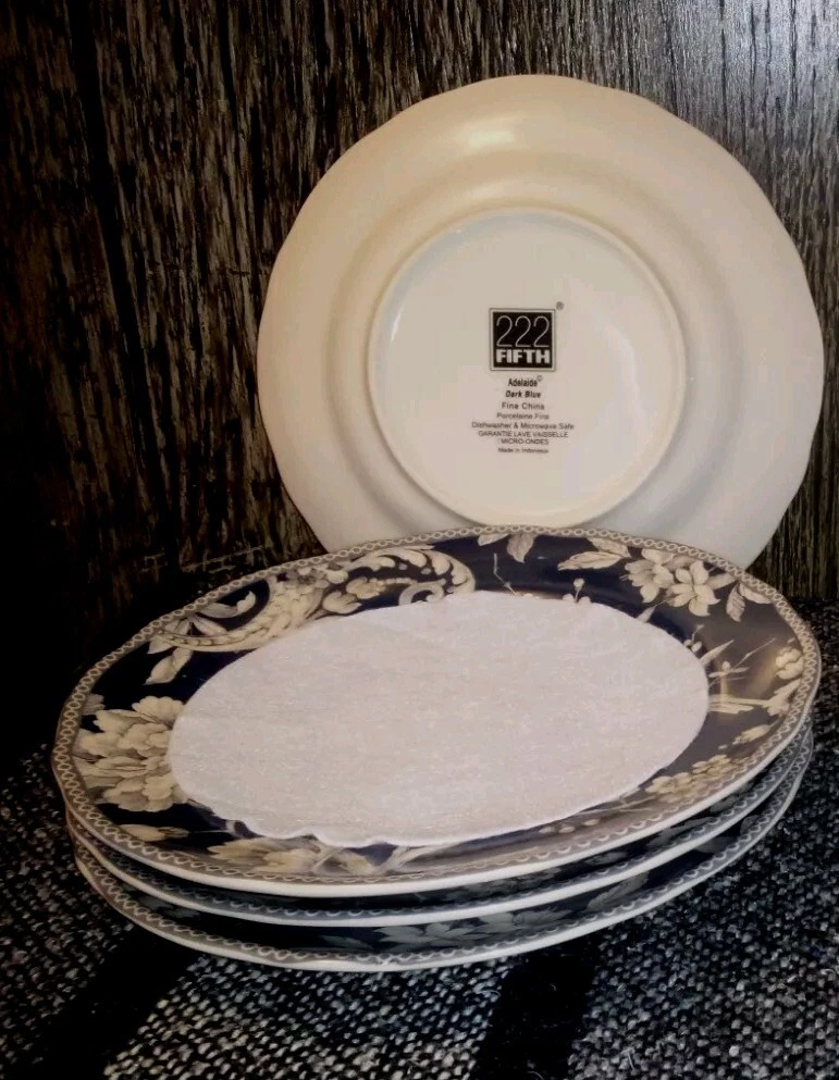 Add a touch of elegance to your dining table with this set of four round salad plates from 222 Fifth. The plates feature a beautiful Adelaide pattern with a glossy finish, perfect for all occasions. The plates are microwave and dishwasher safe, making them easy to use and clean. Crafted from high-quality porcelain, these plates are durable and perfect for everyday use. The set includes four plates with a length of 8.5" and a width of 8.5". The plates are part of the Cottage product line, manufactured in Indonesia using pottery techniques. The set comes with care instructions, and the plates have a printed backstamp.