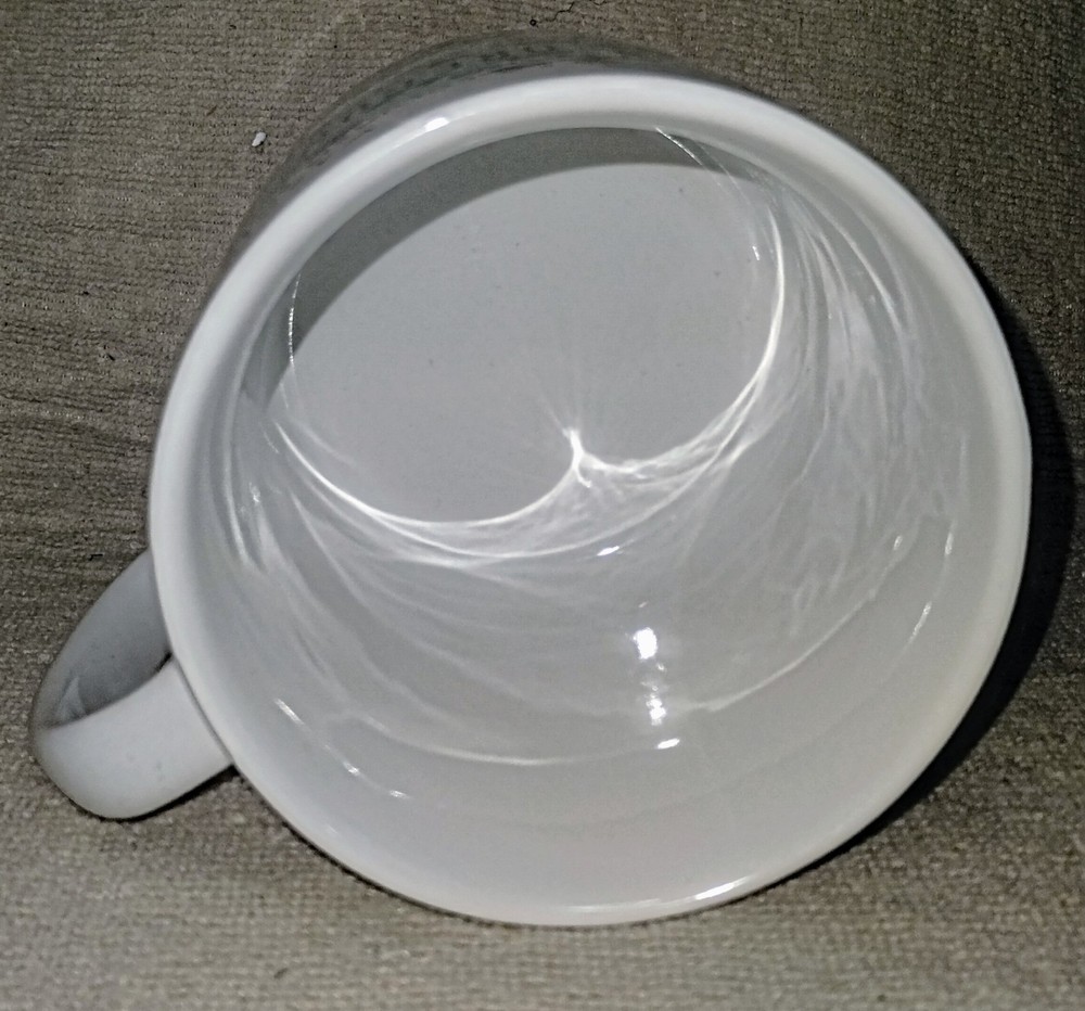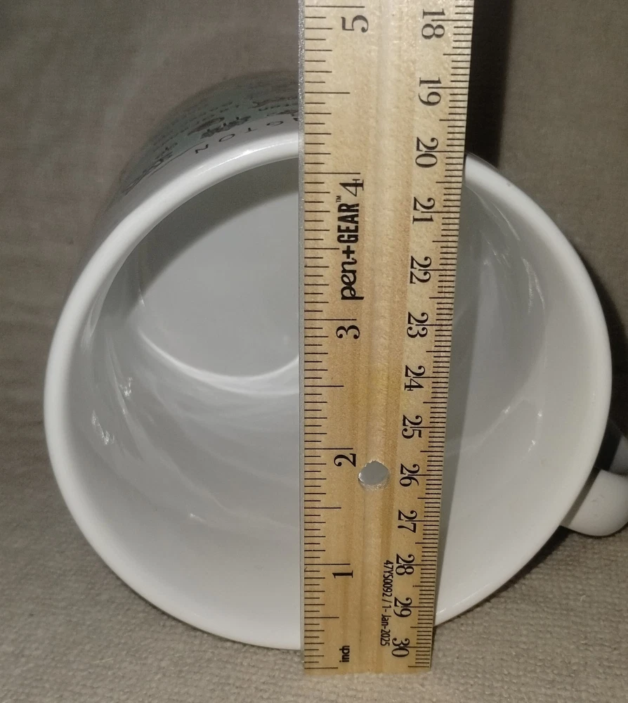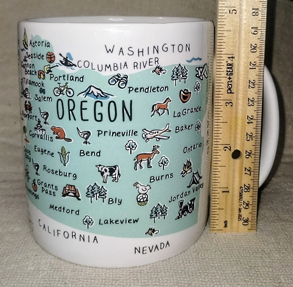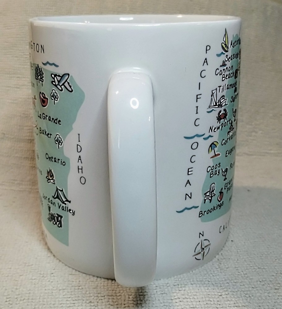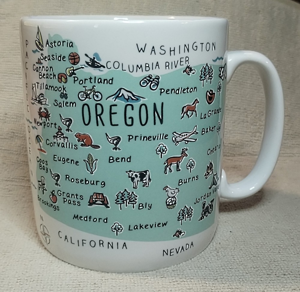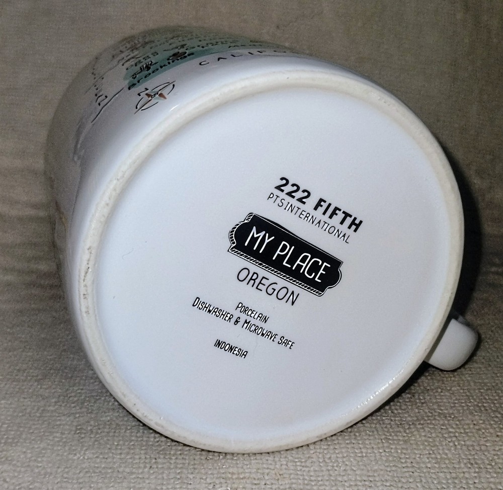 The 222 Fifth My Place Oregon State USA Map Mug is a large 28 ounce jumbo mug featuring a round shape and a white color with a painted state map design. Made from ceramic and porcelain, this mug is suitable for both hot and cold beverages and is dishwasher and microwave safe. It is a collectible item that would make a great addition to any kitchen or home decor, perfect for all occasions. The mug is branded by 222 Fifth and showcases a topographical and souvenir theme, making it a unique and eye-catching piece for coffee or tea lovers. This mug is listed as used because it is pre-owned but appears to be unused it is in new condition inside and out.