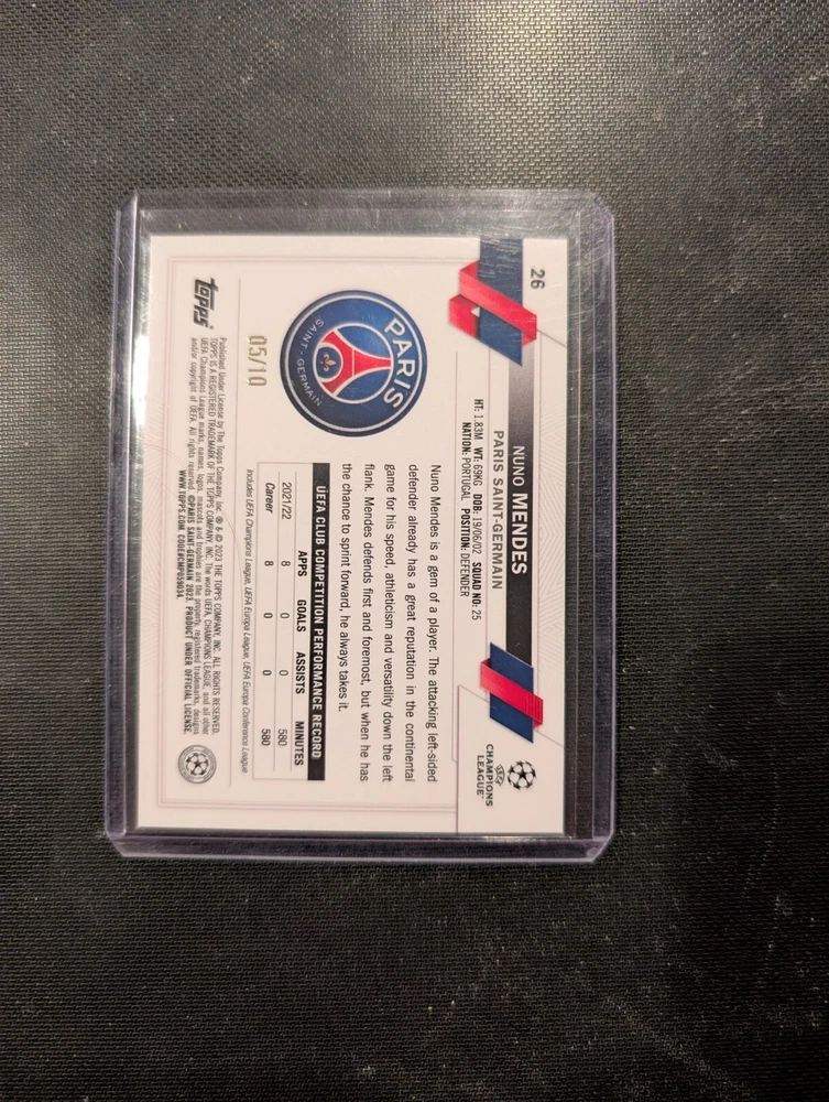 Dive into the world of sports memorabilia with the exclusive 22/23 Topps UEFA Club Competitions Future Stars Icy Black Foil card, featuring rising soccer star Nuno Mendes. Limited to a mere 10 prints, this serial-numbered collectible is a must-have for enthusiasts and fans of Paris Saint-Germain. The card captures the essence of the UEFA Champions League season with its striking Icy Black Foil parallel variety, adding a unique flair to your collection. Honour your passion for the game and admiration for Nuno Mendes with this original Topps sports trading card from the 2022-23 series. It's a tangible piece of sports history that celebrates the talent and promise of this young athlete. Whether for display or as a treasured keepsake, this card is an exceptional find for collectors and fans alike.