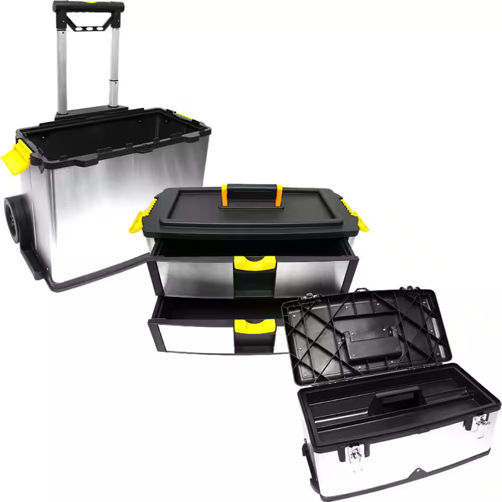 Fast Shipping On All Items 30 Days Money Guarantee Customer Support Excellent Service 100% Satisfaction Satisfaction Guaranteed 22.25 In. W 3-Drawer Stainless Steel Portable Rolling Tool Box - Upright Chest with Extending Handle Specification Color Family Silver Color/Finish Stainless Steel Features No Additional Features Holding Capacity (cu in) 71 cu in Included Accessories No Additional Items Included Material Steel Number of Drawers 3 Drawer Number of Shelves 3 Shelves Number of Trays 2 Tray Returnable 90-Day Tool Storage Product Type Tool Cart Tools Product Type Tool Storage Weight Capacity (lb) 38 lb Nominal Width (in) 15 in Product Depth (in) 22.25 in Product Height (in) 33 in Product Width (in) 15 in 15.0 inches x 22.25 inches x 33.0 inches. Weight: 38.0 lb Item Description 3-in-1 mobile workstation with detachable toolboxes Rubber wheels and telescopic handle for easy mobility Made of stainless steel and rugged ABS plastic Stay organized while transporting tools and materials to the jobsite with the 3-in-1 Detachable Mobile Work Box by Ryland Supply. This stainless-steel unit features a toolbox with a removable tray and 2 latches on top, a chest with 2 pull out drawers for larger tools in the center, and a deep storage case on the bottom for heavier parts, hard hats, or power tools. The upright workstation has two 5.75 in. rubber wheels and a pull handle that extends for easy and comfortable mobility indoors and outdoors. About us We offer the best prices around on high quality products. Our E-store includes media such as books, movies, music and games while offering electronics, toys, sporting apparel, clothing, tools, general home, garden items and more. Shipping We are always working hard to ensure your package arrives as soon as possible. Please understand that some factors like weather, high postal traffic, and the performance of shipping companies are outside of our control. We offer free shipping to the lower 48 states and ship within 2-3 business days of payment, usually sooner. We do not accept P.O. Boxes. Please provide a physical address. For shipping outside of the continental USA, we only use eBay's Global Shipping Program.The item is shipped to KY and then sent to the rest of the world. International customers are responsible for all duties and taxes. Continue to check out to calculate costs for shipping the item to your country. Messages regarding eBay's Global Shipping Program MUST be directed at eBay EXCLUSIVELY. Returns We offer a 30-Day Return Policy on items in which you are not completely satisfied with. You have the option of a full-refund or an exchange of the item. No returns are available on items shipped outside of the USA Satisfaction We try over very best to make sure every customer is completely satisfied. If there's a problem, message us! We're happy to help. Payment Options Shop With Confidence