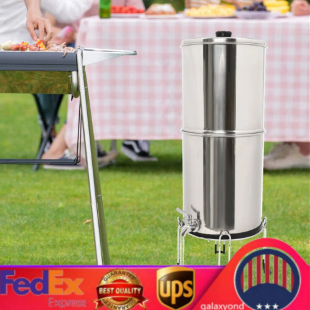 Package Included 1 * Gravity-fed Water Filter System 2 * Cartridges All Accessories for Installation 2.25 Gallon Gravity-fed Water Filter System Fiber Filters Washable US 20.07*8.85 Description The gravity-fed water filter system removes suspended solids, turbidity, parasites, disease-causing bacteria , residual chlorine, and more to provide great-tasting water for the whole family. It is also a highly efficient water filter that does not require electricity and utilizes gravity, making it ideal for those who want to improve the quality of their drinking water with a highly portable, easy-to-use system. Key Features Sturdy and Durable: This product is mainly made of food-grade 304 stainless steel and is finely polished, which is rust-proof, leak-proof, and BPA-free . Clean and Hygienic: The high stand(6.3 inches) keeps the product away from the floor, thus making it more hygienic. The two cartridges with 0.01 µm pore size utilize 3-stage filtration (activated carbon, silver ion, hollow fiber UF membrane), effectively filtering chlorine, pollutants, sediment, heavy metals, plastic, and more, bringing more protection to each stage, and providing clean water of up to 6,000 gallons for the whole family. Emergency Use: The electricity-free design, gravity filtration system, and lightweight make this product easy to take on the go and suitable for natural disasters, camping, or everyday use. It works independently of the plumbing system, giving you the freedom to install it anywhere. Humanized Design: The gravity-fed water filter system is divided into two chambers. The upper chamber can be filled with unfiltered tap water, while the lower chamber can be filled with filtered purified water, thus making the water safer and healthier. Large Capacity: The 2.25gal capacity makes this product filter and store more water at one time, meeting the water needs of the whole family while traveling. High Stability: The non-slip bottom design of the bucket, the stopper around the bracket, and the non-slip feet of the bracket can effectively enhance the stability of the product, ensuring good performance even outdoors. Easy to Install: The product can be installed without tools by rotating the double buckets clockwise, and you only need to unscrew the hexagonal screws to change the faucet quickly, even inexperienced users can install it quickly. Effortless Cleaning: Simple product structure and polished smooth surface make the product easy to clean with a wet rag. Details Round Handle: The round handle of the bucket lid is easy to grip, thus making the product easier to open and close. Faucet: It is durable and sturdy while avoiding leakage and allowing you easily and conveniently take water. Rounded Corners: The rounded corners protect you from abrasions during use, thus providing you with a higher level of safety. Application This product is a great water purification system for small kitchens, apartments, college dorms, or outdoor activities such as camping and picnics. Specification Color: Silver Process: Polished Material: 304 Stainless Steel Assembly Required: Yes Mounting Type: Free Standing/Countertop Filter Cartridge Type: 2* carbon fiber Filter Cartridges Capacity: 8.5L/2.25gal Product Size(H*φ): 51*22.5 cm/ 20.07*8.85 in Bracket Height: 16cm/6.3in Gross Weight: 4kg/ 8.82 lbs Package Size: 31*29*40.5 cm/ 12.2*11.42*15.94 in Package Included 1 * Gravity-fed Water Filter System 2 * Cartridges All Accessories for Installation Notes Please remove the protective films on the two cartridges before using them. Please do not add tap water to the upper chamber when the lower chamber is filled with filtered water, otherwise, the water will leak out. Please flush the filter for several minutes before use, if the faucet is not fully compatible, splashing may occur but won't affect the product. After installing the filter, do not use the first 6 gallons of water that passes through the filter. Instead, let the water run freely and do not use it for any purpose. This will flush out any loose carbon dust and other particles that may have accumulated in the filter during transportation or storage. After flushing out the first 6 gallons of water, the filter will be ready for all your water filtration needs. You can clean the cartridge once a week or once a month depending on the water quality and frequency of use. Proper cleaning of the cartridge will reduce secondary contamination and extend its life. Please do not use any detergent when cleaning the cartridge as this may cause clogging. A noticeable decrease in water flow may be caused by a buildup of deposits on the surface of the cartridge, so you can try cleaning the cartridge. Please allow the slight color difference caused by the shooting light and the 1-3 cm error due to manual measurement, and make sure you do not mind before ordering. Payment Delivery details Terms of sales About us Contact us Payment We accept ebay payment 。 Fees such as import duties, taxes are not included in the item price or shipping costs. These charges are the buyer's responsibility. Delivery details Shipping: 2-9 working days to: USA Terms of sales We maintain high standards of excellence and strive for hundred percent customer satisfaction. Feedback is very important to us. We hope that you contact us immediately before you give neutral or negative feedback, so that we can address your concerns. It is impossible to address issues if we do not know about them! About us Your satis faction is our ultimate goal. We work hard to earn your trust and future business. Our certified technicians have tested each item before shipping. The unit comes with 1 year limited warranty on all manufacturing defects. a) If you receive a defective item, you may return it or ask for a discount. Please contact us within 14 days after you receive the package. b) What you returned must be intact and in its original packaging as re? u. Customer is responsible for shipping costs of the returned item. c