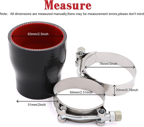 Straight Reducer Coupler Silicone Hose ID 2inch to 2.5inch 4-Ply with Stainless Steel T-Bolt Clamp for Turbo/Intercooler/Intake Piping Description Features: Coupler Size: 2 to 2.5 inches(51mm to 63mm),Made of High Temp Reinforced Pure Silicone 4-Ply Reinforced High Temperature Silicone Coupler and The hose material is high quality silicone, many color and size to choose Min temperature: -60 C/-140 F. Max temperature: 230 C/428 F. Bursting pressure: 2MPA.Length 3" (76mm), Thickness: 5mm Includes 2pcs Stainless Steel T-bolt clamps Perfect for air intake, intercooler piping and other turbo applications. Product Details: Brand: Taukealugs Material: Stainless Steel, Silicone Color: Straight Item Weight: 0.1 Pounds Nominal Wall Thickness: 5 millimeters Item Length: 3 Inches Manufacturer: Taukealugs Item Weight: 1.6 ounces Exterior: Stainless Steel Manufacturer Part Number: ?YHGFDHS0593Z Brand: Taukealugs Material: Stainless Steel, Silicone Color: Straight Item Weight: 0.1 Pounds Nominal Wall Thickness: 5 millimeters Item Length: 3 Inches Manufacturer: Taukealugs Handling We will ship all orders within 3 business day of payment. Delivery We Do Not Ship Outside of the Continental US. Return Policy All items qualify for returns within 30 days of receipt. Buyer is responsible for return shipping on any item that is not damaged. Feedback We take our reputation seriously, we buy and sell online, so we understand the value of trust. If you are unsatisfied with your order, please contact us and we will work with you to resolve it to your satisfaction.