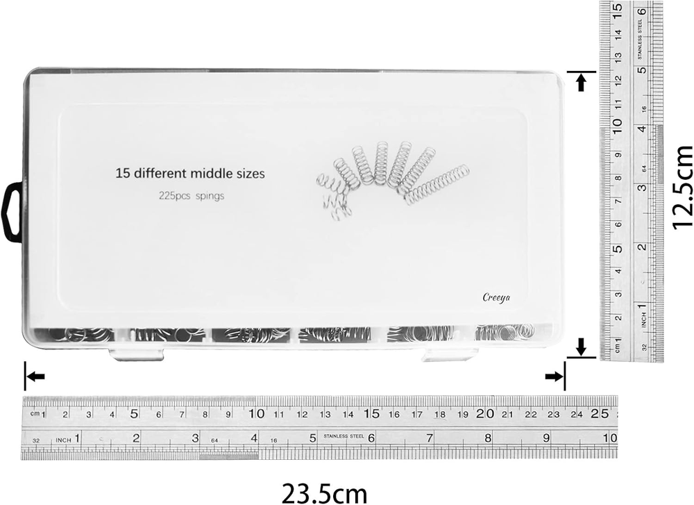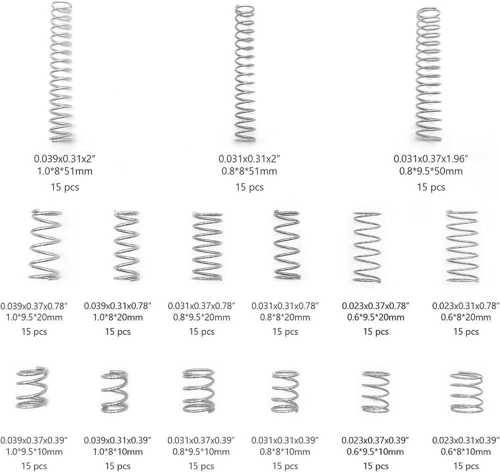 Store New Arrivals Add to Favorite View Feedback 225Pcs Small Compression Spring Assortment, 15 Different Sizes, Wire Diameter 0.6Mm 0.8Mm 1Mm, Outer Diameter 8Mm 9Mm 9.5Mm, Length 10Mm 20Mm 50Mm for Repair Replacement Description Item model number CREEYA007 Assembly required No Batteries required No Item Weight 7 ounces Manufacturer CREEYA Package Dimensions 9.29 x 4.8 x 1.77 inches Size B KIT This order saves you from having to drive to the hardware store every time the spring is interrupted, and the box is arranged for you to complete storage. 15 Kinds Size: the first one is wire diameter, second is outer diameter, 3rd is overall length. 0.023"x0.315"x0.39", 0.023"x0.315"x0.78", 0.023"x0.370"x0.39", 0.023"x0.370"x0.78", 0.031"x0.315"x0.39" , 0.031"x0.315"x0.78" , 0.031"x0.315"x2.00" , 0.031"x0.37" x0.39" , 0.031"x0.37" x0.79" , 0.031"x0.37" x1.96" , 0.039"x0.315"x0.39" , 0.039"x0.315"x0.78" , 0.039"x0.315"x2.00" , 0.039"x0.350"x0.39" , 0.039"x0.350"x0.78" Fit most use: We hope these springs are really nice collection to have on hand for most repair project, such as doors, curtain, automobiles, Watering can, piano, scissors, electrical equipment, repair tools, umbrella, kettle, razor, aircraft, antique tape recorder, repair toy, pliers, Cheese compressor, 3D printer and so on. 304 Stainless steel: which can not rust in humid environment and have strong oxidation resistance, acid resistance and corrosion resistance, have more times of expansion and contraction Inappropriate springs reduce comfort and even damage your belongings. We provide springs of similar size to better fit the location of use. Product Description Package Details: Compression springs include: 225 pcs,15 kinds Size: the first one is wire diameter, second is outer diameter, 3rd is overall length. ------------------------------------------------------------------------------- 0.023"x0.315"x0.39" --(0.6x8x10mm)--------15Pcs 0.023"x0.315"x0.78" --(0.6*8*20mm)--------15Pcs 0.023"x0.370"x0.39" --(0.6*9.5*10mm)------15Pcs 0.023"x0.370"x0.78" --(0.6*9.5*20mm)------15Pcs --------------- 0.031"x0.315"x0.39" --(0.8*8*10mm)--------15Pcs 0.031"x0.315"x0.78" --(0.8*8*20mm)--------15Pcs 0.031"x0.315"x2.00" --(0.8*8*51mm)--------15Pcs 0.031"x0.37" x0.39" --(0.8*9.5*10mm)------15Pcs 0.031"x0.37" x0.79" --(0.8*9.5*20mm)------15Pcs 0.031"x0.37" x1.96" --(0.8*9.5*50mm)------15Pcs --------------- 0.039"x0.315"x0.39" --(1*8 *10mm)------15Pcs 0.039"x0.315"x0.78" --(1*8 *20mm)------15Pcs 0.039"x0.315"x2.00" --(1*8 *51mm)------15Pcs 0.039"x0.350"x0.39" --(1*9.5*10mm)------15Pcs 0.039"x0.350"x0.78" --(1*9.5*20mm)------15Pcs ------------------------------------------------------------------------------- Hey, We are always here waiting for your question. Because Only for compression springs, there are thousands of sizes. you have difficult to find the right springs, please let us help you. The known usage scenarios are as follows: Cheese compressor, Construction, cars, shops, airplanes, machinery, electrical appliances, furniture, 3D printer, Faucet, Rabbit cage, Embedded lighting equipment, Guitar stand, Useful compartment bracket in the box, Guitar neck pickup, Foot of drum machine, Convenient tool kit to carry with you, Replacement spring for outdoor doors, Handle of fence gate, The spring on the battery charger is broken, Suitable for small engine repair, Thrust valve for cart and water cooler, Small engines and even carburetor work, Small DIY projects around the apartment, mouse, Prosthetic project, Camper door, latch, garage, Rocker ABOUT US We offer the best prices around on high quality products. Our E-store includes media such as books, movies, music and games while offering electronics, toys, sporting apparel, clothing, tools, general home, garden items and more. SHIPPING We are always working hard to ensure your package arrives as soon as possible. Please understand that some factors like weather, high postal traffic, and the performance of shipping companies are outside of our control. We offer free shipping to the lower 48 states and ship within 2 business days of payment, usually sooner. We do not accept P.O. Boxes. Please provide a physical address. RETURNS We offer a 30-Day Return Policy on items which you are not completely satisfied with. You have the option for a full-refund or an exchange of the item. No returns are available on items shipped outside of the USA. PAYMENT We accept PayPal. CONTACT US This page content is yet to come Please ad us to your favorite seller and visit again later Thank You
