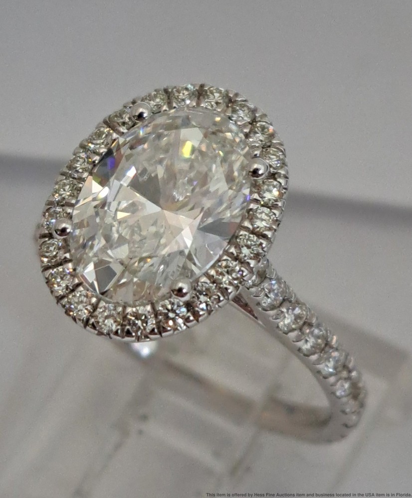2.25ct Lab Grown Oval Center .56ct Diamond Mount 14k Gold Engagement Ring 2.25ct Lab Grown Oval Center .56ct Diamond Mount 14k Gold Engagement Ring Click images to enlarge Description Described & Photographed By: Mike NGDD 70959 Title: 2.25ct Lab Grown Oval Center .56ct Diamond Mount 14k Gold Engagement Ring Description: Stunning! Make it yours today. Happy bidding! Here are the specifications Please note; all stones graded, measured & calculated while mounted Type of Jewelry: Ring Gemstones: Diamond Approx. Measurement or Weight of Stones: One oval cut 10x7mm Diamond totaling approx. 2.25cts Twenty Two round cut 1mm Diamonds totaling approx. .11cts Thirty round cut 1.5mm Diamonds totaling approx. .45cts Total Diamond weight approx. 2.81ctw Clarity: VS2-SI1 Color: E-G Mounting Metal: 14k White Gold Approx. Size or Length: 5.25 Stamps or Factory Markings: 14k Total Weight of Item: 2.7 grams Condition: Gold shows very minor toning or wear. All stones are well secure and intact. Estimated size of package: 7.5in X 5.5in X 3.5in Estimated total weight of package: 8 oz Please Note: If the winning bidder would like to arrange to pick up their item at our store then please notify us by email & we will make the appropriate shipping adjustments. Condition: Pre-owned - Excellent Condition Notes: Described & Photographed By: Mike NGDD 70959 Title: 2.25ct Lab Grown Oval Center .56ct Diamond Mount 14k Gold Engagement Ring Description: Stunning! Make it yours today. Happy bidding! Here are the specifications Please note; all stones graded, measured & calculated while mounted Type of Jewelry: Ring Gemstones: Diamond Approx. Measurement or Weight of Stones: One oval cut 10x7mm Diamond totaling approx. 2.25cts Twenty Two round cut 1mm Diamonds totaling approx. .11cts Thirty round cut 1.5mm Diamonds totaling approx. .45cts Total Diamond weight approx. 2.81ctw Clarity: VS2-SI1 Color: E-G Mounting Metal: 14k White Gold Approx. Size or Length: 5.25 Stamps or Factory Markings: 14k Total Weight of Item: 2.7 grams Condition: Gold shows very minor toning or wear. All stones are well secure and intact. Estimated size of package: 7.5in X 5.5in X 3.5in Estimated total weight of package: 8 oz Please Note: If the winning bidder would like to arrange to pick up their item at our store then please notify us by email & we will make the appropriate shipping adjustments. Payment Paypal Shipping Shipping Options: Domestic shipping: Weight based Shipping Charges. Domestic Carriers are: Usps Ground Advantage, Usps Priority I will ship to: United States Weight: 8 oz. Shipping and Handling: Please check eBay's Shipping & Payment tab Customer Service Policy: Please note in bidding or buying this auction you are entering into a binding contract. In bidding or buying you are agreeing to all policies stated below and comply with Florida State laws. Sales Tax applies to all Florida sales unless you have a valid dealers license. Legal Shipping High value items require restricted delivery with only the addressee being able to sign for it. * Shipping is calculated by eBay and shown in the auction. Legal Jurisdiction. HessFineAuctions is a division of Hess Fine Art, and is registered in Pinellas County, FL, USA. It is agreed that all parties will abide by the laws of the State of Florida in all matters relating to this agreement. And that in the case of any dispute, the legal jurisdiction of resolution shall be Pinellas County, Florida. The buyer acknowledges that any items not returned within 30 days of receipt of the refund will be deemed appropriated by the buyer and buyer also acknowledges their intent to deprive from seller, either temporarily or permanently, the right to the property or the benefit from the property. Resale certificates must match buyer name or company and address * The auctions contain only what is described. Do not assume something comes with a used item if it is not stated in the auction verbiage. Many items will be marked with serial numbers or identifying numbers items may not be accepted for return if these numbers are not present. * Photographs often disclose condition far better than verbiage as many people have different ideas on what terms may mean. * If an identifying mark, inclusion or defect is visible in the images it is considered DISCLOSED to the buyer. * Gold items have been tested with a Kee gold tester M-509GM and tested as stated in the auction. * All Items are shipped insured. If an item has arrived damaged we will require images and a damage affidavit. CUSTOMS AND INTERNATIONAL BIDDER POLICIES International bidders - you are agreeing to the following when you place a bid with us: * If your total purchase including shipping exceeds $200.00 US and you pay with a credit card then your only delivery option is UPS signature delivery. This is because credit cards require both a signature and tracking. * If you pay with PayPal and the total price including shipping is less than $750.00 US then we can ship USPS to most countries. Please contact us with eBay?s message system before you pay for an amended invoice. * The following applies if you are shipping to or from these countries. CANADA, Australia, Belgium, Brazil, Croatia, Denmark, France Germany, Great Britain and Northern Ireland, Israel, Netherlands New Zealand Spain and Switzerland, Estonia, Finland, Gibraltar, Hungary, Italy, Latvia, Lithuania, Luxembourg, Malaysia, Malta, Portugal, and Singapore. We will be able to offer you USPS International shipping if you are paying with PayPal and the item and shipping are less than $750.00 US. We may be able to ship 1st Class USPS International if you are shipping to or from the countries listed above. * If you wish your item sent to a colleague with a US address we are of course willing to do so but the address must be verified with PayPal Credit card company and in the eBay invoice. * We declare all items for the winning bid amount. * It is common for countries to charge some form of customs duties,