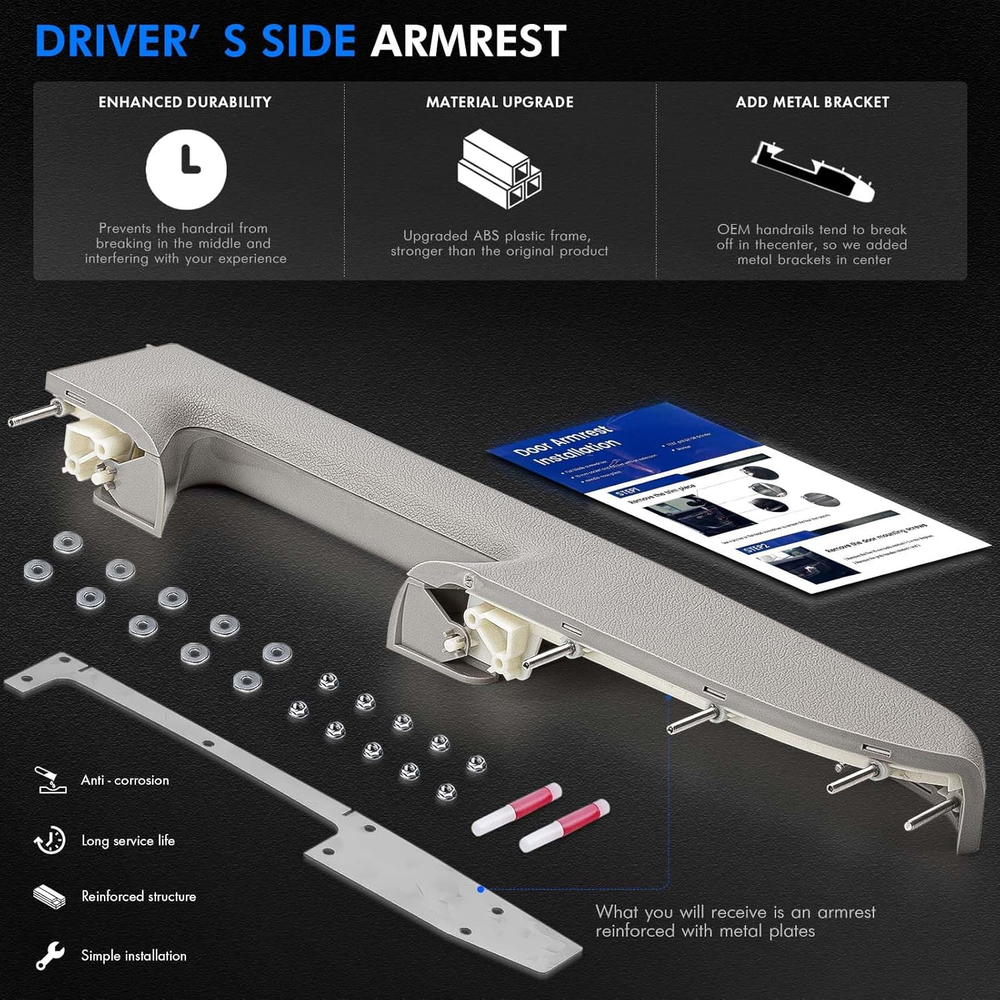 [Vehicle Models]: Compatible with Chevrolet Silverado 1500 2010-2013, Silverado 2500 HD 2010-2014, Silverado 3500 HD 2010-2014; Compatible with GMC Sierra 1500 2010-2013, Sierra 2500 HD 2010-2014, Sierra 3500 HD 2010-2014 / 2010 2011 2012 2013 2014 [Replace Part Number]: Front Driver Side Interior Door Trim Panel Replace for GM# 22818466, 20874801, 20920831, 20924567, 23402965, 22818468, 20874803, 20920833, 20924569 [Adding Metal Brackets]: Since the OEM inner door panel armrests are prone to breaking in the middle, we use an upgraded ABS plastic skeleton and add a metal bracket in the middle of the armrest. This ensures a longer lasting repair compared to the original plastic design [Enhanced Comfort and Aesthetics]: The front driver-side inside door panel pull handles is specifically designed for vehicles door panels with a door release handle below the armrest, enhancing driver comfort while improving the overall aesthetics of the interior. You can choose accessories that match the color of your door or experiment with a unique mix-and-match look, different from the original setup [Ease of Maintenance]: You can replace just the door armrest instead of the entire door panel. Note: ONLY fit for door panels with a door release handle below the armrest [Buy with Confidence]: We sincerely appreciate the purchase of our Front Left Driver Side Armrest Repair. If product has any quality issues, you can request to send a new product, we value your shopping experience Product description