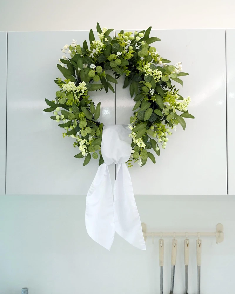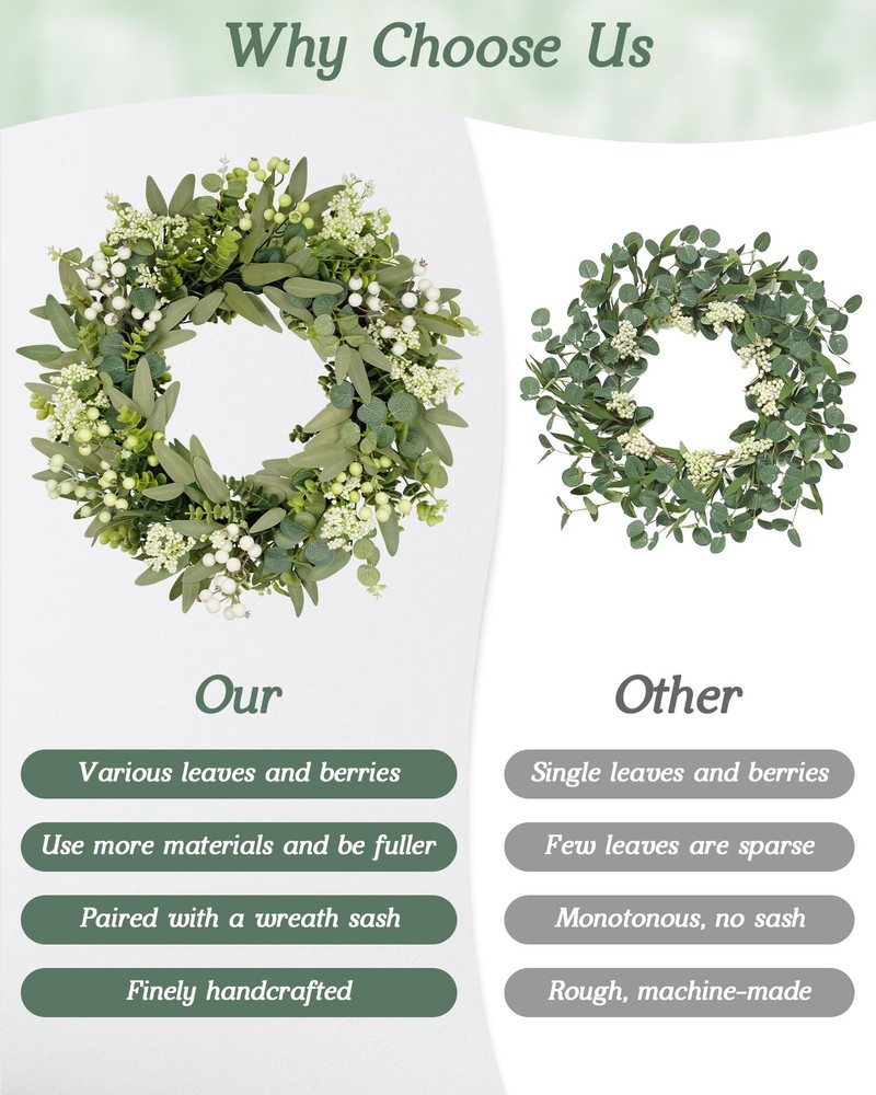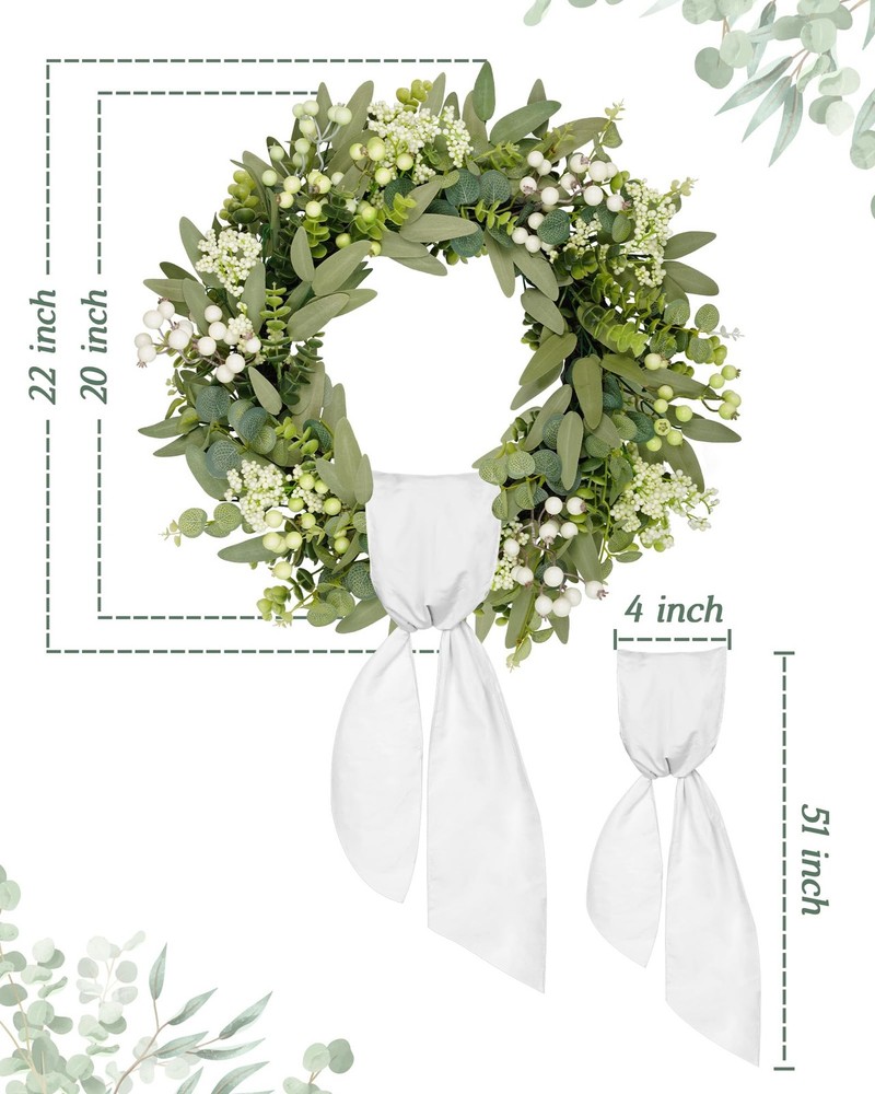 Artificial Eucalyptus Wreath 【All year round wreath】Available all year round:spring, summer, fall, and winter. Add themed decorations according to the festival, this is a flexible and versatile wreath. 【Full and realistic】 's handmade green eucalyptus wreath features eucalyptus leaves, boxwood, white/green berries, andmany small berries embellishedon it, making the wreath full, natural and realistic. Its elegance add a vibrant and pleasant vibe to your home. 【Perfect Size】 This spring wreath is 22 inches in diameter. Each rustic farmhouse eucalyptus wreath is packed in a sturdy and exquisite box, suitable as a gift for friends. Note that because the wreath is compressed by the box to avoid being damaged during delivery, please fully stretch it to reach its maximum size. 【Versatile】This gorgeous wreath is a versatile decoration. It is suitable for all seasons of the year, spring, summer, fall and winter. You can add elements from each season, such as bells and pinecones, to turn it into a Christmas wreath. When you design it yourself, you will find that your wreath is the most unique scenery. It can be hung on the wall, front door, porch, bedroom, living room, etc. It is perfect for indoor and outdoor, weddings and parties. It's elegance is sure to impress your family and friends. 【Durable】Made of high-quality materials. Colors will never fade; leaves will never fall; berries will never rot. No watering and special cleaning required. Can be used for years to come. 【Christmas Wreaths】This eucalyptus wreath with berries can be turned into a Christmas wreath by tying a red bow, pairing it with pinecones, bells, and some red berries. It will stay with you all winter long. 【TIPS】 If you have any problem with our products, please contact us immediately,we will reply you ASAP.