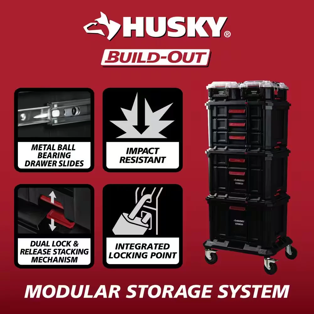 Fast Shipping On All Items 30 Days Money Guarantee Customer Support Excellent Service 100% Satisfaction Satisfaction Guaranteed Build-Out 22 In. Deep Drawer Tool Box Specification Color Family Black Color/Finish Black Features Deep Drawer,Lockable Holding Capacity (cu in) 1983 cu in Included Accessories Drawers Material Plastic Modular Storage Type Medium Box Modular System Type Husky Build-Out Product Weight (lb) 19 lb Returnable 90-Day Tool Box Type Modular Tool Box Tool Storage Product Type Modular Tool Box Tools Product Type Tool Storage Weight Capacity (lb) 50 lb Maximum Handle Length (in) 0 in Product Depth (in) 15.8 in Product Height (in) 16 in Product Width (in) 22.44 in 22.44 inches x 15.8 inches x 16.0 inches. Weight: 19.0 lb Item Description Open interior drawer for large component storage Flat top work area Backside accessory rail The Husky Build-Out Deep Drawer Tool Box is engineered for quick front access to oversized tools. This tool box has a large, open drawer without dividers. The drawer has an independent latching mechanism to stop unwanted opening during transport. With heavy-duty metal ball bearing slides and impact-resistant construction, this drawer features a total loading capacity of 50 lbs. The built-in pass-through security feature with included metal security bar ensure your tools stay safe and secure. Expand your storage system by connecting hooks and other accessories to the integrated accessory rail. The Husky Build-Out system creates customizable modular storage that gets you and your tools to the job site faster. The system includes tool boxes, organizers, crates and accessories, all designed to seamlessly secure together in many different configurations. About us We offer the best prices around on high quality products. Our E-store includes media such as books, movies, music and games while offering electronics, toys, sporting apparel, clothing, tools, general home, garden items and more. Shipping We are always working hard to ensure your package arrives as soon as possible. Please understand that some factors like weather, high postal traffic, and the performance of shipping companies are outside of our control. We offer free shipping to the lower 48 states and ship within 2-3 business days of payment, usually sooner. We do not accept P.O. Boxes. Please provide a physical address. For shipping outside of the continental USA, we only use eBay's Global Shipping Program.The item is shipped to KY and then sent to the rest of the world. International customers are responsible for all duties and taxes. Continue to check out to calculate costs for shipping the item to your country. Messages regarding eBay's Global Shipping Program MUST be directed at eBay EXCLUSIVELY. Returns We offer a 30-Day Return Policy on items in which you are not completely satisfied with. You have the option of a full-refund or an exchange of the item. No returns are available on items shipped outside of the USA Satisfaction We try over very best to make sure every customer is completely satisfied. If there's a problem, message us! We're happy to help. Payment Options Shop With Confidence