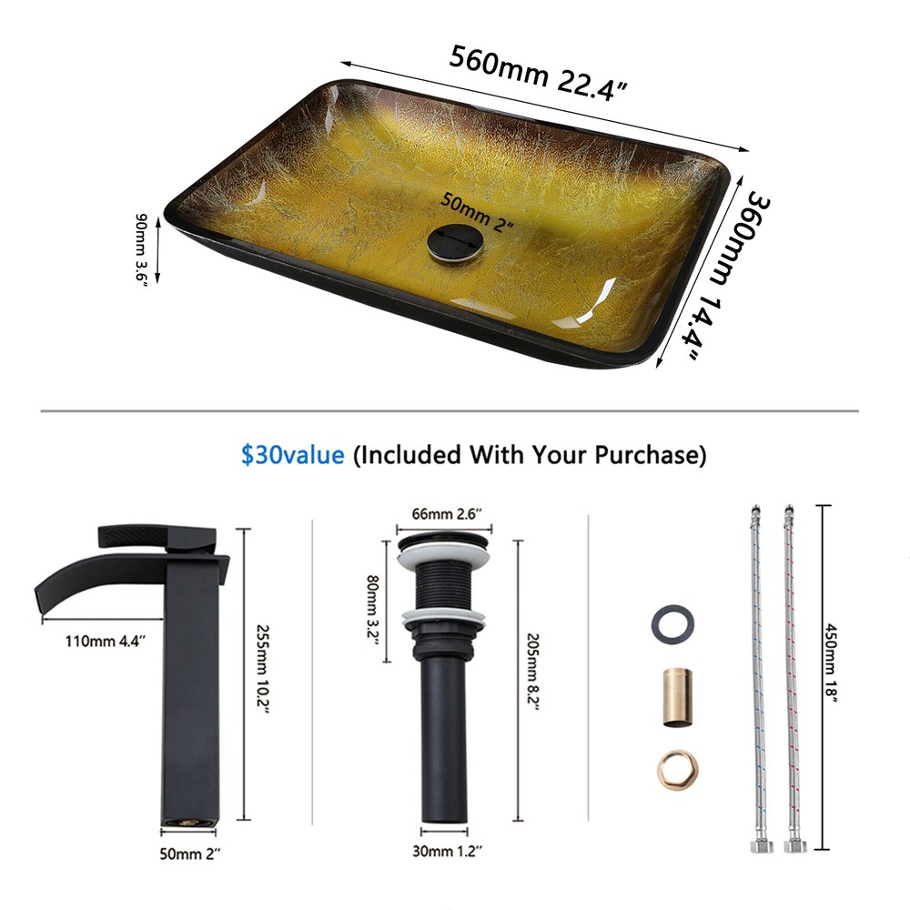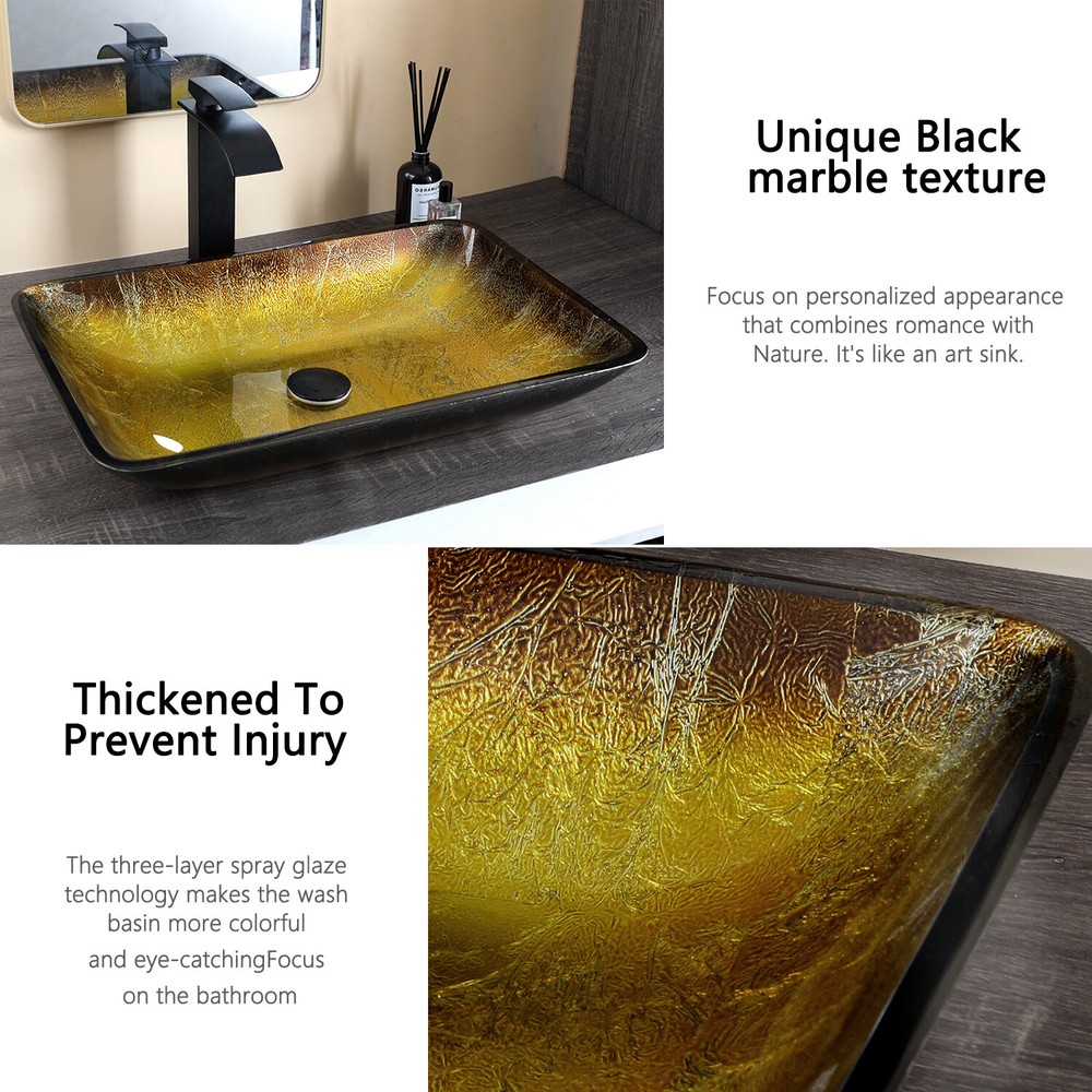 Feature: Modern contemporary design art Function: Bathroom Vessel Sink Sink Material: Stone resin Sink Finish: Yellow&Black Shape: Rectangular Color: Yellow&Black Installation: Above counter/ Freestanding Faucet material: Brass Finish:Yellow&Black Installation: Single hole deck mounted PACKAGE CONTENT: 1 x Vessel Sink 1 x faucet 1 x Drain 22"Rectangle Bathroom Tempered Glass Vessel Sink Bowl Waterfall Faucet Mixer Tap Feature: Modern contemporary design art Function: Bathroom Vessel Sink Sink Material: Stone resin Sink Finish: Yellow&Black Shape: Rectangular Color: Yellow&Black Installation: Above counter/ Freestanding Faucet material: Brass Finish: Yellow&Black Installation: Single hole deck mounted PACKAGE CONTENT: 1 x Vessel Sink 1 x faucet 1 x Drain Payment Delivery details Terms of sales About us Contact us Payment Payment is expected in 3 days after the end of Auction. So we can ship your item ASAP. When you paying with Paypal, please confirm your Ebay and Paypal address. Unpaid auctions must be reported to ebay, contact us if you need to file an extension for any late payment. Delivery details We ship this item from United States , it usually takes 2-8 days for delivery. No delivery to military addresses (Hawaii, Guam additional shipping charges apply) Terms of sales I describe items as well as I can. If I have missed something, please let me know. Please e-mail me before leaving feedback if you are unhappy with your item, so we can work it out. International Buyers – Please Note: Import duties, taxes, and charges are not included in the item price or shipping cost. About us Comes with 2 years manufacture warranty Exchange on defective item within 7 business days after the product is delivered. Shipping damage has to be reported within 5 business days of which the product was delivered. Contact us If you have any questions, please be free to contact with us, we will answer your questions ASAP. We will answer your question via email, please check your email for the answers. Our business time is from Monday-Sunday/8:00AM – 22:00PM