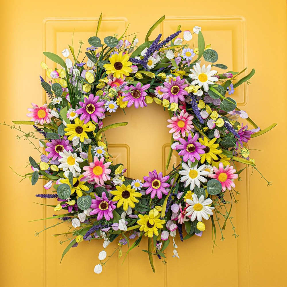 All our products have quality ,if you have any questions or problems with our products,please feel free to ,we will help you to solve the issues as soon as possible. Information: Our rustic wildflower wreath has an inner diameter of 10 inches and an outer diameter of 22 inches. In order to obtain a good display effect, please fully expand the branches of the spring wreath for front door after receiving it Handmade: The floral branches on our spring flower wreaths are fixed by hand, so they are very firm. Even if you shake them after receiving, the branches on the summer door wreath will not fall off, so you can hang our wildflower wreath for a long time Attractive: Spring door wreath as the first impression for guests. Our spring wreath for front door features colorful daisy flowers, Hanging our spring flower wreaths not only attracts the attention of visitors, but also sets good expectations for our home Convenient: As an important part of spring decoration, our colorful spring flower wreaths are very convenient and quick to use. You only need to hang our spring flower wreaths on the front door to enjoy the rich spring atmosphere Note on spring wreath for front door : When using the wildflower wreath, please try to use our colorful spring flower wreaths indoors and avoid prolonged with water. When using it outdoors, please pay attention to rain and wind protection