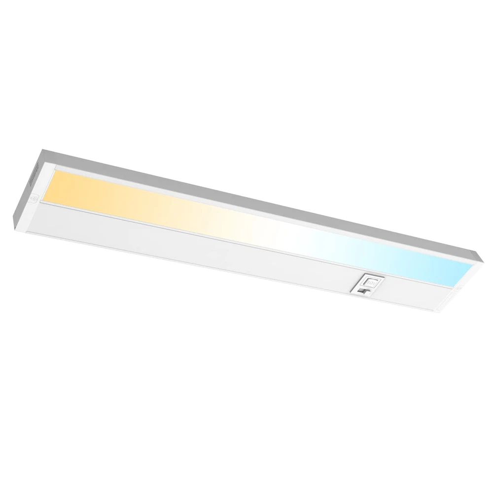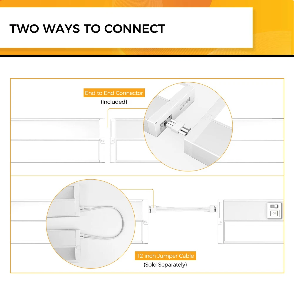 Hardwired or Plug in: Replace the regular fluorescent fixture above kitchen sink and under cabinet with this cabinet lighting. Slim enough to be concealed by cabinet trim, this surface mount luminaire can be hardwired to maintain your seamless aesthetics or plugged in convenience. 5 Color Temperature Adjustable: LED under cabinet lighting hardwired with a CRI 90+ is perfect for a hidden backlight. They have TWO intensity settings (low/high) to swap easily. This fixture has five colors to meet your different needs: 2700K, 3000K, 3500K, 4000K or 5000K just with a simple switch. Linkable & Dimmable: You can use the included in-line connectors or 12" jumper cables (Sold separately) to link maximum 72pcs of lights together. When used with compatible dimmers, this LED under cabinet light can smoothly dim from 10% to 100%, the brightness can be adjusted according to the change of environment to achieve the best lighting effect. No Flicker, no Buzzing: The 90+ CRI of this plug in under cabinet light is great for making food look vivid and natural. And the brightness of these under counter lights will not do any harmful on your eyes and you will not get eye fatigue when these under cabinet led lights turning on all the time. Durable & Safe: This under lights for cabinets has meet the strict requirement of ETL and energy star certificated. The life span can be up to 50000hrs, it has the same brightness just at a fraction of the electricity used by fluorescent. Energy efficeient enough it will save almost 90% on your electricity bills.