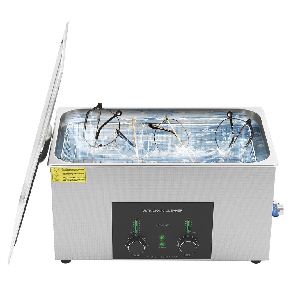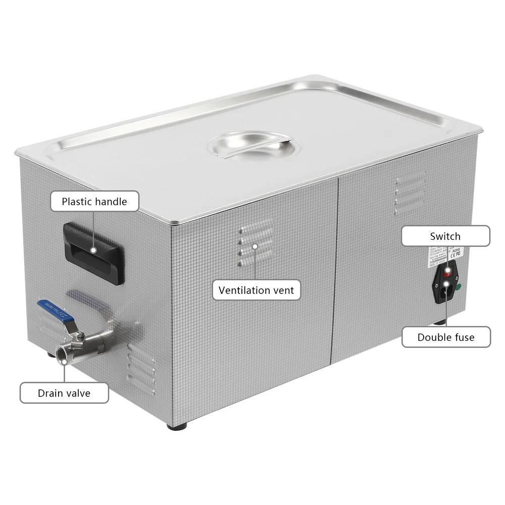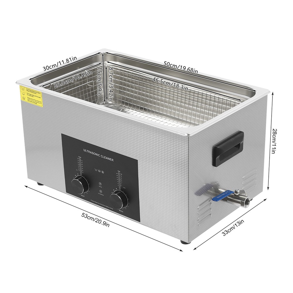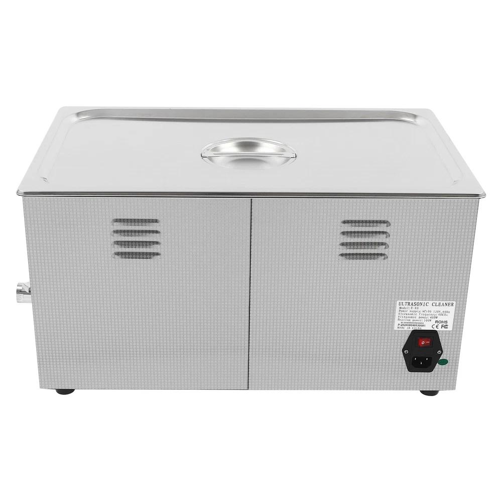 Specifications Color: Silver Style: Modern Shape: Rectangular Material: 304 Stainless Steel, 201 Stainless Steel Mount Type: Countertop Assembly Required: Yes Plug Type: US Standard Power Supply: AC100-120V, 60Hz Ultrasonic Frequency: 40Khz Ultrasonic Power: 480W Heating Power: 500W Power Cord Length: 1.5m/4.92ft Temperature Range: 15-80℃/59-176℉ Time Setting Range: 1-60min Inner Capacity: 22L/5.81Gal Effective Capacity: 17.5L/4.62Gal Drain Valve Diameter: 1/2" Product Inner Size: 50*30*15cm/19.69*11.81*5.9in Cleaning Basket Size: 46.5*26.5*8.7cm/18.3*10.43*3.43in Packaging Size: 66*42*35.5cm/25.98*16.54*13.98in Gross Weight: 12.47kg/27.49lbs Net Weight: 10.4kg/22.93lbs Package Included 1* Ultrasonic Cleaning Machine 1* Cleaning Basket 1* Power Cord 1* English Ultrasonic Jewelry Cleaning Machine 22L Ultrasound Watch Glasses Cleaner 480W US Description~~ Specifications Color: Silver Style: Modern Shape: Rectangular Material: 304 Stainless Steel, 201 Stainless Steel Mount Type: Countertop Assembly Required: Yes Plug Type: US Standard Power Supply: AC100-120V, 60Hz Ultrasonic Frequency: 40Khz Ultrasonic Power: 480W Heating Power: 500W Power Cord Length: 1.5m/4.92ft Temperature Range: 15-80℃/59-176℉ Time Setting Range: 1-60min Inner Capacity: 22L/5.81Gal Effective Capacity: 17.5L/4.62Gal Drain Valve Diameter: 1/2" Product Inner Size: 50*30*15cm/19.69*11.81*5.9in Cleaning Basket Size: 46.5*26.5*8.7cm/18.3*10.43*3.43in Packaging Size: 66*42*35.5cm/25.98*16.54*13.98in Gross Weight: 12.47kg/27.49lbs Net Weight: 10.4kg/22.93lbs Package Included 1* Ultrasonic Cleaning Machine 1* Cleaning Basket 1* Power Cord 1* English Manual Description This ultrasonic cleaner's high-frequency ultrasonic waves can delve into microscopic crevices, breaking down grease and stains adhering to jewelry, spectacles, tableware, braces, and other miniature, intricate items. It features a knob-type timer and temperature control design for a simple operation that simplifies cleaning tasks, bringing technological convenience to your daily life. Key Features Quality and Reliability : The product is made of 304 stainless steel and 201 stainless steel, which is resistant to rust, corrosion, and deformation, giving the product a long service life and excellent working performance. Efficient Cleaning: Different from other cleaning technologies, 40Khz ultrasonic technology can remove dirt on the surface of objects, and penetrate blind holes, and cracks, thus thoroughly cleaning the dirt that cannot be cleaned by hand without damaging your belongings. Moreover, the degas mode can eliminate ultrasonic fatigue and improve cleaning results. Adjustable Design: The product comes with knob-type temperature (59-176℉) and time control (1-60min) to meet the cleaning needs of different objects. Large Capacity: The 4.62gal effective capacity and large cleaning basket (18.3*10.43*3.43 inches) can easily hold and clean most of your watches, jewelry, and more. Efficient Heat Dissipation: The heat dissipation windows and the powerful cooling fan can accelerate heat dissipation, reduce failure rate, and increase service life. Safety Guarantee: The product is equipped with a fuse, when the circuit is overloaded, it will automatically fuse to stop the power supply, avoiding damage to the machine and injury to you. Simple Operation: Equipped with an intuitive and user-friendly operational interface, this product simplifies activation and adjustment of cleaning time and temperature settings, making it accessible to you. Easy to Clean: The fingerprint-resistant stainless steel shell, simple structure, and smooth surface make it more convenient for daily cleaning. Details Cleaning Basket: It can reduce scratches during cleaning to better protect your valuables items, and can also be used to drip-dry items. Side Handles: They make it convenient to move the machine. Drain Valve: It allows you to drain standing water and cleaning fluids more easily. Top Lid: It can well seal the machine to reduce heat loss and noise. Meanwhile, the handle on the top allows you to easily pick up the lid. Sturdy Feet: They prevent the product from sliding and enhance stability during operation. Application It can be used in homes, laboratories, the jewelry industry, industry, electrical industry, hospitals, and more. It is specially used for cleaning jewelry, eyeglasses, watches, dentures, dental instruments, clocks and watches, motorcycle parts, automobile parts, bicycle parts, hardware, tools, engine parts, and more. Notes Please check the size carefully before ordering. Please note that the heating is turned on when the preset temperature is higher than the actual temperature. Please note that the ultrasonic cleaning process can also slowly heat the cleaning liquid, so the temperature of the cleaning liquid is likely to be higher than the preset temperature. 304 stainless steel material makes the device resistant to weak acids and weak alkalis. However, please don't use strong acids or strong alkali. Please do not place items directly on the bottom of the cleaning tank and please put items into the washing basket for cleaning. It needs to be filled with 2/3 of the water and please avoid dry-burning. Please read the operating manual and label completely before use. And pay particular attention to the safety instructions included. Please allow the slight color difference caused by the shooting light and 1-3cm error due to manual measurement, and make sure you do not mind before you order. tu1 Payment Delivery details Terms of sales About us Contact us Payment We accept ebay payment 。 Fees such as import duties, taxes are not included in the item price or shipping costs. These charges are the buyer's responsibility. Delivery details Shipping: 2-9 working days to: USA Terms of sales We maintain high standards of excellence and strive for hundred percent customer satisfaction. Feedback is very important to us. We hope that you contact us immediately before you giv