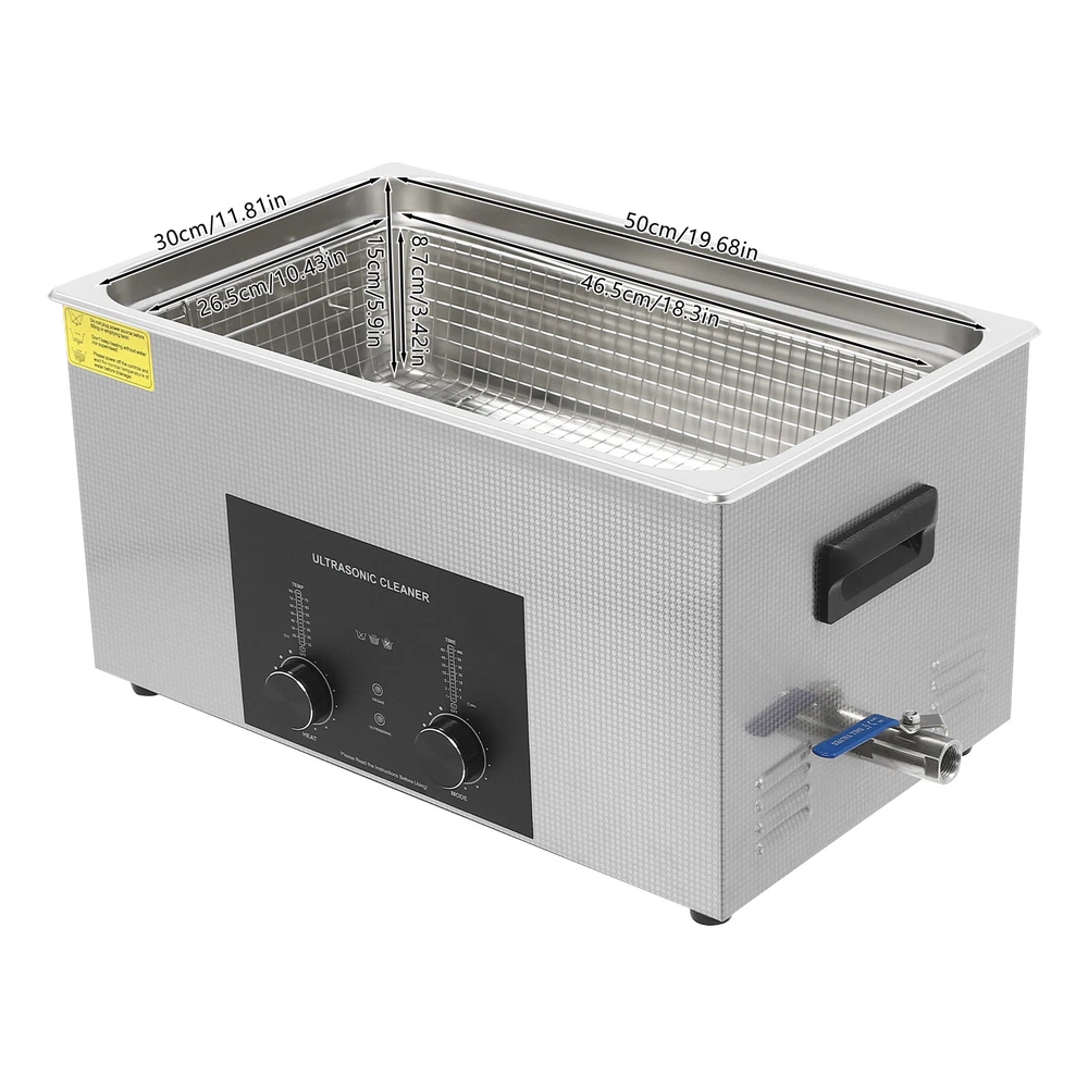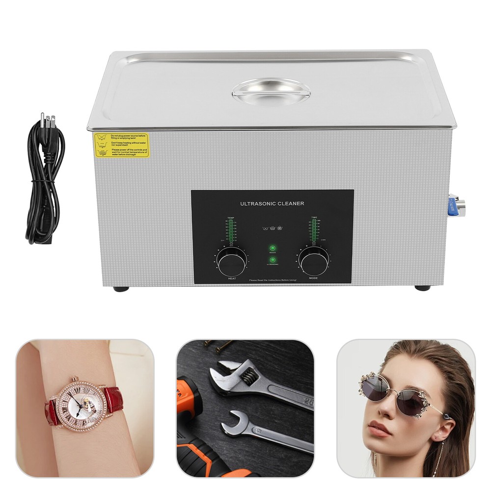 Specifications Color: Silver Style: Modern Shape: Rectangular Material: 304 Stainless Steel, 201 Stainless Steel Mount Type: Countertop Assembly Required: Yes Plug Type: US Standard Power Supply: AC100-120V, 60Hz Ultrasonic Frequency: 40Khz Ultrasonic Power: 480W Heating Power: 500W Power Cord Length: 1.5m/4.92ft Temperature Range: 15-80℃/59-176℉ Time Setting Range: 1-60min Inner Capacity: 22L/5.81Gal Effective Capacity: 17.5L/4.62Gal Drain Valve Diameter: 1/2" Product Inner Size: 50*30*15cm/19.69*11.81*5.9in Cleaning Basket Size: 46.5*26.5*8.7cm/18.3*10.43*3.43in Packaging Size: 66*42*35.5cm/25.98*16.54*13.98in Gross Weight: 12.47kg/27.49lbs Net Weight: 10.4kg/22.93lbs Package Included 1* Ultrasonic Cleaning Machine 1* Cleaning Basket 1* Power Cord 1* English Specifications Color: Silver Style: Modern Shape: Rectangular Material: 304 Stainless Steel, 201 Stainless Steel Mount Type: Countertop Assembly Required: Yes Plug Type: US Standard Power Supply: AC100-120V, 60Hz Ultrasonic Frequency: 40Khz Ultrasonic Power: 480W Heating Power: 500W Power Cord Length: 1.5m/4.92ft Temperature Range: 15-80℃/59-176℉ Time Setting Range: 1-60min Inner Capacity: 22L/5.81Gal Effective Capacity: 17.5L/4.62Gal Drain Valve Diameter: 1/2" Product Inner Size: 50*30*15cm/19.69*11.81*5.9in Cleaning Basket Size: 46.5*26.5*8.7cm/18.3*10.43*3.43in Packaging Size: 66*42*35.5cm/25.98*16.54*13.98in Gross Weight: 12.47kg/27.49lbs Net Weight: 10.4kg/22.93lbs Package Included 1* Ultrasonic Cleaning Machine 1* Cleaning Basket 1* Power Cord 1* English Manual Description This ultrasonic cleaner's high-frequency ultrasonic waves can delve into microscopic crevices, breaking down grease and stains adhering to jewelry, spectacles, tableware, braces, and other miniature, intricate items. It features a knob-type timer and temperature control design for a simple operation that simplifies cleaning tasks, bringing technological convenience to your daily life. Key Features Quality and Reliability : The product is made of 304 stainless steel and 201 stainless steel, which is resistant to rust, corrosion, and deformation, giving the product a long service life and excellent working performance. Efficient Cleaning: Different from other cleaning technologies, 40Khz ultrasonic technology can remove dirt on the surface of objects, and penetrate blind holes, and cracks, thus thoroughly cleaning the dirt that cannot be cleaned by hand without damaging your belongings. Moreover, the degas mode can eliminate ultrasonic fatigue and improve cleaning results. Adjustable Design: The product comes with knob-type temperature (59-176℉) and time control (1-60min) to meet the cleaning needs of different objects. Large Capacity: The 4.62gal effective capacity and large cleaning basket (18.3*10.43*3.43 inches) can easily hold and clean most of your watches, jewelry, and more. Efficient Heat Dissipation: The heat dissipation windows and the powerful cooling fan can accelerate heat dissipation, reduce failure rate, and increase service life. Safety Guarantee: The product is equipped with a fuse, when the circuit is overloaded, it will automatically fuse to stop the power supply, avoiding damage to the machine and injury to you. Simple Operation: Equipped with an intuitive and user-friendly operational interface, this product simplifies activation and adjustment of cleaning time and temperature settings, making it accessible to you. Easy to Clean: The fingerprint-resistant stainless steel shell, simple structure, and smooth surface make it more convenient for daily cleaning. Details Cleaning Basket: It can reduce scratches during cleaning to better protect your valuables items, and can also be used to drip-dry items. Side Handles: They make it convenient to move the machine. Drain Valve: It allows you to drain standing water and cleaning fluids more easily. Top Lid: It can well seal the machine to reduce heat loss and noise. Meanwhile, the handle on the top allows you to easily pick up the lid. Sturdy Feet: They prevent the product from sliding and enhance stability during operation. Application It can be used in homes, laboratories, the jewelry industry, industry, electrical industry, hospitals, and more. It is specially used for cleaning jewelry, eyeglasses, watches, dentures, dental instruments, clocks and watches, motorcycle parts, automobile parts, bicycle parts, hardware, tools, engine parts, and more. Notes Please check the size carefully before ordering. Please note that the heating is turned on when the preset temperature is higher than the actual temperature. Please note that the ultrasonic cleaning process can also slowly heat the cleaning liquid, so the temperature of the cleaning liquid is likely to be higher than the preset temperature. 304 stainless steel material makes the device resistant to weak acids and weak alkalis. However, please don't use strong acids or strong alkali. Please do not place items directly on the bottom of the cleaning tank and please put items into the washing basket for cleaning. It needs to be filled with 2/3 of the water and please avoid dry-burning. Please read the operating manual and label completely before use. And pay particular attention to the safety instructions included. Please allow the slight color difference caused by the shooting light and 1-3cm error due to manual measurement, and make sure you do not mind before you order. Payment Delivery details Terms of sales About us Contact us Payment We accept ebay payment 。 Fees such as import duties, taxes are not included in the item price or shipping costs. These charges are the buyer's responsibility. Delivery details Shipping: 2-9 working days to: USA Terms of sales We maintain high standards of excellence and strive for hundred percent customer satisfaction. Feedback is very important to us. We hope that you contact us immediately before you give neutral or negative feedback, so that we can address your concerns. It is impossible to address i