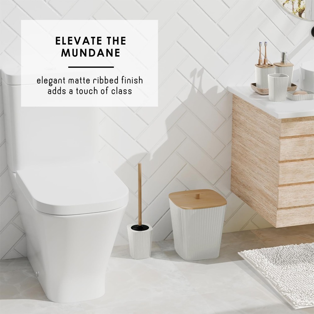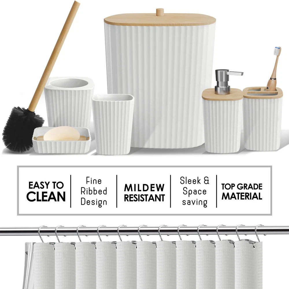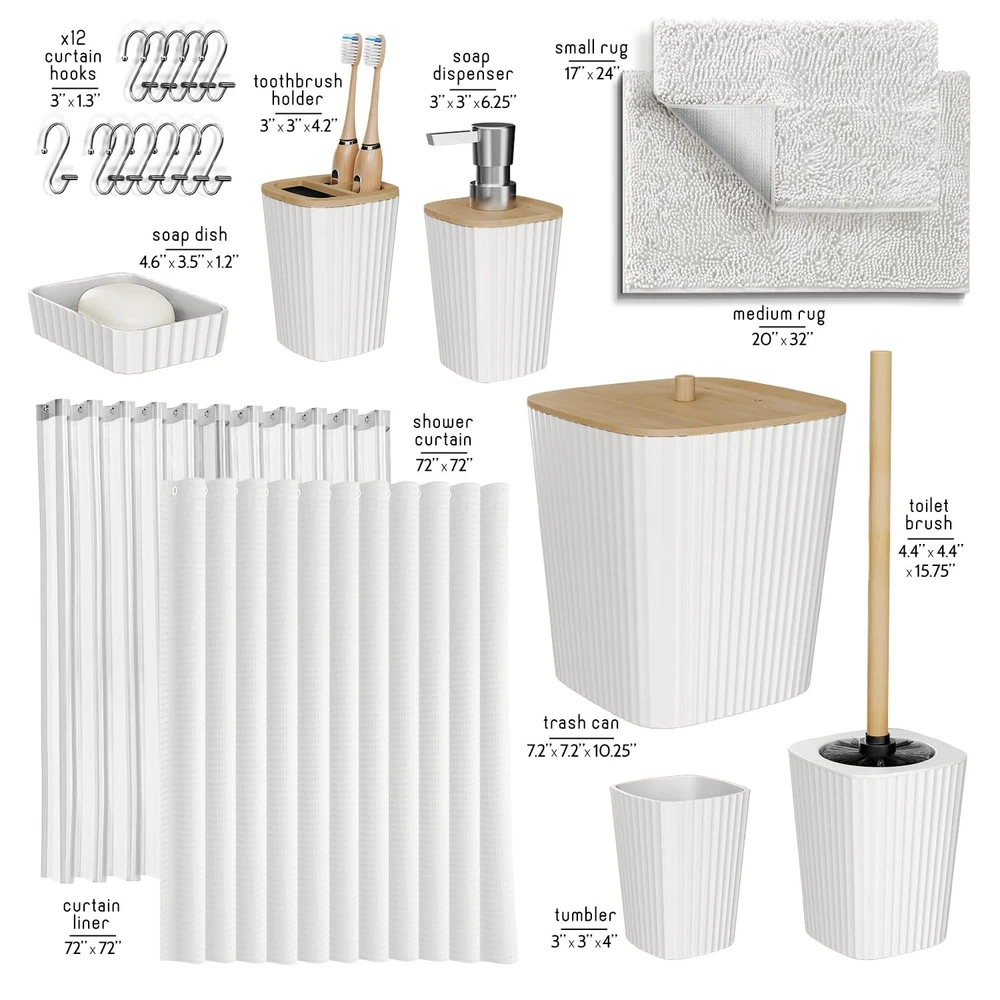 White Bathroom Accessories Set: Update your bathroom set with White bathroom decor, creating a stylish haven with a White bathroom rug set and bathroom accessory set. Bathroom Sets with Shower Curtain and Rugs: Includes 2 bathroom rugs, toothbrush holder, tumbler, soap dispenser, soap dish, bathroom trash can, toilet brush and holder set, 12 shower curtain hooks, and fabric shower curtain set with clear shower curtain liner. Boho Shower Curtain with Shower Liner: Shower curtain with hooks includes a clear shower curtain liner with weighted magnets at the bottom to keep it in place, and 12 rust-resistant shower curtain rings. White Shower Curtain: Shower curtains for bathroom measure 72” x 72”; made of durable, -resistant polyester with a waffle texture, and reinforced hook holes. 2 Bath Mats for Bathroom, Non Slip: Each chenille bath rug is super soft and highly absorbent, with non-skid backing. White bathroom rug set: Small 17”x24”; Large 20”x32”.