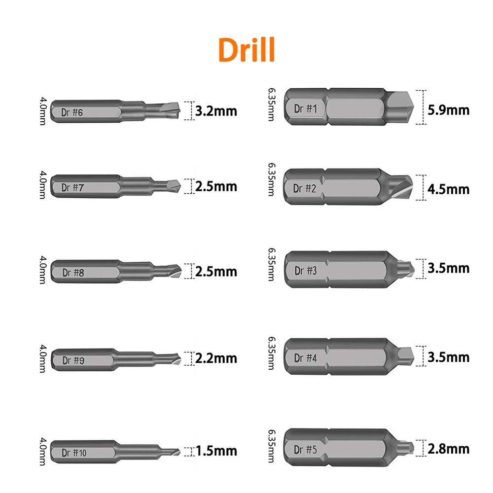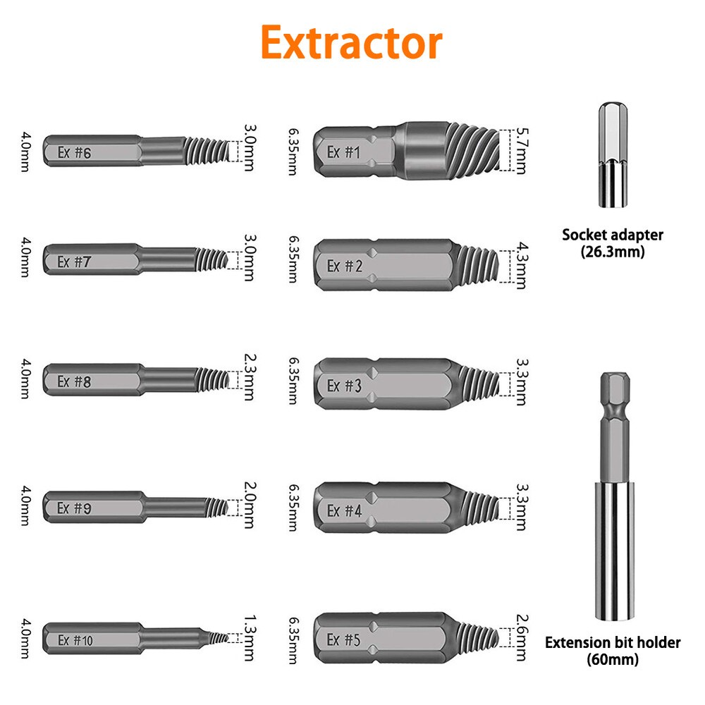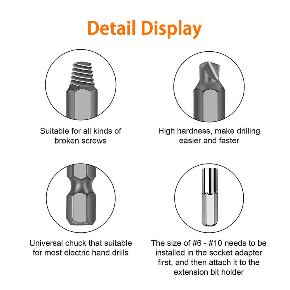 Look , You may also like 12Pcs HSS Hex Shank Drill Bits Tap M3-M10 Metric SAE Screw Thread Drill Bits Set 16.07 USD Free shipping 20Pcs Screwdriver Bits Titanium Coated 1/4" Hex Shank Phillip Head PH2 Anti Slip 10.01 USD 4.59 USD Magnetic 1/4"Hex Shank Drill Bits Set Anti Slip Cross Head Impact Screwdriver 9.96 USD Free shipping 6/12PCS Damaged Screw Extractor Se Extractor Speed Drill Bit Broken Bolt Remover 8.6 USD 1.59 USD 22PC Drill Bait Damaged Screw Extractor Steel Screw Socket Set Bolt Removal 14.22 USD Free shipping Black Tile Drill Bit Set YG8X Cemented Carbide Tip 3/4/5/6/7mm 1/4" Hex Shank 9.67 USD 2.99 USD 10/20Pcs 1/4'' Hex Shank Magnetic PH2 Screwdriver Drill Bit Anti-slip Hand Tool 8.89 USD Free shipping 5Pcs 3/4/5/6/7mm Drilling Bit 1/4" Hex Shank Carbide Tile Metal Drill Bit Set 9.8 USD 2.99 USD 6pcs Damaged Screw Extractor, Stripped Screw Broken Drill Remover Tool Kit US 8.4 USD 1.59 USD Set of 12pcs Damaged Screw Extractor Broken Screws Bolt Stripped Remover Tool 12.39 USD Free shipping 6/12pcs Damaged Screw Extractor Speed Out Drill Bit Tool Set Broken Bolt Remover 7.87 USD 1.59 USD 10/20pcs Magnetic Drill Bits 1/4" Hex Shank PH2 Cross Head Impact Screwdriver 8.2 USD 0.99 USD 22Pcs Damaged Stripped Screw Extractor Set for Broken Screw Magnetic Drill Bit 22 PC Damaged Stripped Screw Extractor Set for Broken Screw, All-Purpose HSS Broken Bolt Extractor Screw Remover Set with Magnetic Extension Bit Holder & Socket Adapter Features: 1. Screw extractor is made of high quality High-Speed Steel 4241. High hardness, durable and easily remove damaged screws 2. The stripped screw extractor set is included two extension bit holder. Can remove in one step, do not need to conversion the extractor or adjust the chuck 3. The stripped screw extractor kit is includes 20 pieces of stripped screw extractor in 10 different sizes to satisfy all you demand. Suitable for any sizes screw or bol 4. Suitable for allen bolts, machine screws, lag bolts, wood screws, hex bolts, sheet metal screws and other screws 5. It is best to use electric hand drill, can not be used the hammer drill mode! Must be low speed during use! Specifications: High-Speed Steel 4241 Suitable for general sizes and all kinds of broken bits Universal chuck that suitable for most electric hand drills Remove broken screw in one step How to Use the Screw Extractor? 1. The size of #6 - #10 needs to be installed in the socket adapter first, and then attach it to the extension bit holder (The other sizes can be attached to the extension bit holder directly) 2. Use the drill(Dr) bit to drill a hole in broken screws 3. Change to use the extract(Ex) bit with the same size 4. Reverse use the drill and take out the broken bit Warm Tips : 1. Must drill a hole first when the break screw surface is smooth. Otherwise the drill bit will slip 2. Must be vertical and low speed when drilling, reverse use this bit, drill the first hole deeper will easier to take out 3. It is best to use electric hand drill, can not be used the hammer drill mode! Must be low speed during use! Package Included: 20* damaged screw extractor 1*Magnetic Extension Bit Holder 1*Socket Adapter Note: 1. Please allow a bit error due to manual measurement. please make sure you do not mind before you bid. 2. The color may have different as the difference display, pls understand.