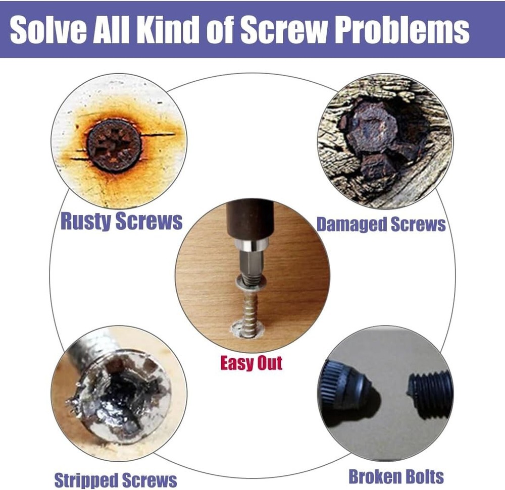 Yakamoz 22Pcs Mini Damaged Screw Extractor Kit Small Stripped Screws Remover Easy Out Broken Bolt Extractor Rusty Screw Removal Tool with Magnetic Extension Bit Holder & Socket Adapter Description Multiple Sizes - Includes 22pcs and composed of 10 different sizes of drills and extractors which makes it compatible with all kinds of drills and remove any type of screws and bolts. Effortless Screw Extraction: - Stripped screw extractor with spiral design enhances grip and minimizes slipping can remove damaged, stripped, or rusted screws and bolts effortlessly. Easy to Use - Choose a drill bit smaller than the damaged screw to drill a hole first. Then attach the extractor to your drill, apply moderate pressure, and watch as the damaged screw loosens and comes out. High Quality - These damaged screw extractor made of High-Speed Steel 4241 for maximum strength and high hardness, remove the broken or rusting screws easily. Must-Have Tool - Ideal for handyman, woodworker or fitment worker, provides an extractor bit to remove all common sizes of damaged, stripped or broken screws.